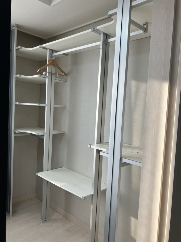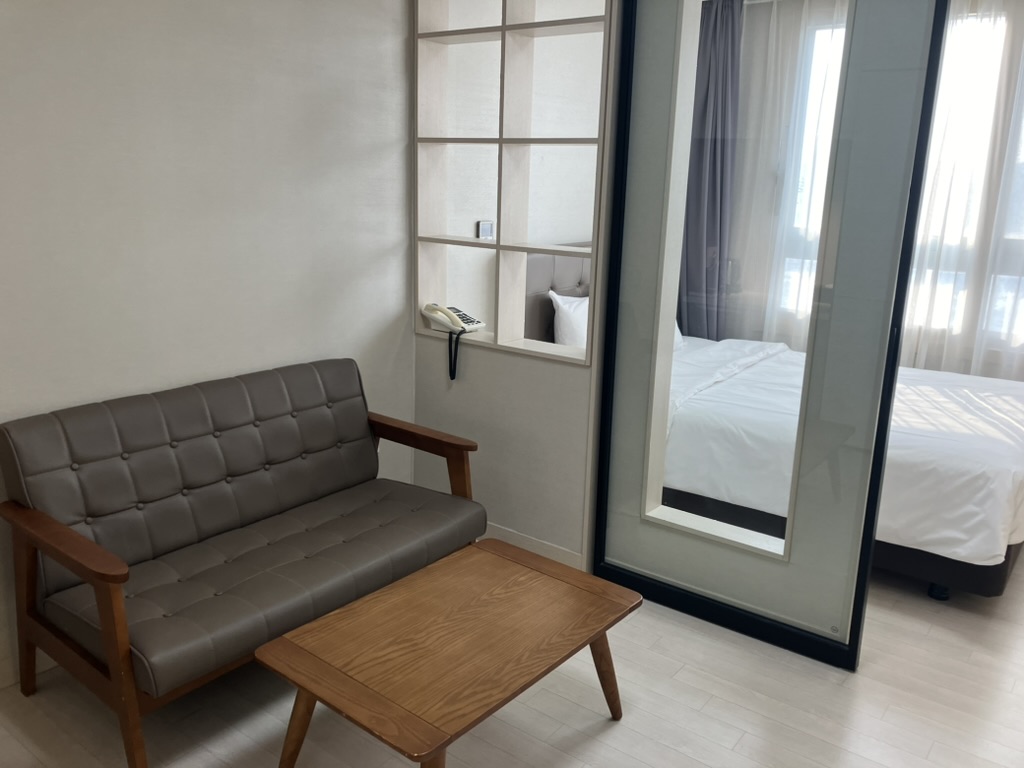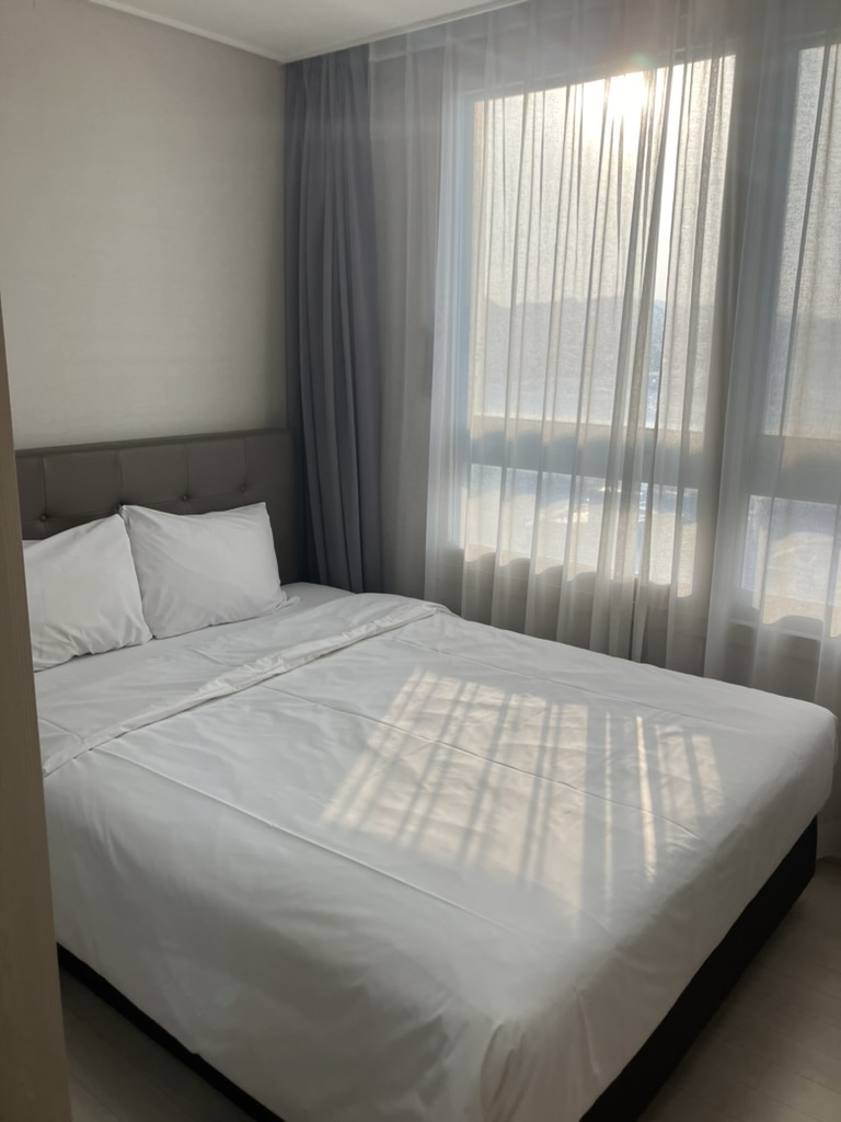 이곳의 침실은 참 이상한 구조인데 중문이 있지만 중문을 왜 달아 놨는지 모르겠는 구조로 유리문을 닫아도 뚫려있다. 그리고 침대 바로 앞에 행거가 있는데 이 시스템 헹거는 유용하긴 하나.. 이마저도 구조가 이상해서 그렇게 많은 내용물을 걸기는 쉽지 않다. 매트리스의 경우에는 그렇게 좋지 않기 때문에 허리가 아플 수 있지만 하이원 메이힐보다는 괜찮다고 할 수 있다.