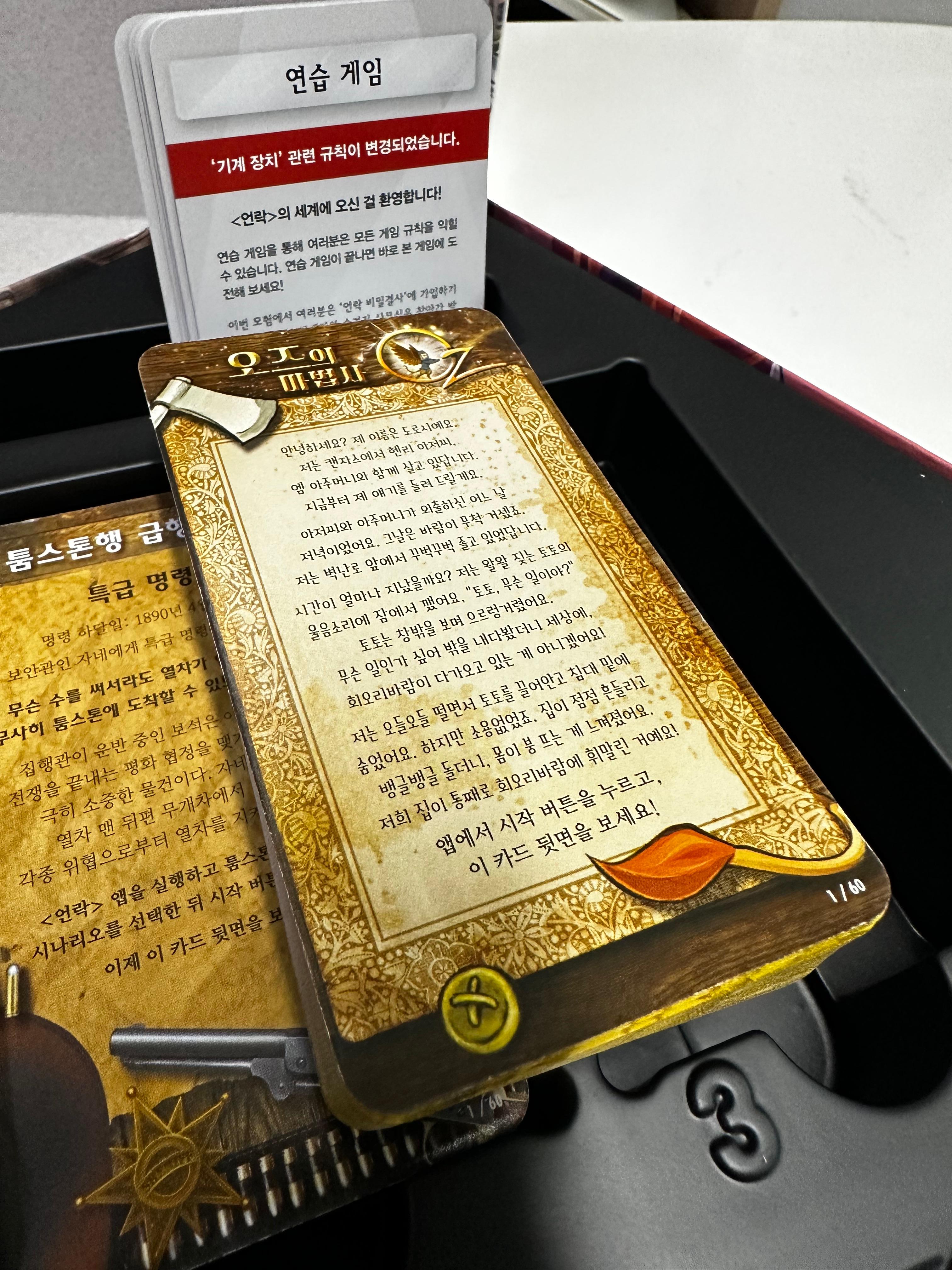 저번 언락! 2에서는 새로운 기믹중 하나가 카드를 사용해서 새로운 맵을 만드는 것이었다. 꽤나 신박했는데 프린팅의 상태에 따라서 약간의 문제가 될 수 있다는 것을 제외하고는 아이디어가 참 좋았다고 할 수 있다. 그리고 이번에는 아예 맵과 보드판을 제공하는데 맵의 경우에는 오즈의 마법사 시리즈에 사용을 하고 보드에 구성품은 오즈에 마법사 시나리오와 서부극의 시나리오에 각각 사용하는 구성품이다.