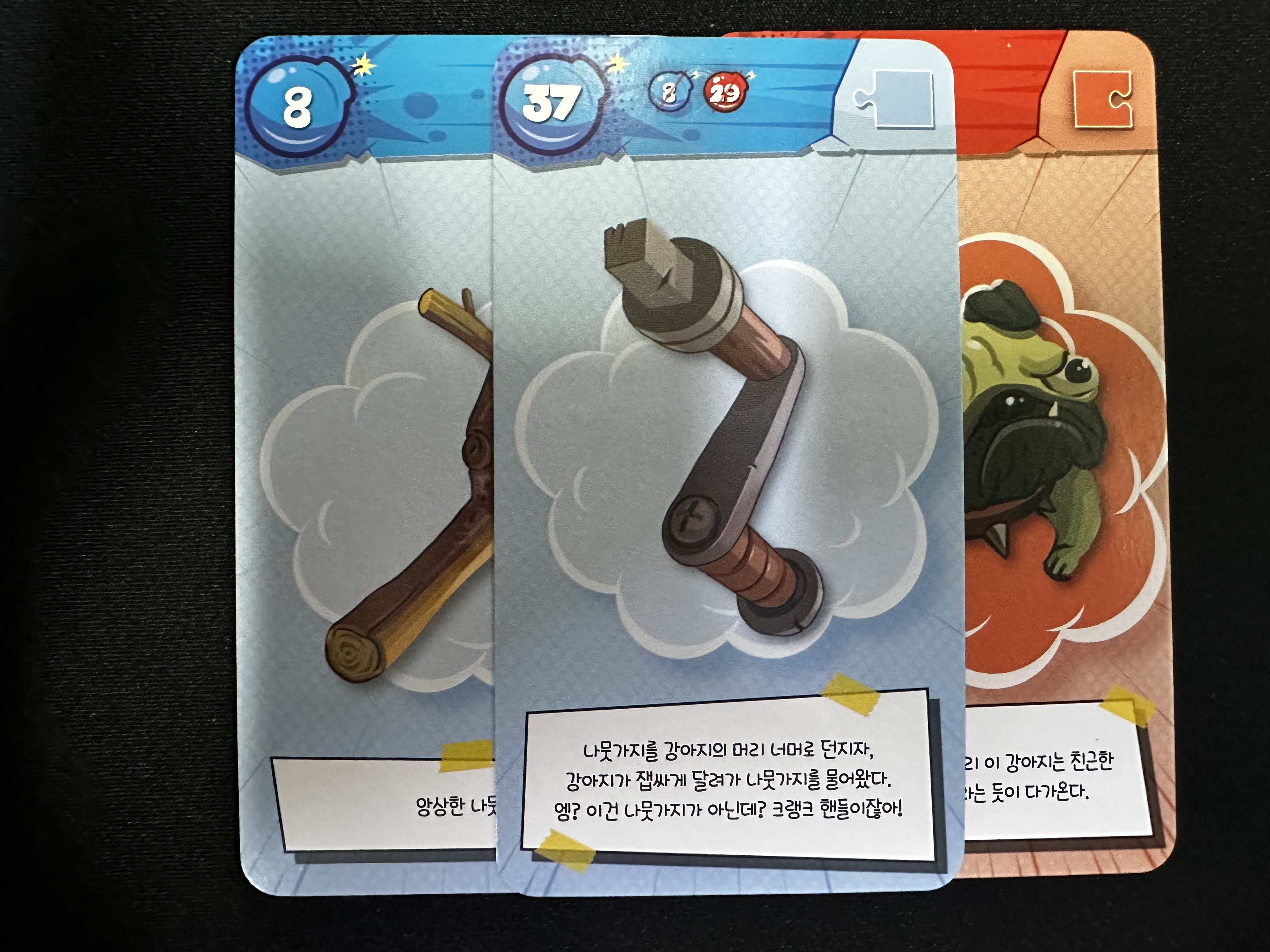 1) 놀아달라는 강아지(29번)에게 나뭇가지(8번)를 주어 핸들(37번)을 구해야 한다.