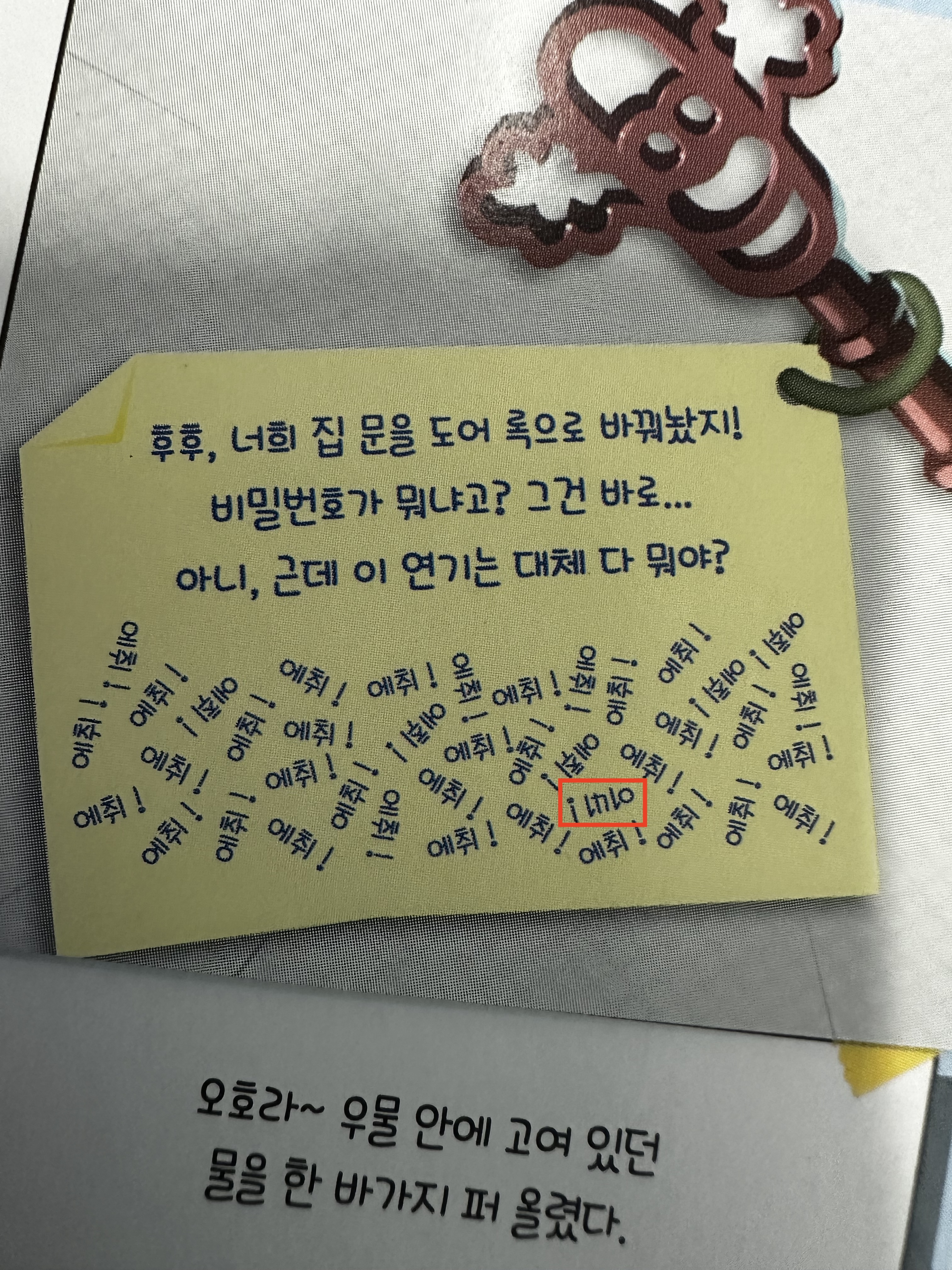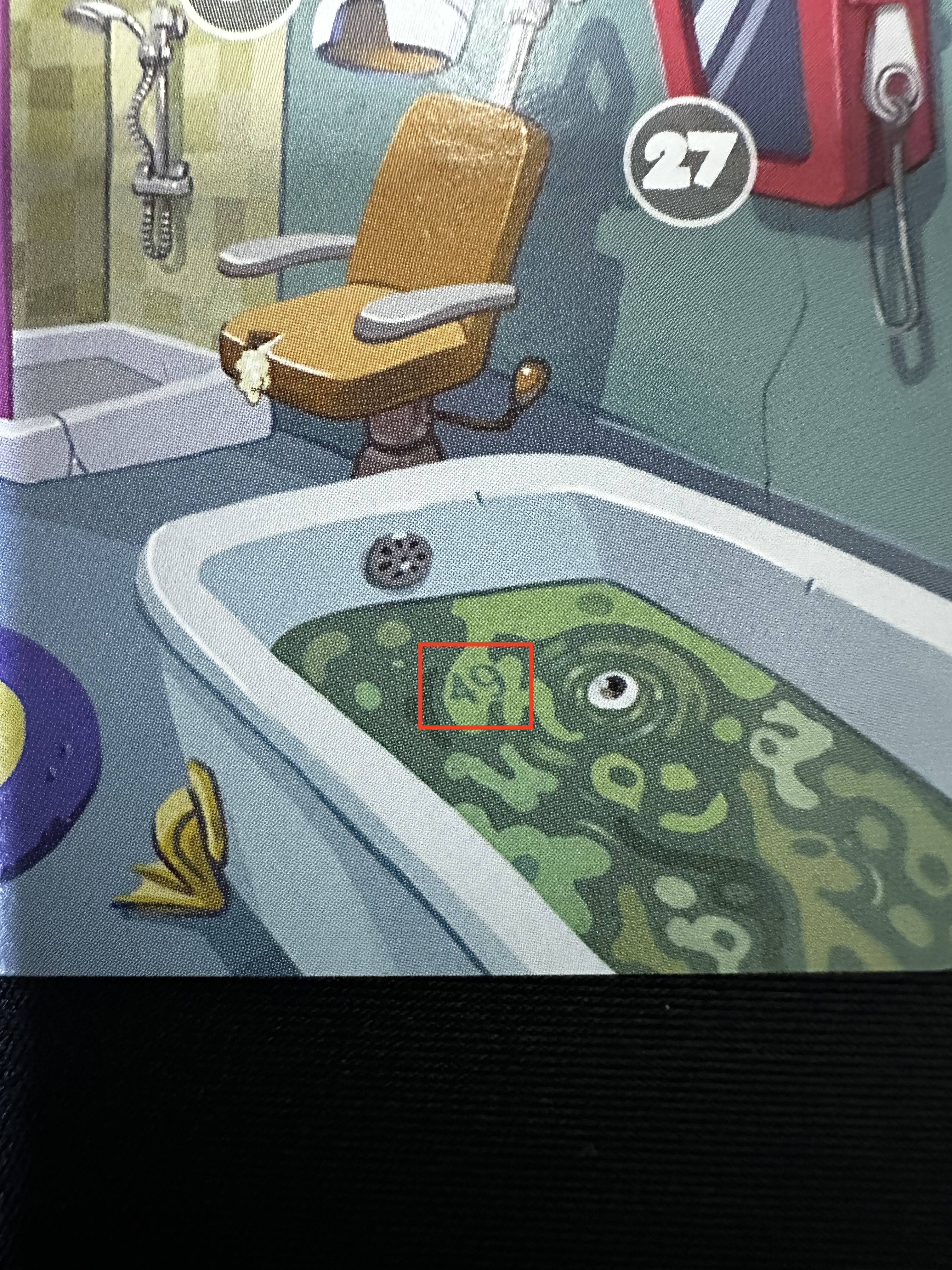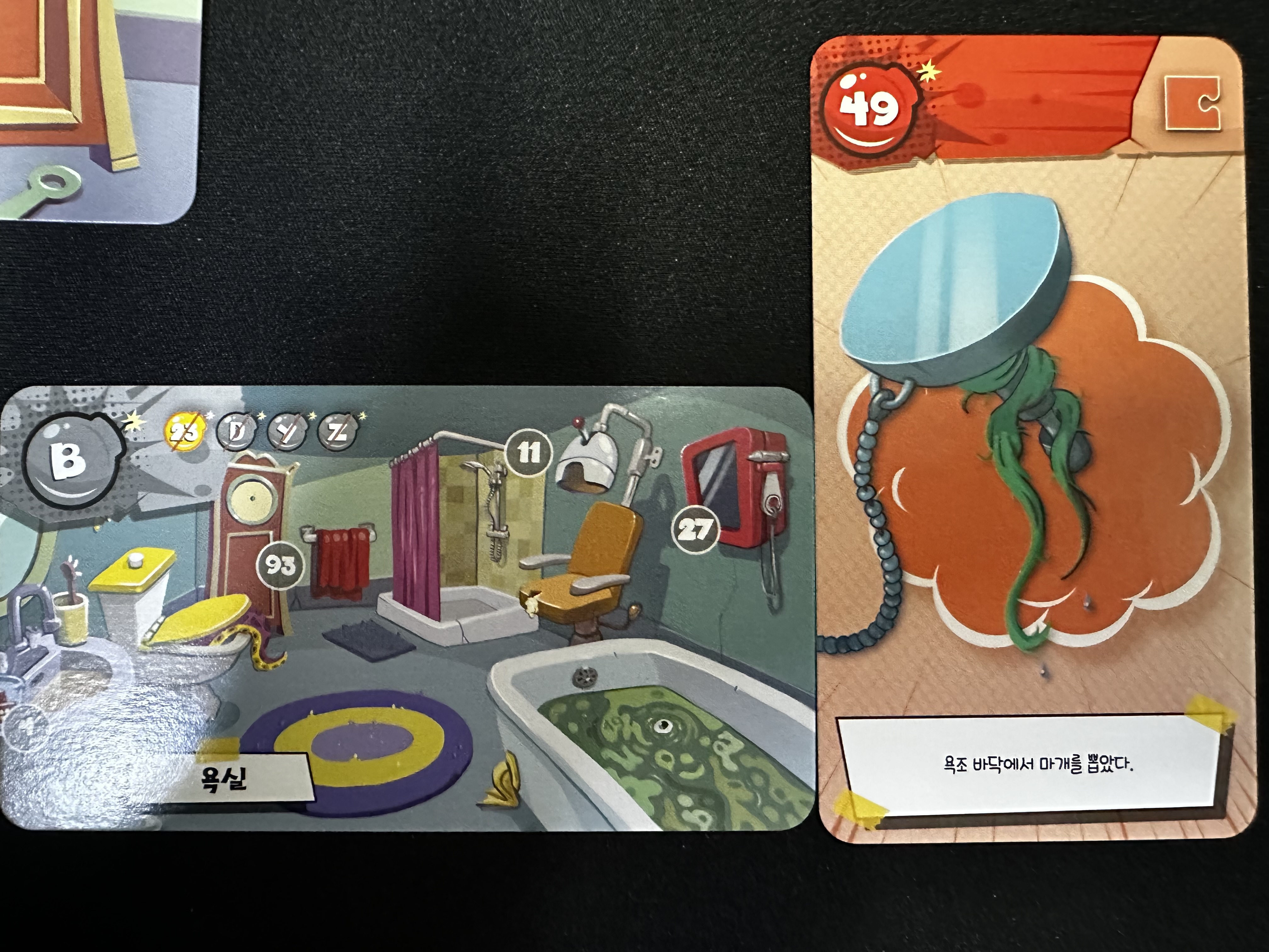 18번 카드를 꺼내면 드디어 연기의 근원지인 콜록 머신이 나온다 하지만 아직 이 콜록 머신을 끌 방법이 없다. 그러면 이제 또 다른 카드를 찾아야 하는데 이 카드는 욕실에 베스텁에 초록색 액체 안에 숫자를 찾으면 된다.