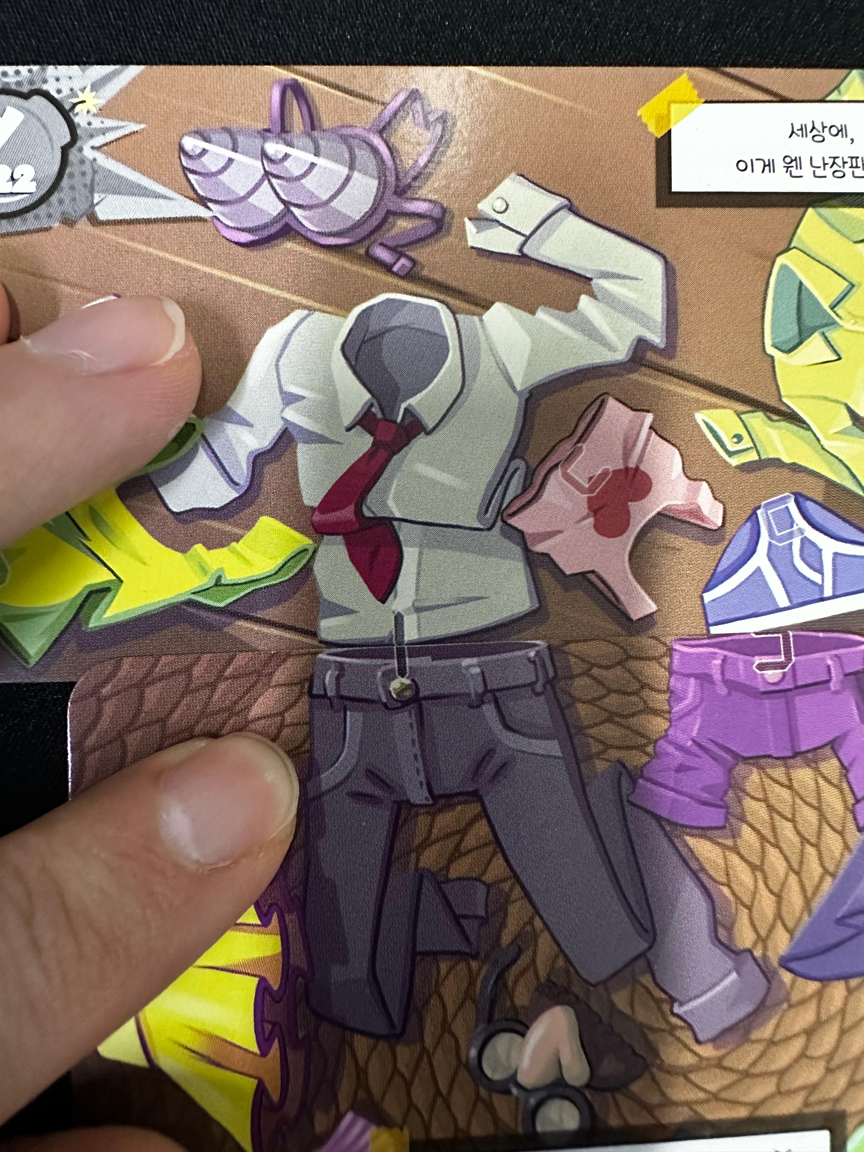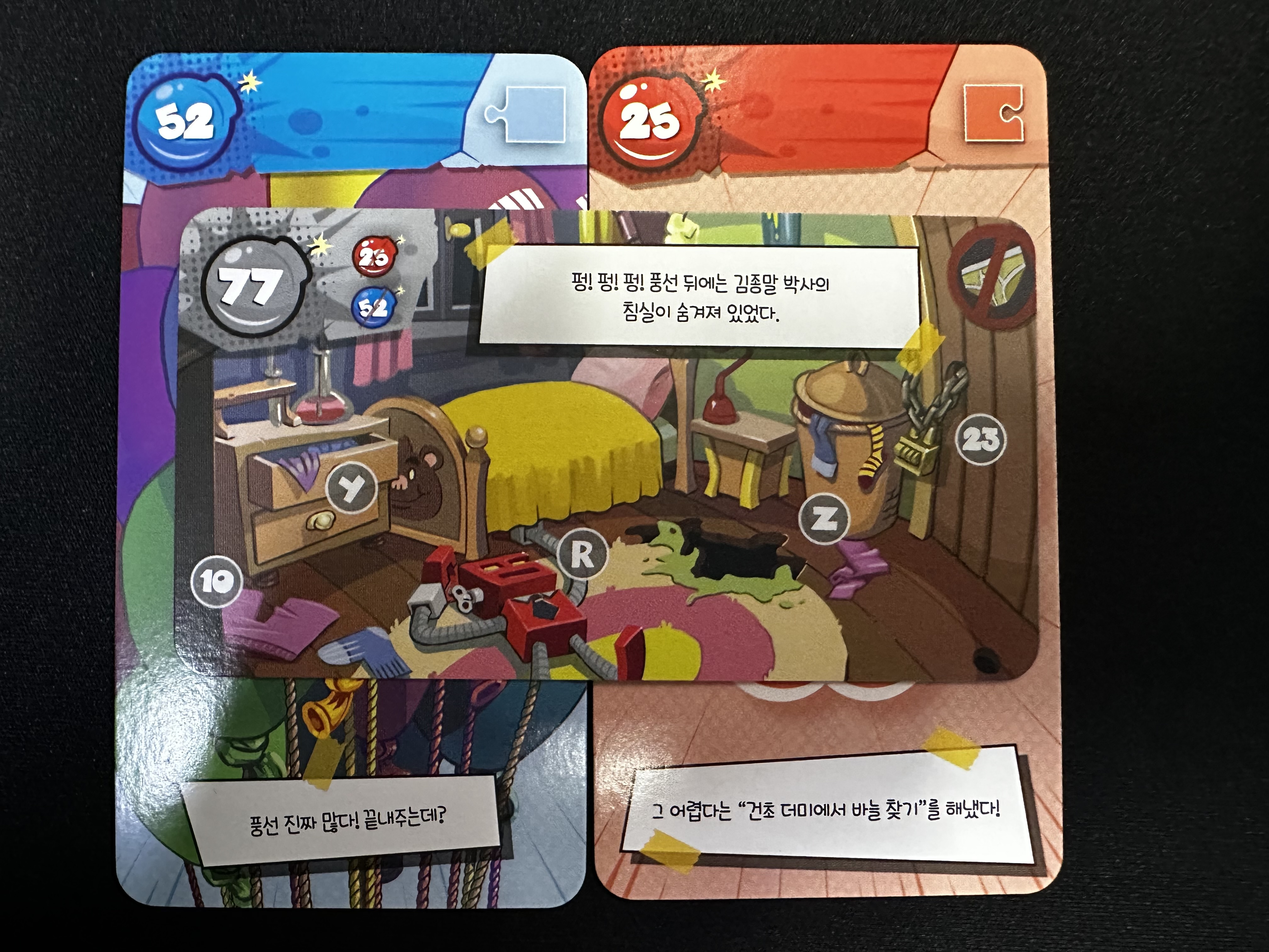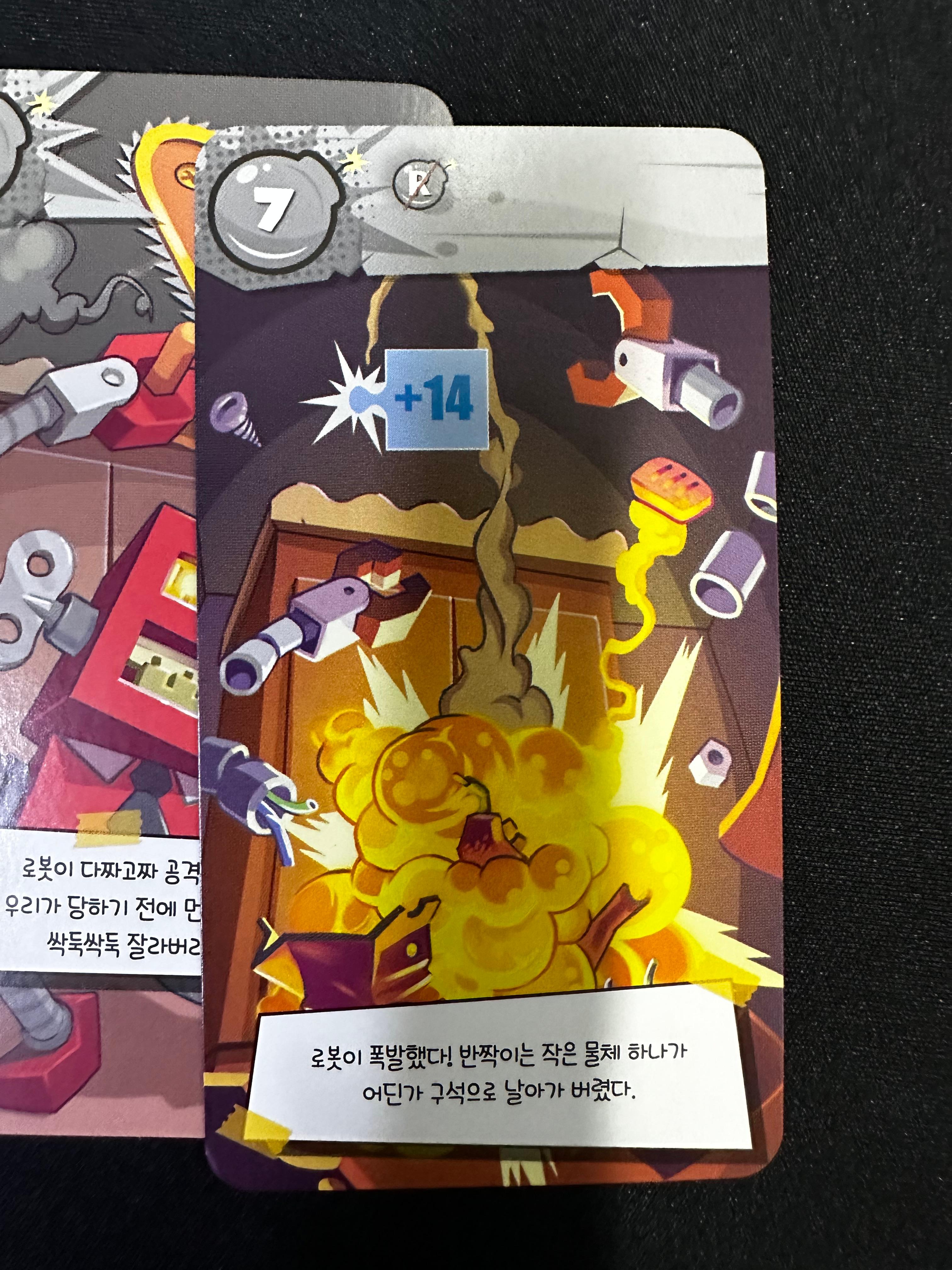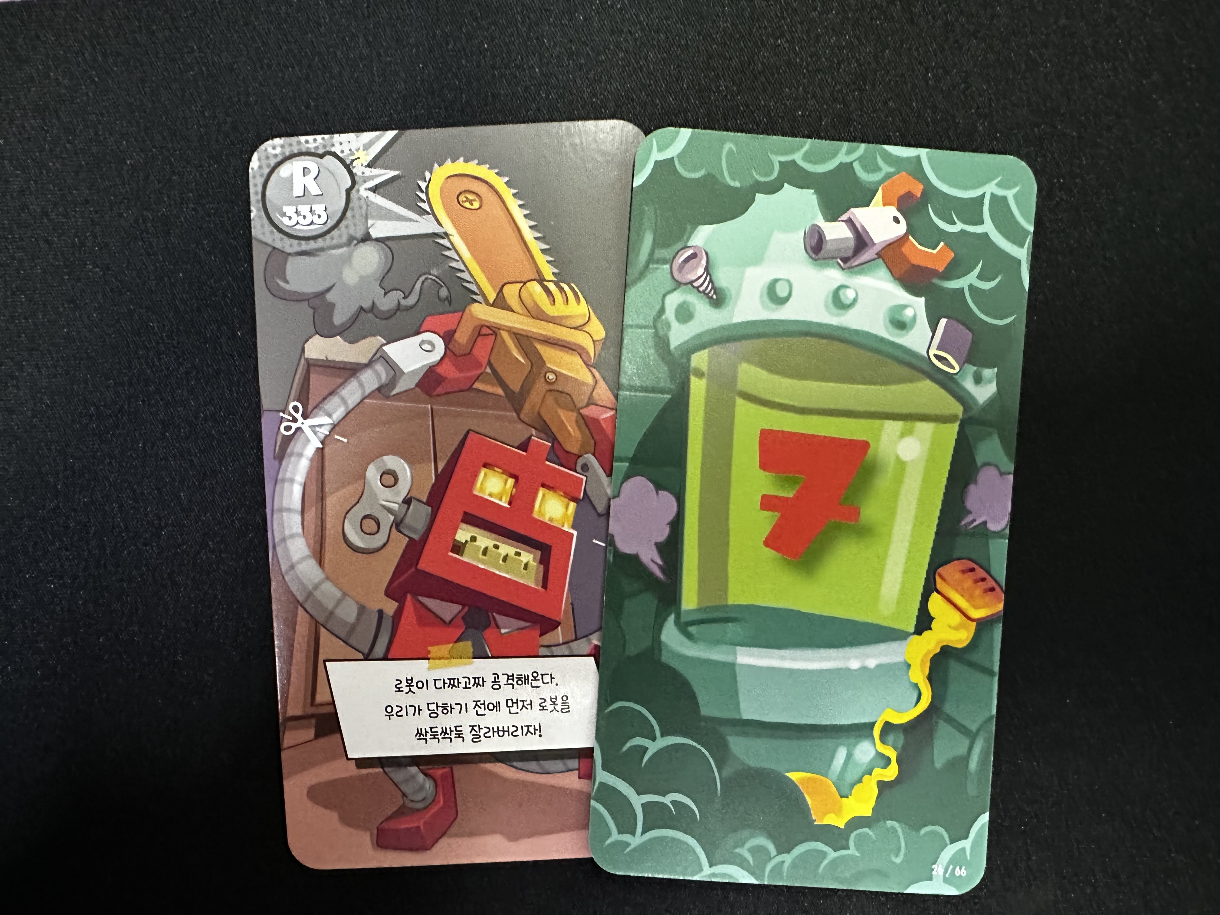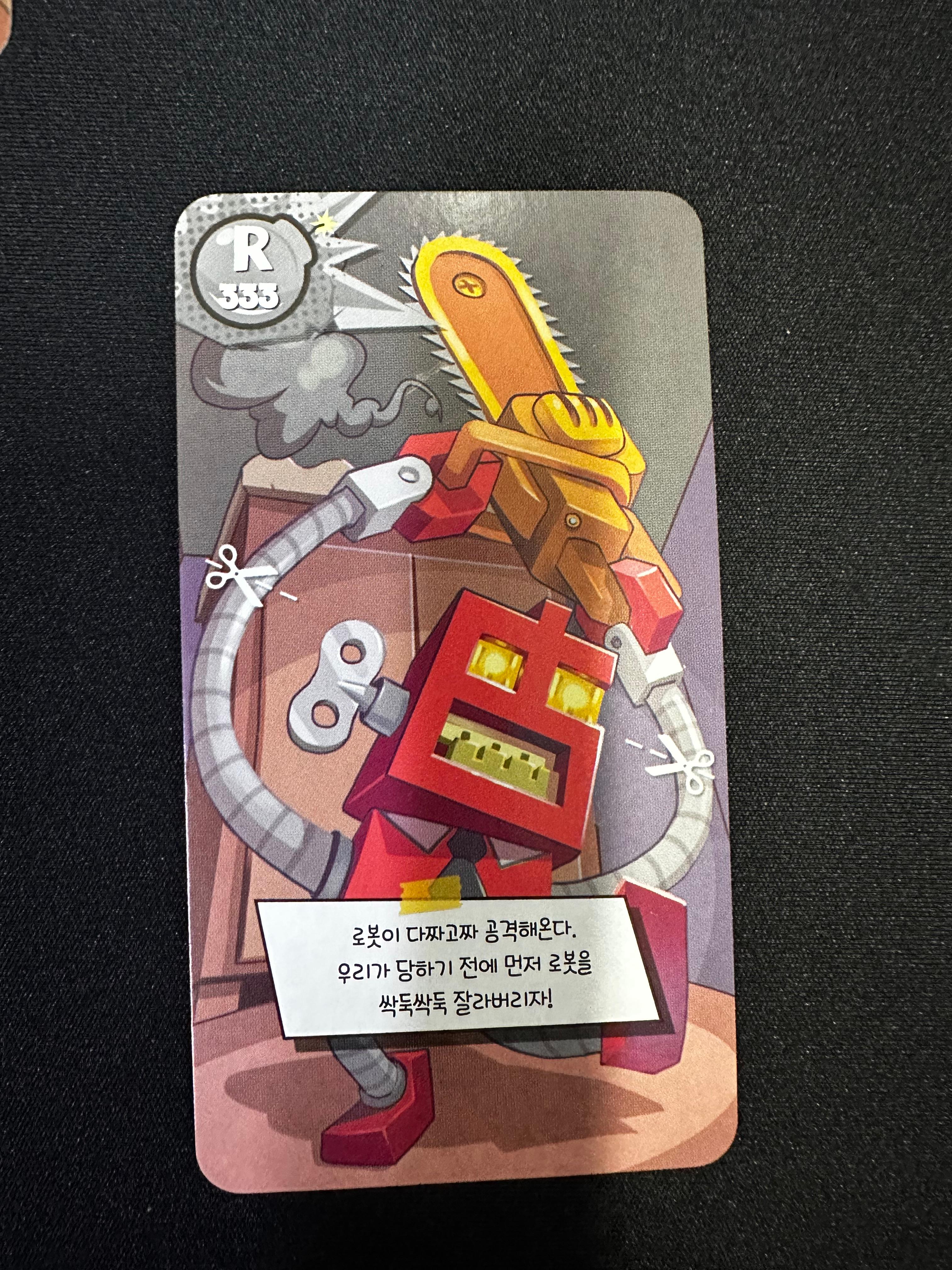 방에 들어가면 갑자기 로봇이 공격해 온다. 이 로봇을 잘 살펴보면 팔 쪽에 가위 모양이 있는데 이 가위 모양에 카드를 잘 대보면 붉은 숫자(7번)가 보인다. 그리고 혼동이 될 수 있어서 카드 중에 7번 카드만 붉은색으로 표시가 되어있는 것을 볼 수 있다.