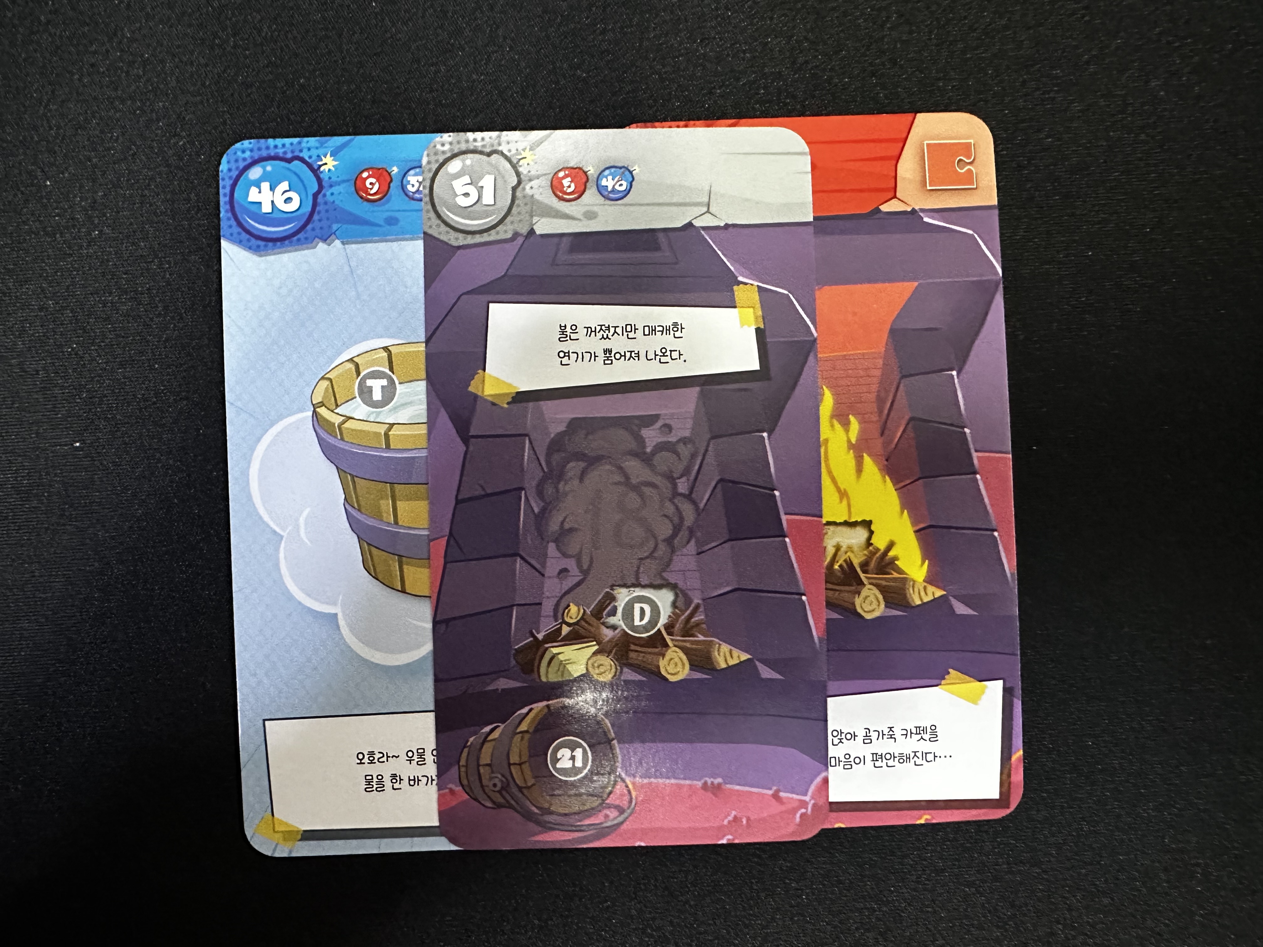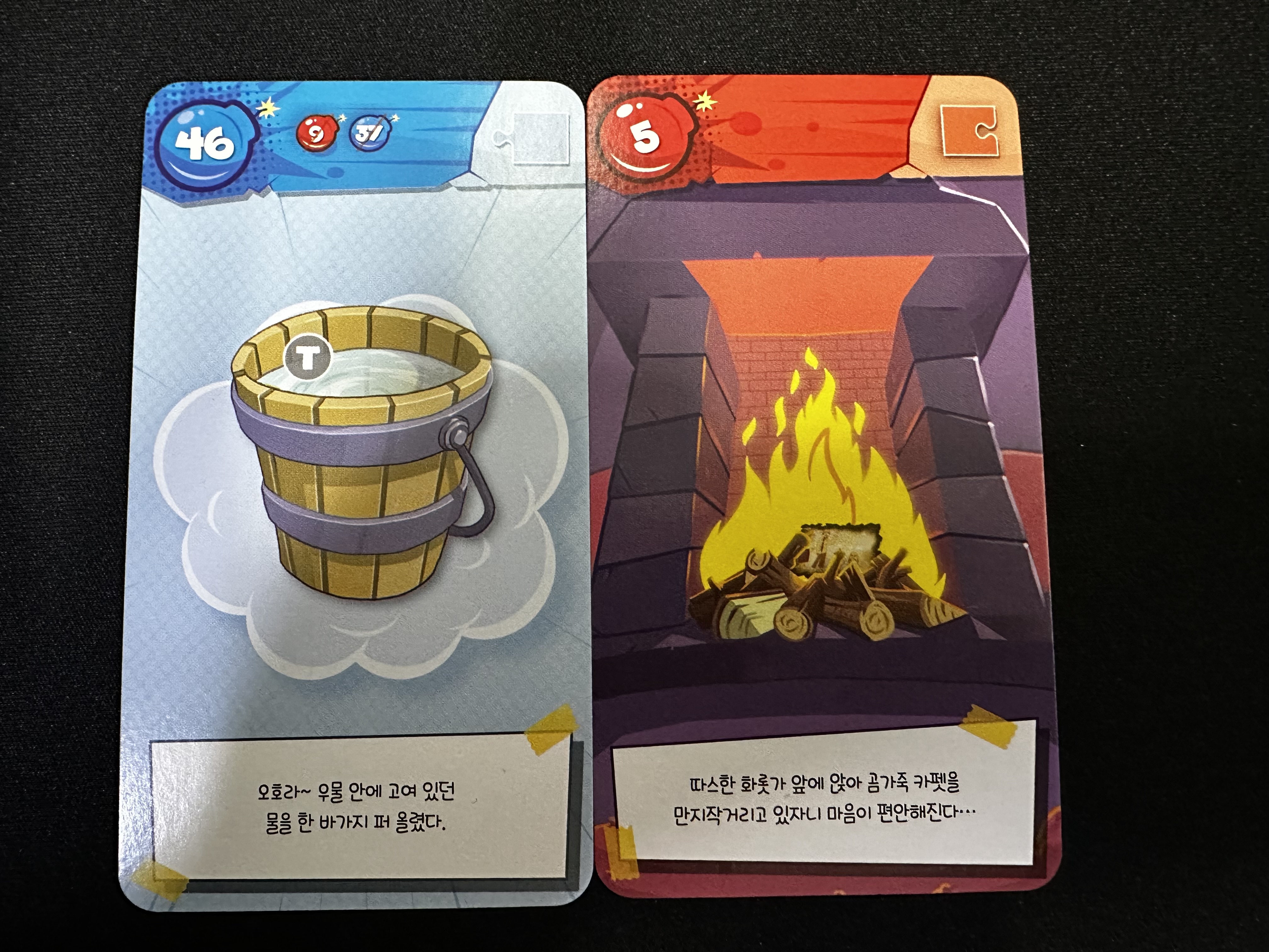 1) 거실(X카드)에 있는 화롯가(5번)에 불타고 있는 무언가를 꺼내기 위해 물이 담긴 양동이(46번)를 조합해야 한다.