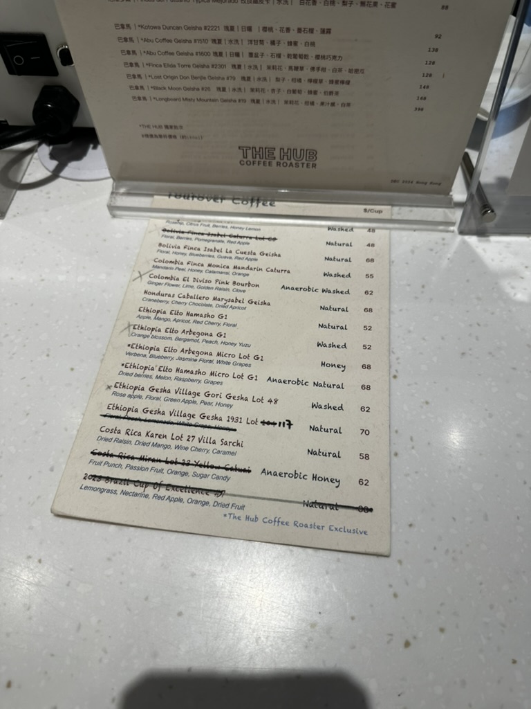 그래도 다른 커피들은 48달러에서 70달러까지 비교적 비싸지 않은 가격이 즐길 수 있다. 물론 이마저도 한잔에 거의 만원 하는 커피라고 할 수 있지만 아쉽게도 이 정도면 홍콩의 미친 물가에 비해 비교적 합리적이라고 할 수 있다. 그래서 Honduras Caballero Marysabel Geisha 한잔과 Ethlopia Ello Arbegona Micro Lot G1 한잔을 시켰다.