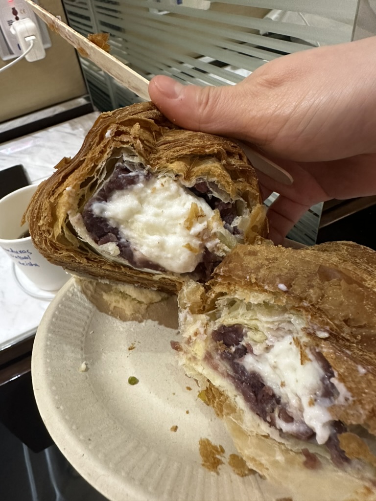 우선 찹쌀떡이 들어있는 크림의 경우에는 팥과 크림이 같이 들어있어서 파리바게트에 있는 단팥 생크림 빵과 비슷한 느낌이 들었다. 하지만 크로와상이기 때문에 더 바삭한 겉 표면이 식감적으로 채워주고 그리고 안쪽에 있던 찹쌀떡이 쫀득함까지 잡아줘서 맛있었다. 물론 조금 과하다는 생각을 하긴 했다. 그리고 단맛이 꽤 있기 때문에 정말 디저트류에 가까운 빵이었다. 그 의미는 아침부터는 조금 어렵다는 것이다.