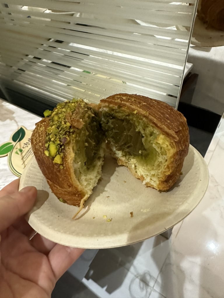 그리고 피스타치오크림이 들어간 크로와상의 경우에는... 솔직히 별로였다. 일단 크림 자체가 너무 뻑뻑해서 떡같이 되었다. 물론 바로 먹었으면 이런 굳는 현상이 안 생겼을 수도 있겠지만 아쉽게도 바로 받았을 때에도 약간 묵직한 느낌이 있었는데 아마도 필링 자체가 그렇게 부드러운 느낌은 아니었을 것 같다. 리뷰를 찾으면 피스타치오 크림이 들어간 타르트는 아주 묽다고 했는데 둘의 크림이 좀 다른 것일 수도 있다. 그리고 이 피스타치오 크림의 가장 큰 문제는 과하다는 점이다. 빵에 비해 크림이 너무 많아서 크림을 먹는 것인지 아니면 빵을 먹는 것인지 분간이 안 갈 정도였다고 할 수 있다.