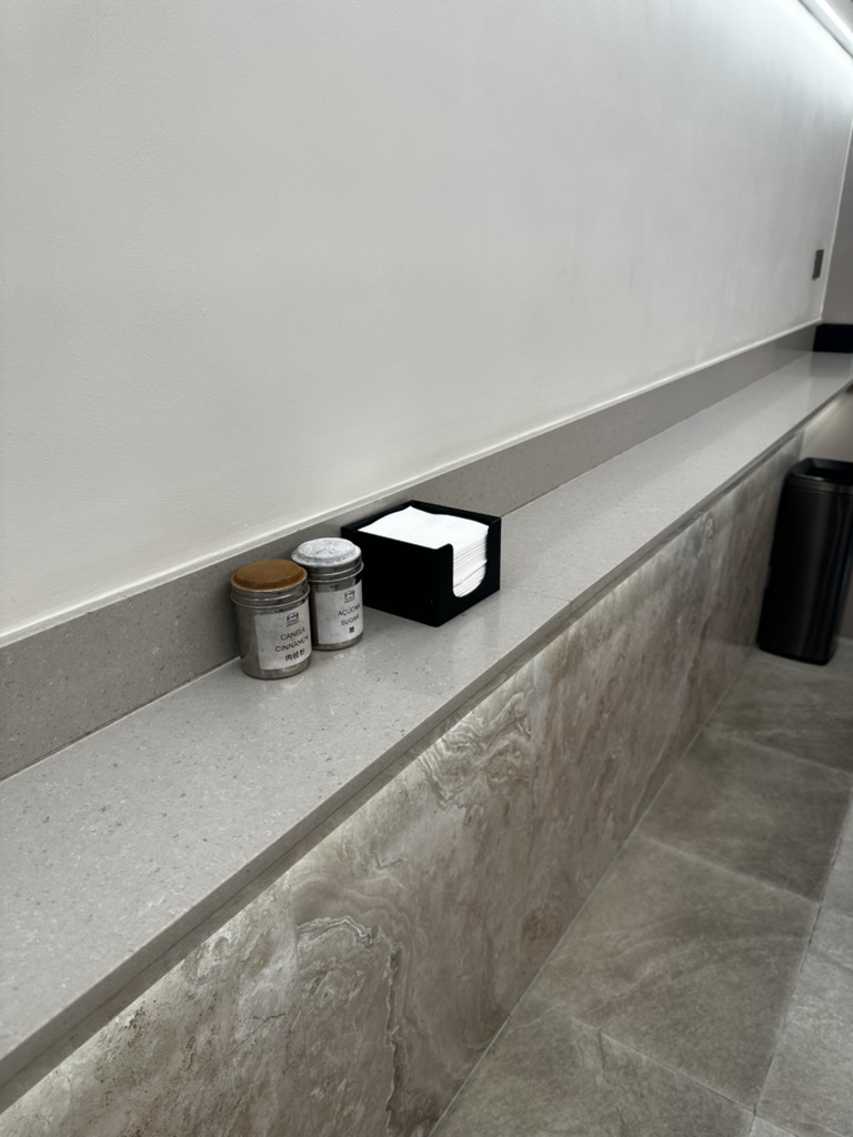 매장 안에 주방이 보이는데 주방에서 계속해서 에그타르트를 만들고 있는 모습을 볼 수 있었다. 그리고 앉아서 먹을 곳은 없지만 간이로 벽에 있는 선반 같은 곳에서 서서 먹을 수 있다. 그리고 포르투갈식으로 시나몬 가루와 슈가파우더가 있어서 기호에 맞게 뿌려먹을 수 있게 되어있다. 그리고 홍콩과는 조금 다르게 휴지가 있는데 무료로 사용이 가능하다.