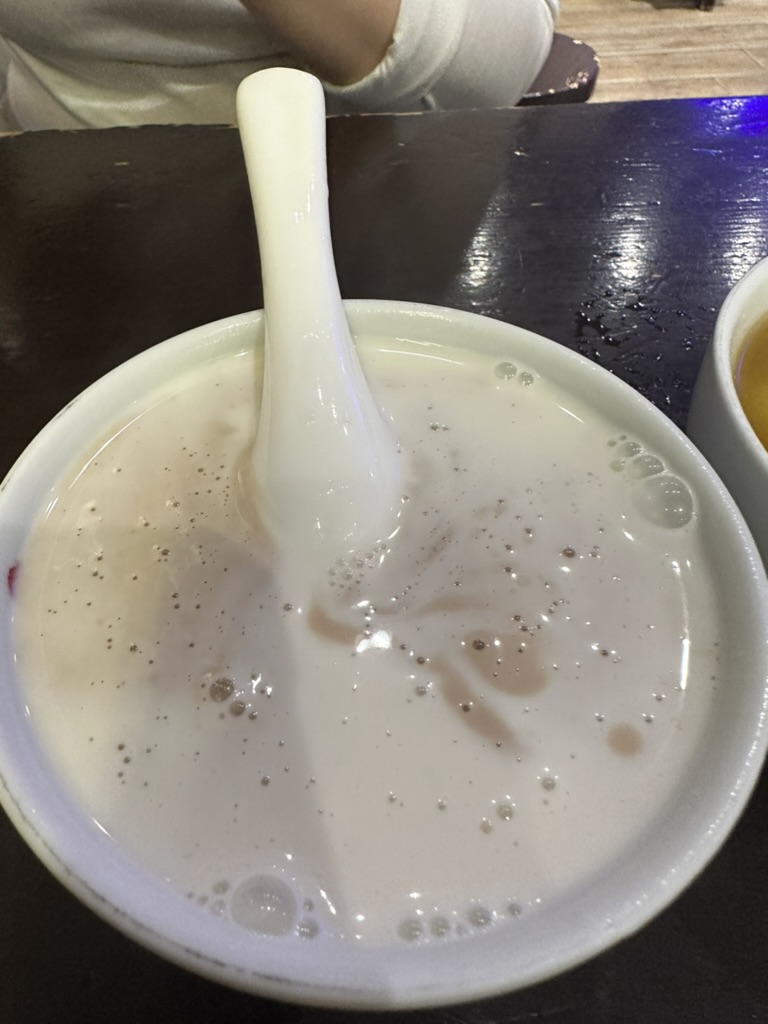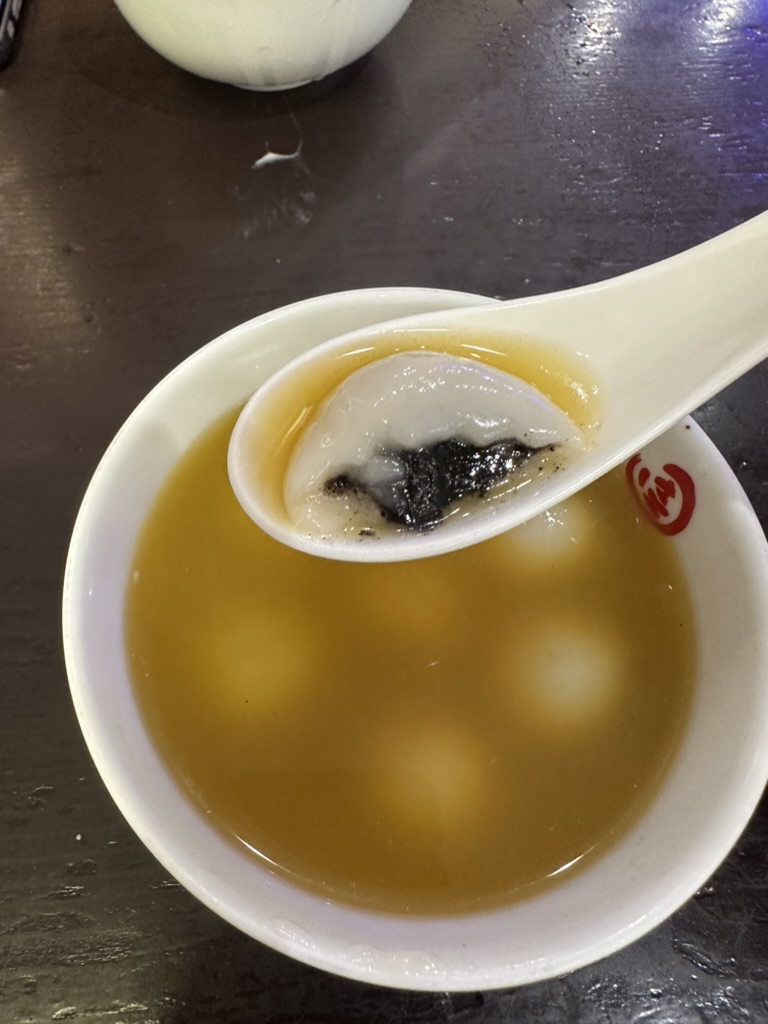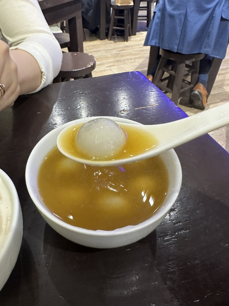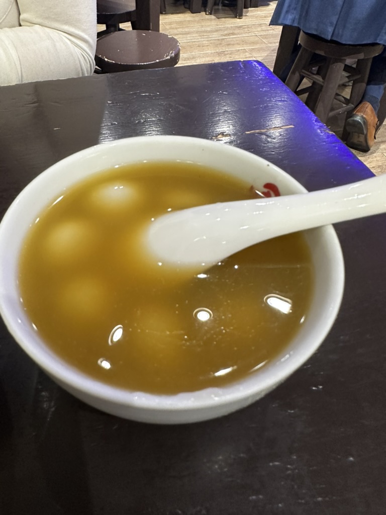 사람들이 꽤나 많이 줄을 서있었는데 생각보다 엄청나게 빨리 빠지고 나가서 그렇게 오래 기다리지도 않았다. 그리고는 간판을 보고 영어가 한자도 없기에 영어로 어쩔 수 없이 물어봤지만 그렇게 원활히 소통이 되지 않았다. 하지만 어떻게 어떻게 유명하지만 기본적인 것을 시키고 받은 것은 맑은 수프에 새알이 들어 있는 따듯한 음료+죽+디저트 같은 느낌이었다.