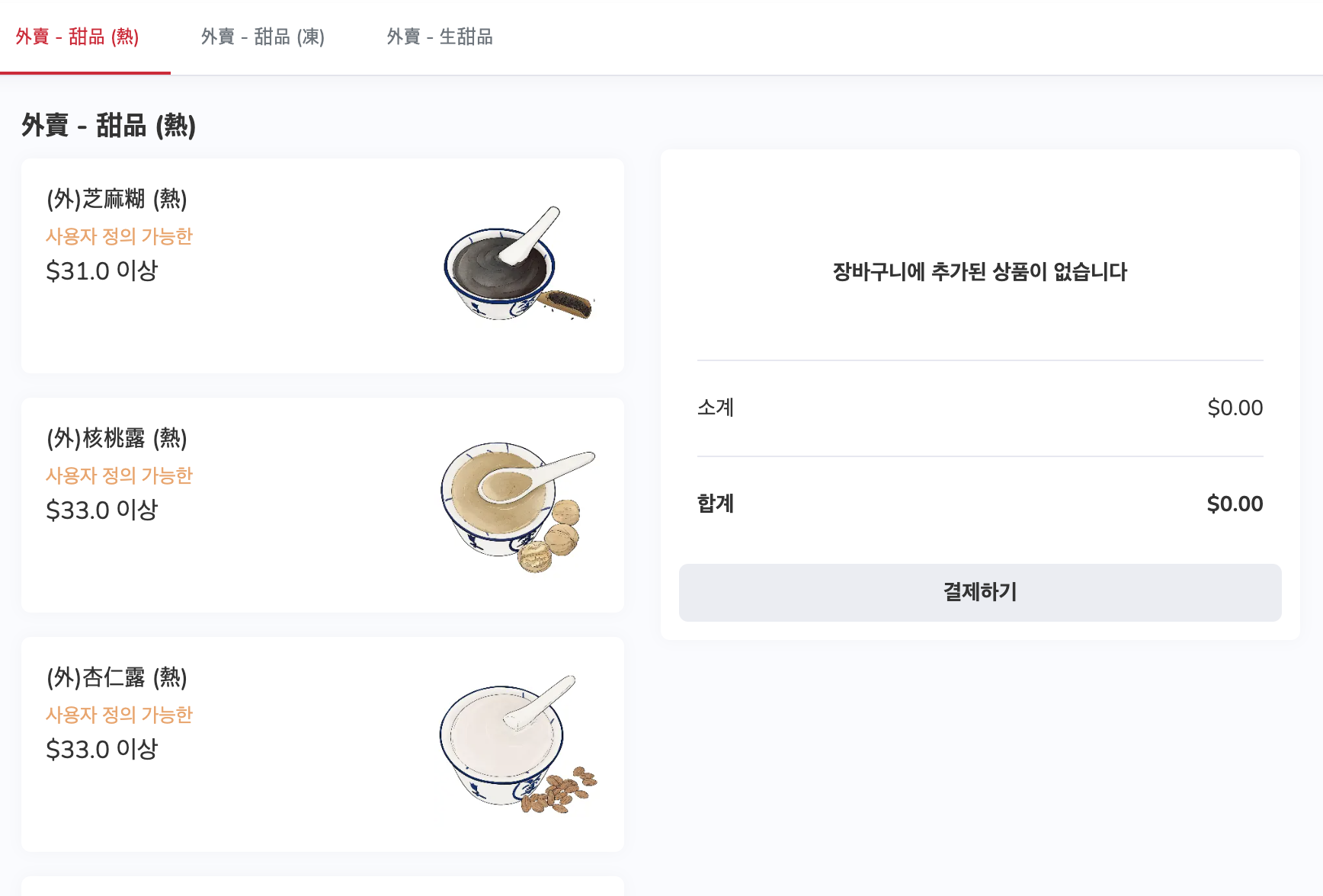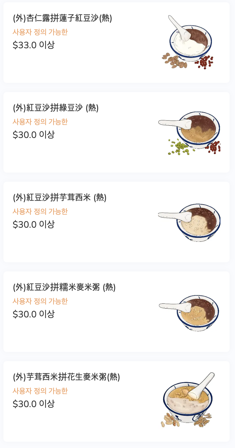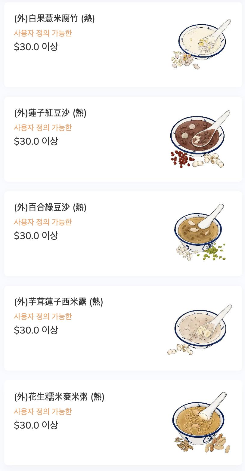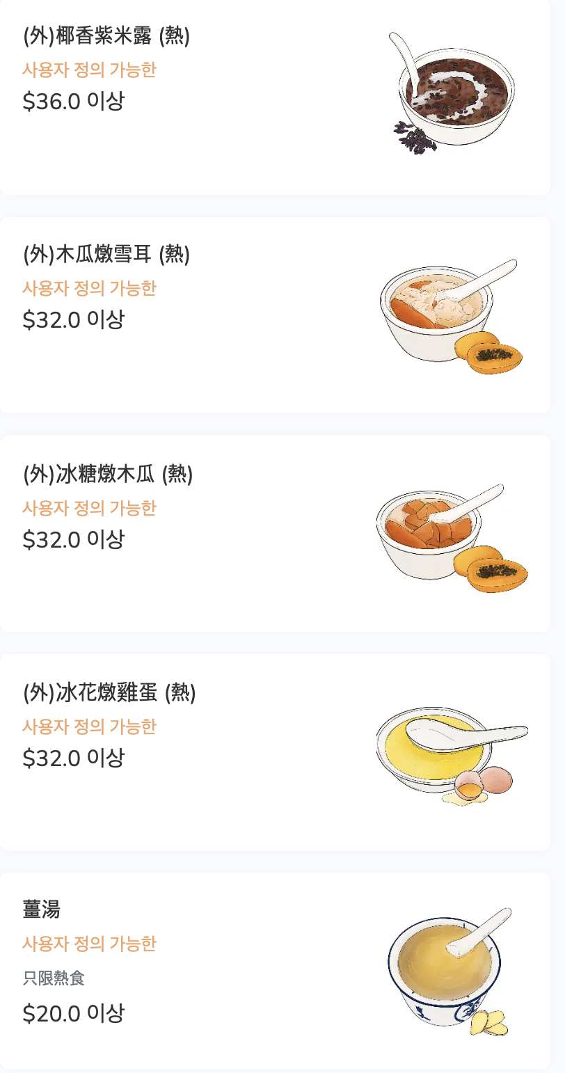 매장에서 직접 주문을 하고 계산도 할 수 있기 때문에 카드를 등록하지 않았다면 이야기를 하는 것이 좋다. 물론 약간의 소통이 돼야 하지만 그리 어려운 편은 아니다. 정말 오랜만에 먹었던 이 수프+죽+디저트는 역시 추억보정이 아니더라도 나에게 참 잘 맞았다. 한국은 생강을 정말 잘 못쓰는 편이다. 물론 한국 생각이 너무 강하고 맵기 때문에 그런 것 일 수 있으나 그래도 예전을 생각해 보면 생강편을 설탕에 절여서 먹었던 걸 생각해 보면 먹을 수 있을 것 같기도 하다.