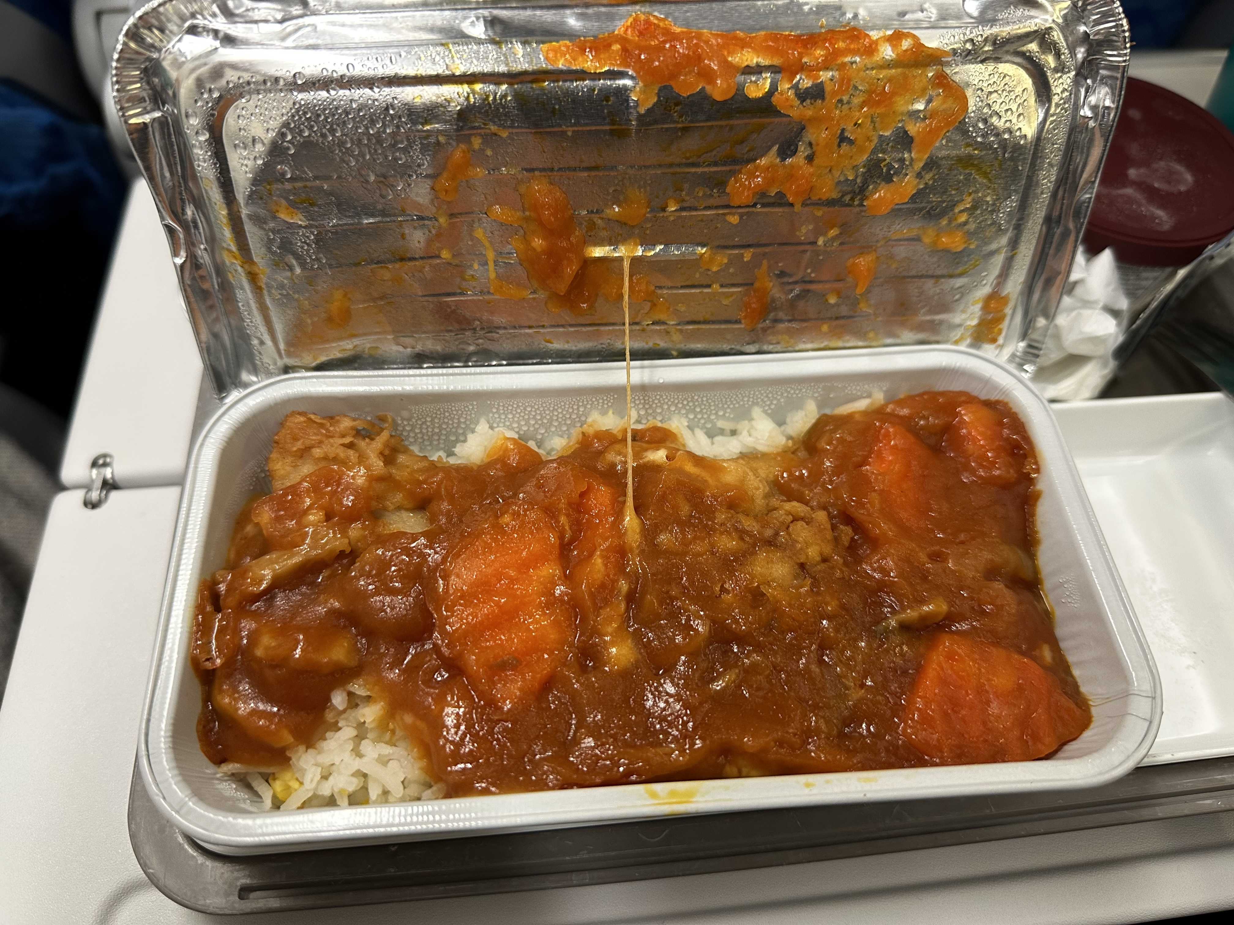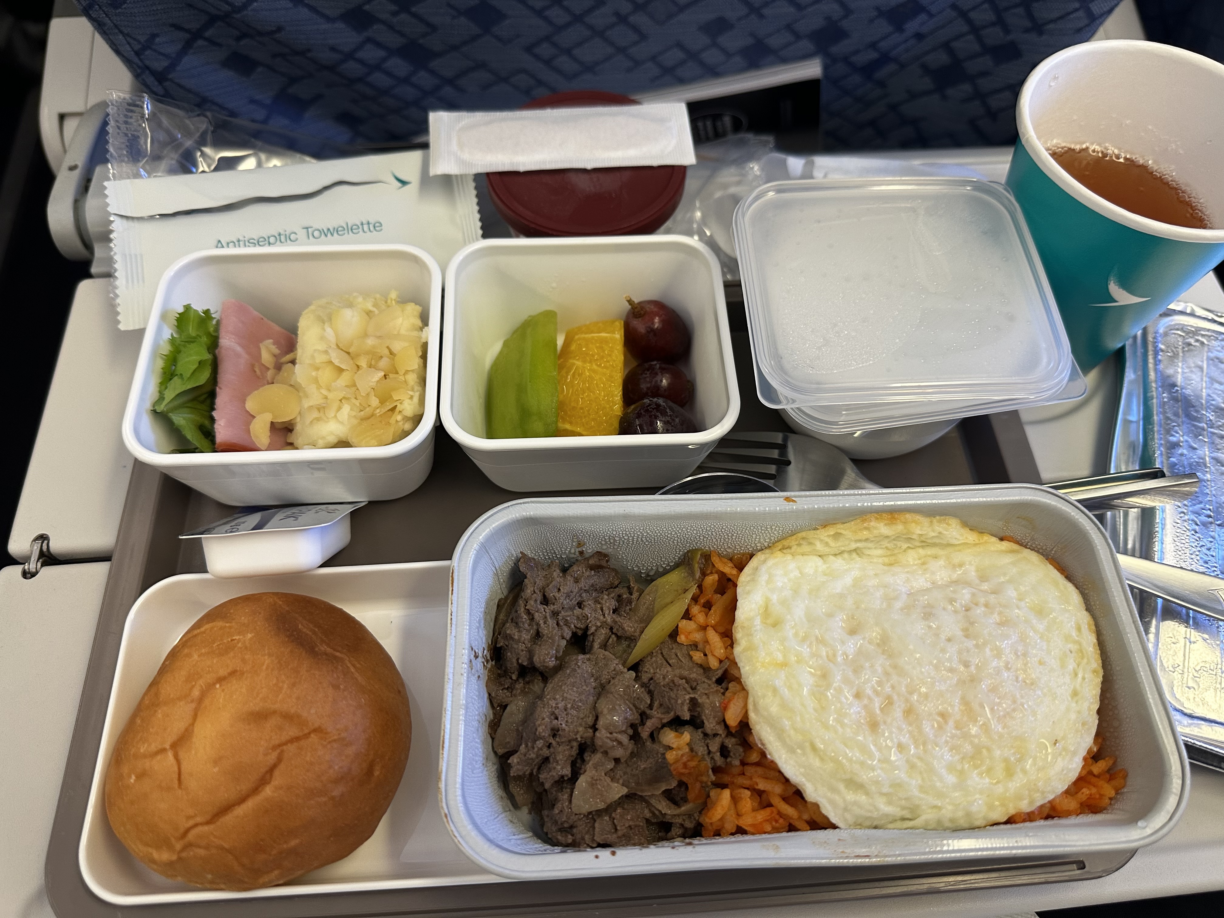 소고기는 김치볶음밥과 같이 나오고 한국식이라고 이야기해 준다. 그리고 치킨은 홍콩식이라고 이야기해 주는데 튀긴 닭고기에 토마토베이스 소스를 듬북 얹어서 흥건하게 밥과 함께 나온다. 밥은 약간 계란 볶음밥에 가깝기 때문에 생각보다 먹을만하다. 대부분 닭고기 기내식이 최악인데 이 기내식은 생각보다 먹을만해서 조금 놀랐다.
