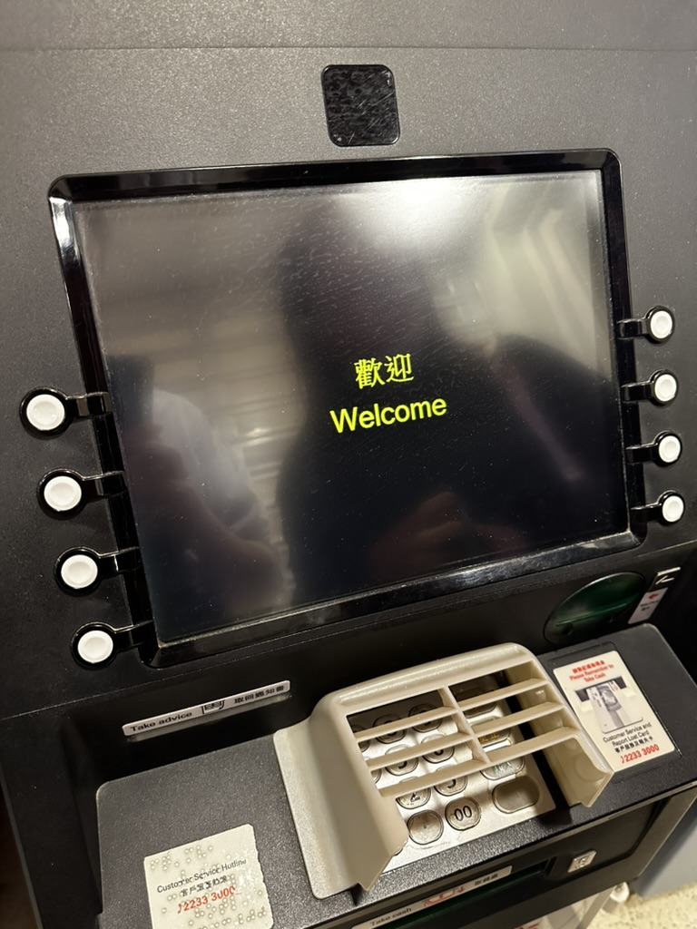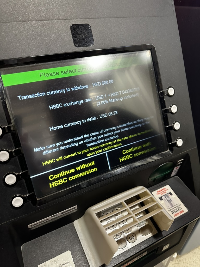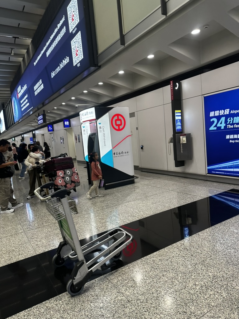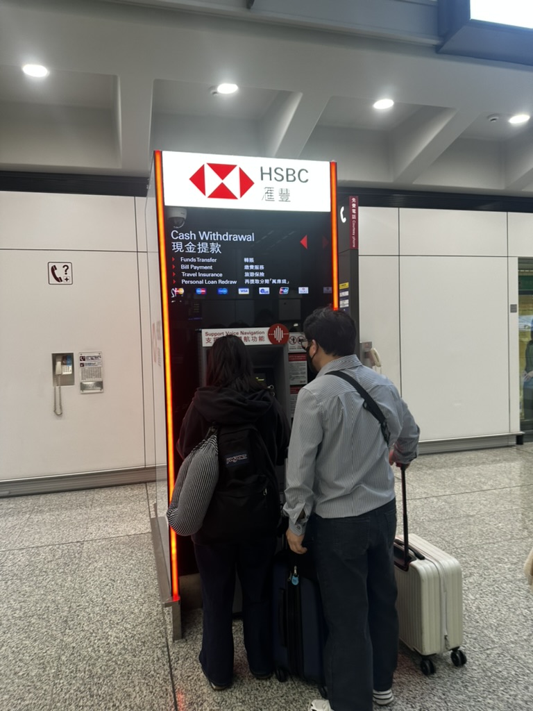 공항에서 입국수속을 마치고 나면 짐을 찾는 곳으로 가게 되어있다. 홍콩 공항이 좋은 점은 이 짐을 찾는 곳에서부터 ATM이 있어서 환전을 할 수 있다는 것이다. 트레블 월렛으로는 두 곳의 ATM모두 무료로 돈을 뽑을 수 있기 때문에 좋다. HSBC와 중국은행(Bank of China) 모두 환전이 가능하기 때문에 우리는 사람이 많이 없는 HSBC를 골라서 했다.