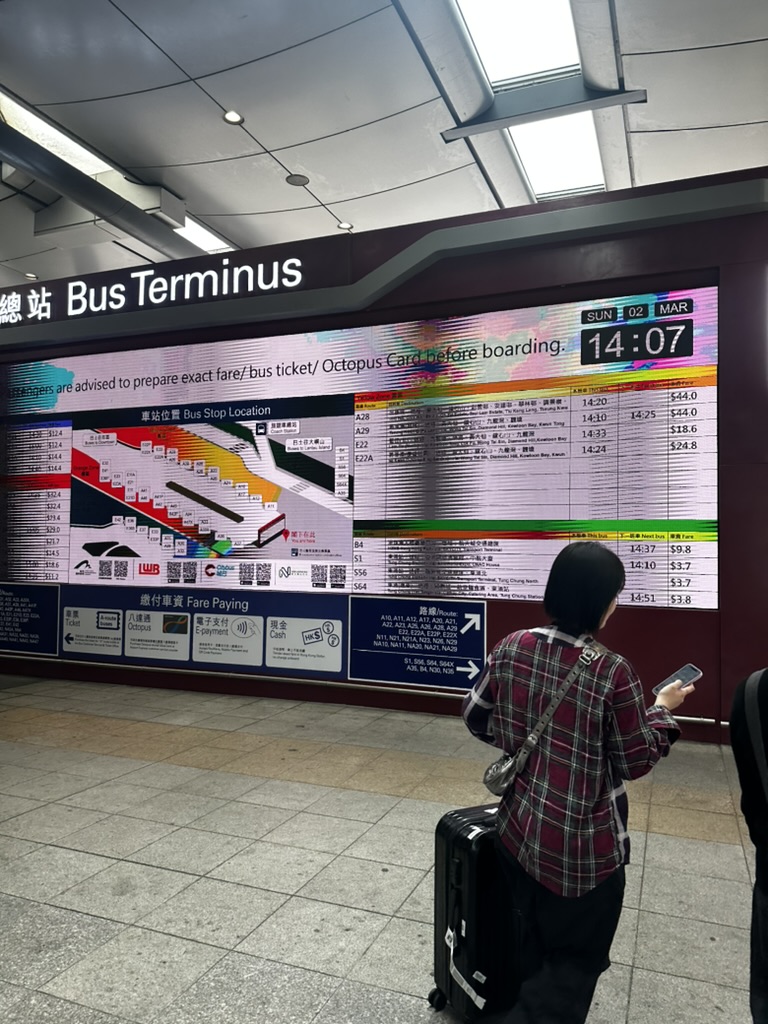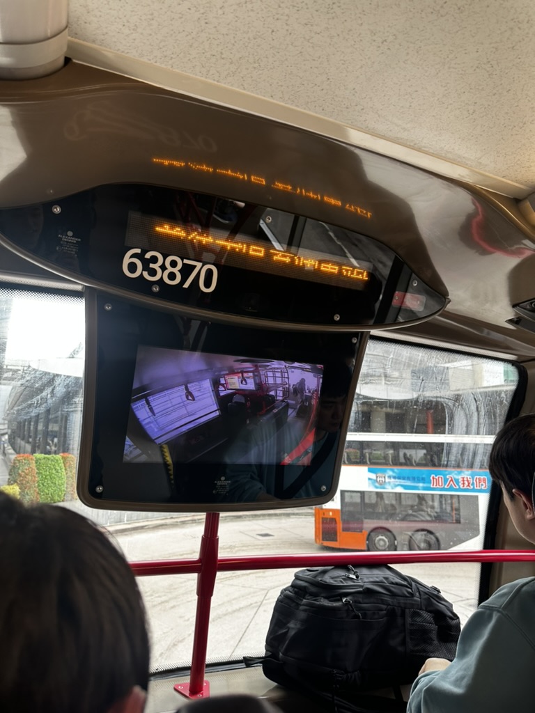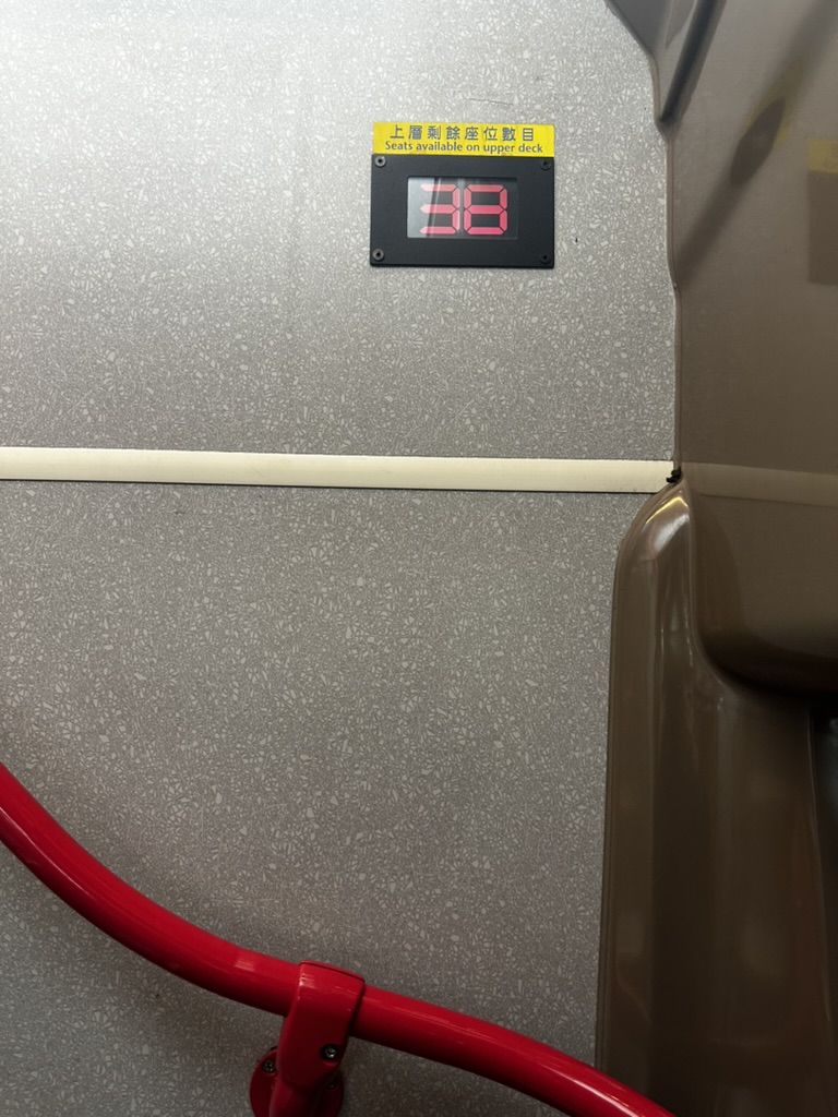 바로 빨간색으로 보이는 이 2층 버스를 타면 된다. 짐은 아래에 두고 자리가 없으면 위로 올라가면 되는데 위의 자리가 있는지 없는지 숫자로 잘 표시해 주고 있기 때문에 그 숫자를 확인하고 올라가면 된다. 그리고 짐칸에 CCTV가 있어서 확인이 가능하니 너무 걱정할 필요는 없다. 그래도 홍콩은 아직 홍콩이다.