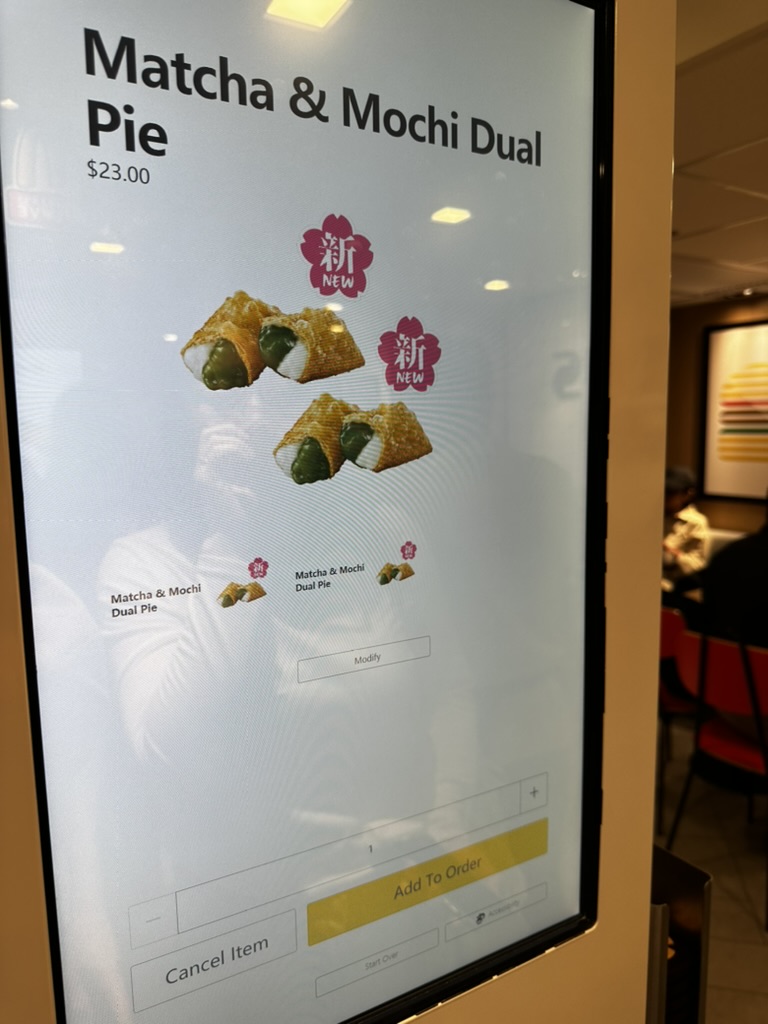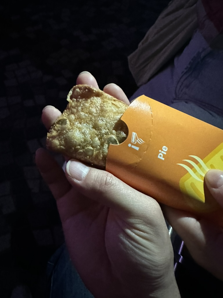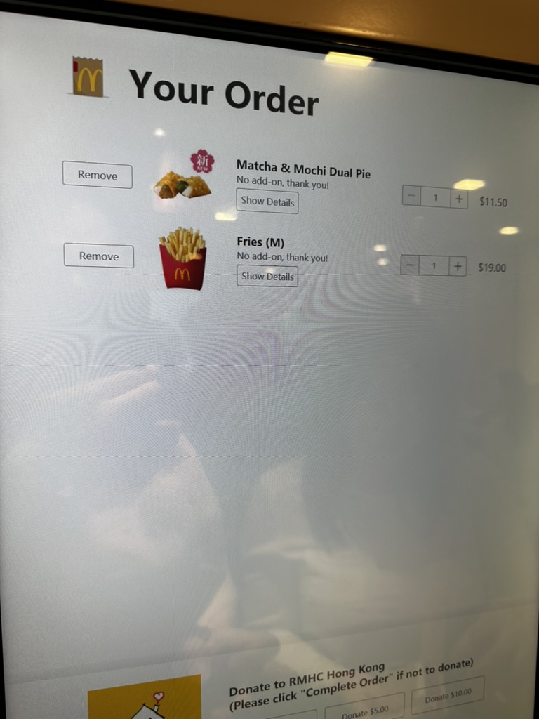 그리고 기다릴 때는 뭐니 뭐니 해도 스낵이 필요한데 그 근처에 맥도널드가 있기 때문에 홍콩의 맥도날드 특별 메뉴를 하나 들고 가는 것이 아주 좋다. 이번 우리가 갔을 때에는 말차 모찌 파이가 출시해서 한번 먹어보려고 샀고 그리고 감자튀김을 같이 주문을 했다. 가격은 하나의 11.50달러로 2,100원 정도이고 감자튀김은 3,500원 정도라고 할 수 있다. 한국하고 거의 천 원 정도 차이가 난다고 생각하면 쉽다.