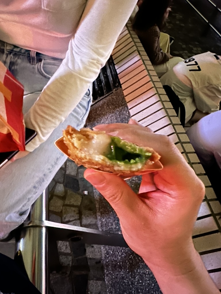 맛은... 약간 텁텁한 녹차와 소이밀크에 파이이다. 생각보다 나쁜데... 그렇다고 엄청 못 먹을 맛은 또 아니다. 태국에서 먹었던 타로가 훨씬 나은 것 같은 느낌이지만 그래도 녹차와 모찌의 조합이 그렇게 나쁘진 않아서 좋다. 다만 가장 문제는 엄청 달아서 먹고 나면 입에서 단맛이 없어지질 않는다는 점이다. 그래도 야경을 보면서 하나 정도 먹는 걸로는 나쁘지 않다.