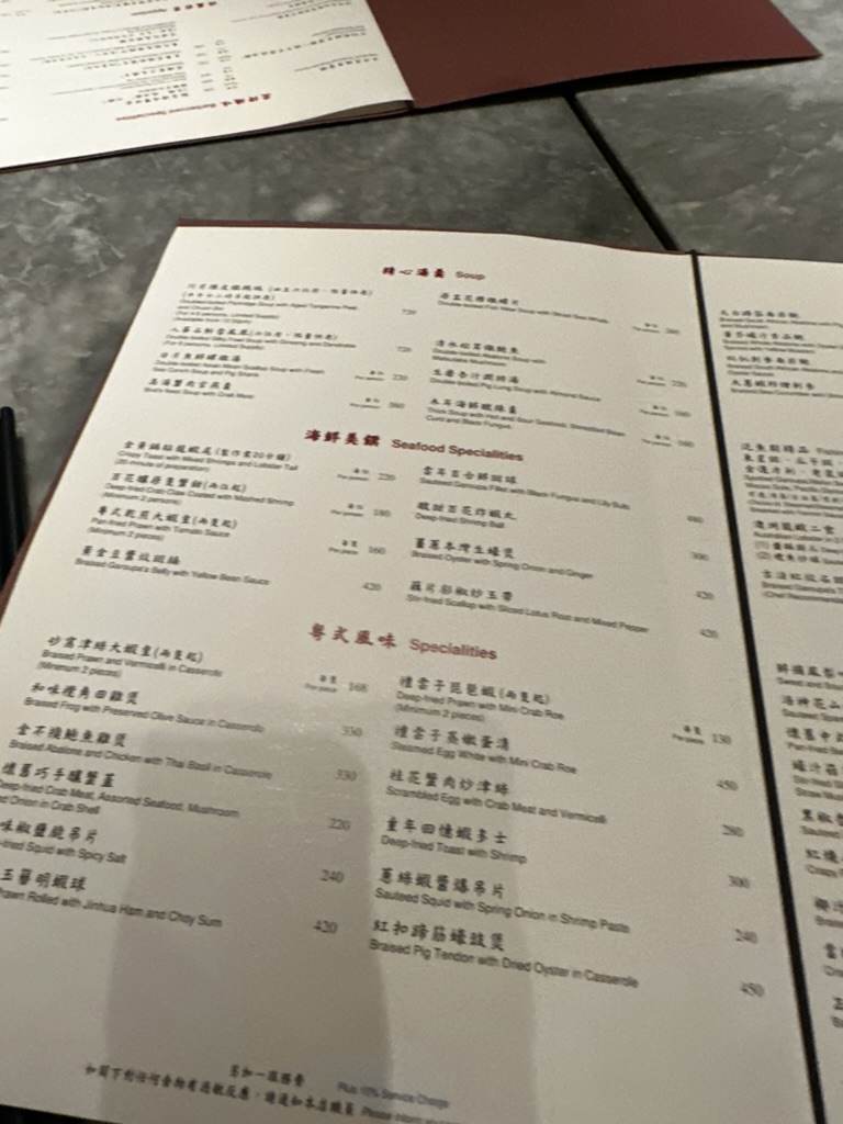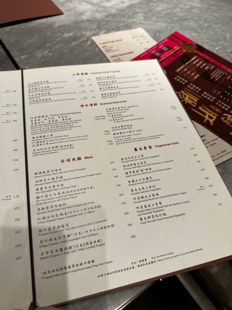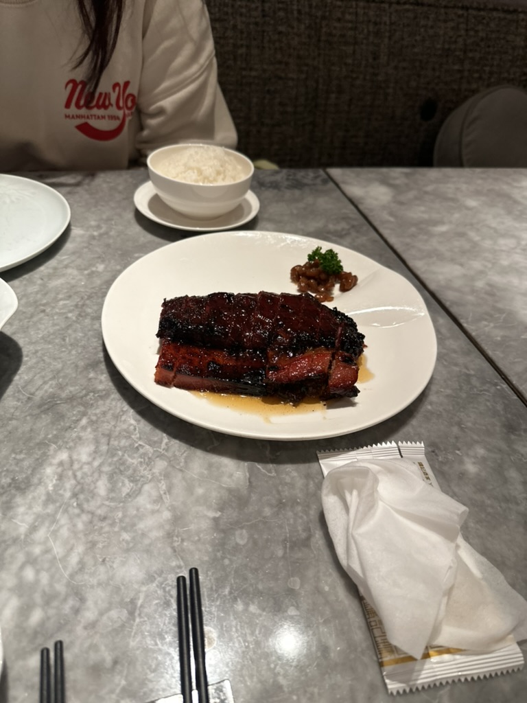 자리로 안내를 받고 메뉴를 받았는데 정말 메뉴가 많아서 놀라기도 했지만 더 대단한 건 가격이었다. 우리가 이번에 시킨 메뉴 중에 밥을 제외하고 가장 싼 메뉴가 볶은 야채로 버섯과 함께 나오는 240달러짜리 음식이었다. 야채 볶음이.... 45,000원... ㅋㅋㅋ 우리는 챠슈, 거위구이, 야채볶음, 밥, 차를 주문을 했다. 볶음밥을 시킬까 했는데 이미 고기 메뉴가 2개나 있고 너무 느끼한 느낌이 들어서 밥은 일반 밥으로 주문을 했다.