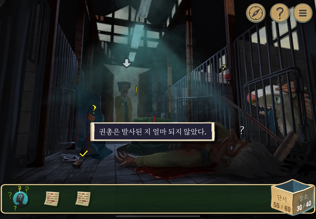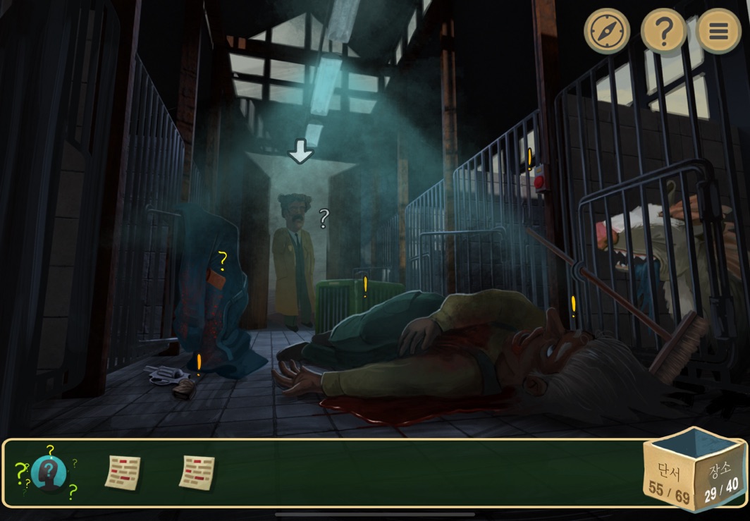 드디어 실제로 사건이 일어난 곳이다. 시체가 하나 있고 경주견이 한 마리 있는 것으로 보인다.