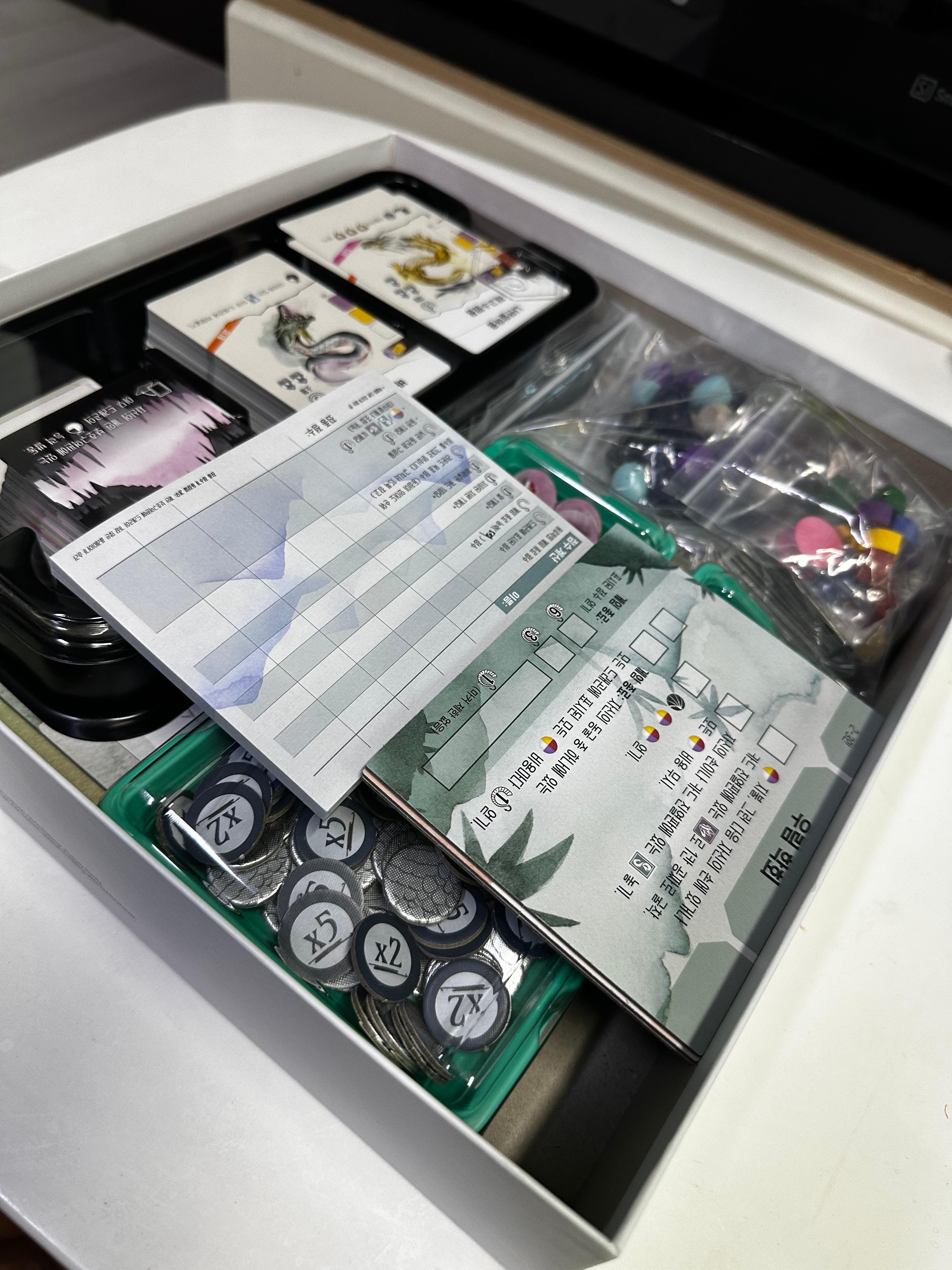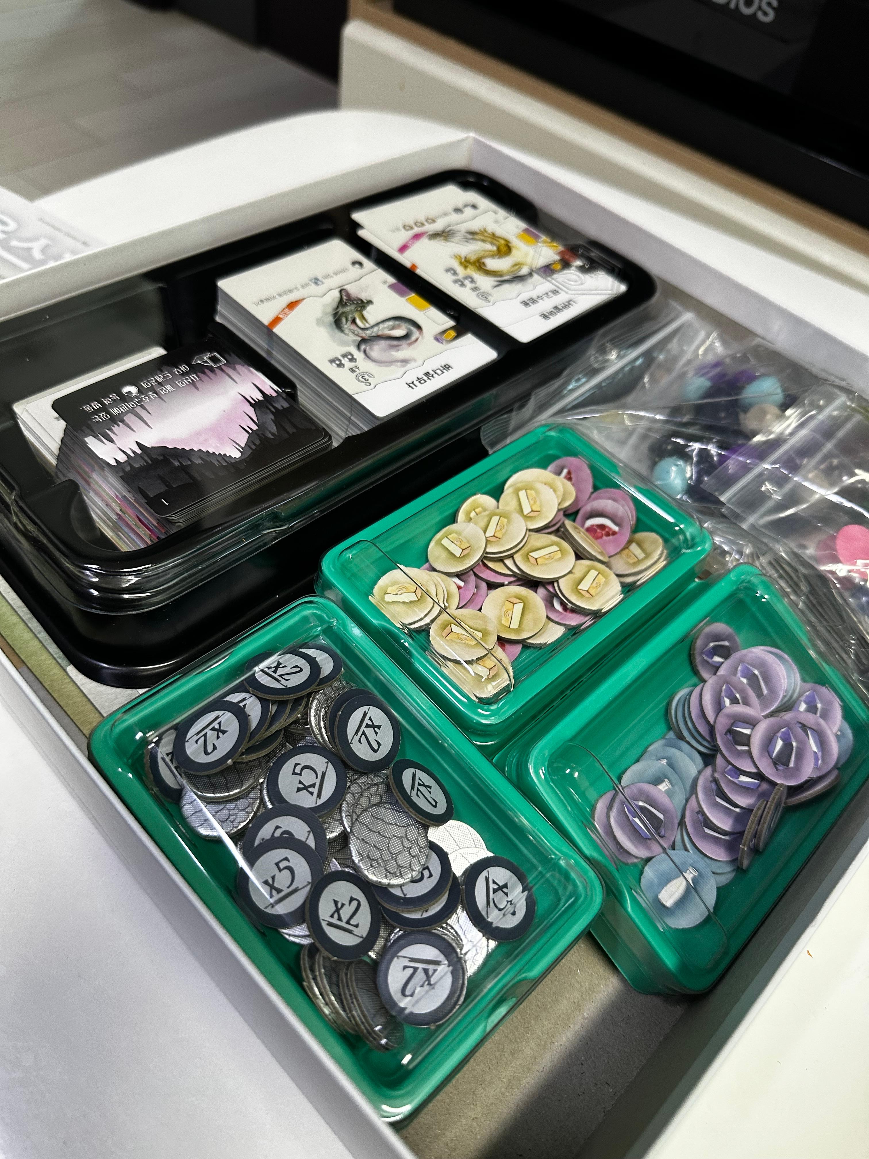 조금 놀랐던 점은 트레이가 생각보다 잘 구성이 되어있다는 점이었다. 물론 이 트레이가 게임을 할 때에는 그렇게 필요가 있다고 할 순 없으나 그래도 있으면 구성에서 뭔가 꽉 차는 느낌이다. 항상 느끼는 점은 플레이를 할 때 이런 트레이가 있으면 편하기도 하지만 굳이 있을 필요도 그렇게 없다. 그냥 판을 깔고 컴포를 놓으면 오히려 트레이가 불편할 때도 있다.