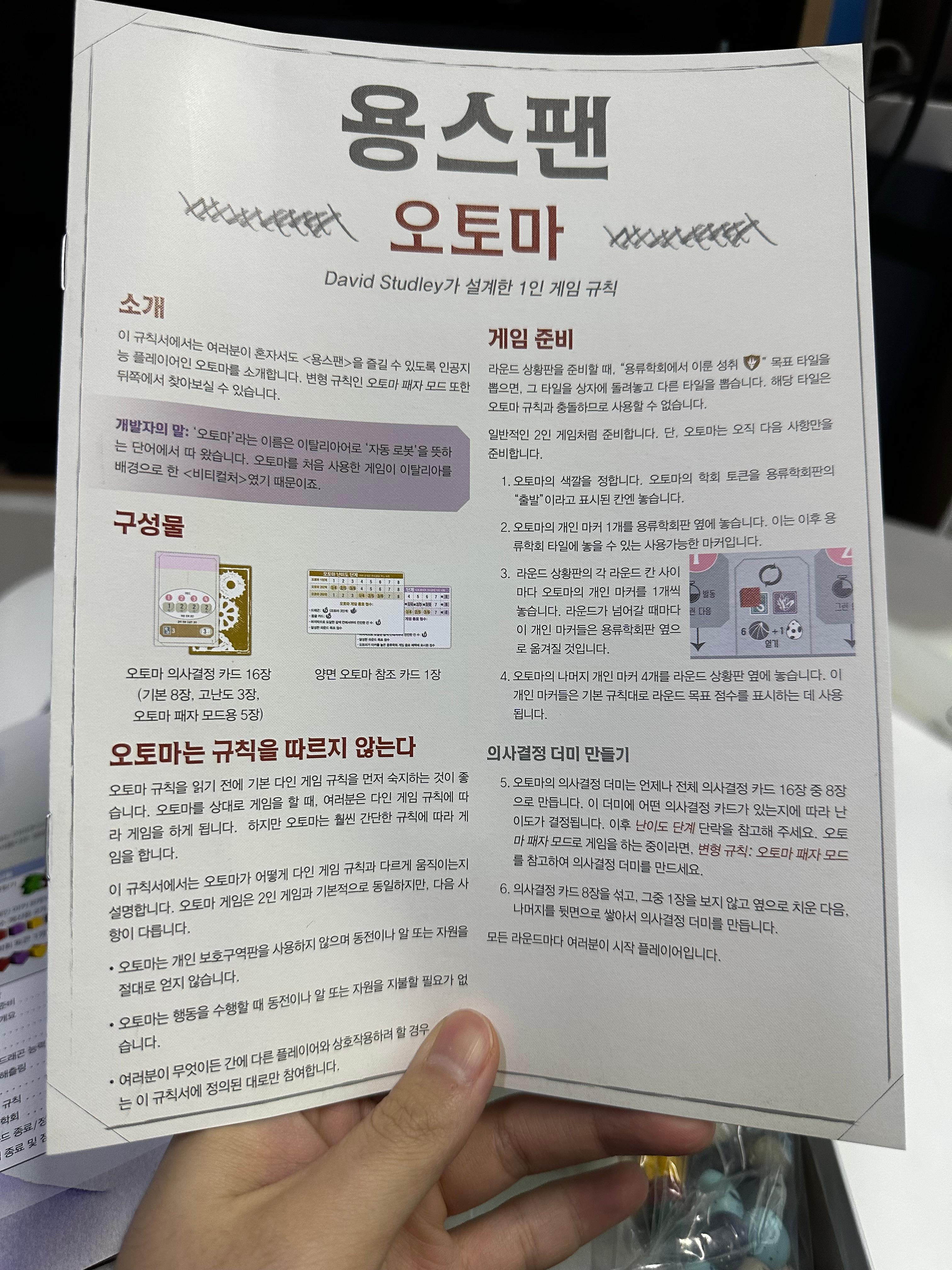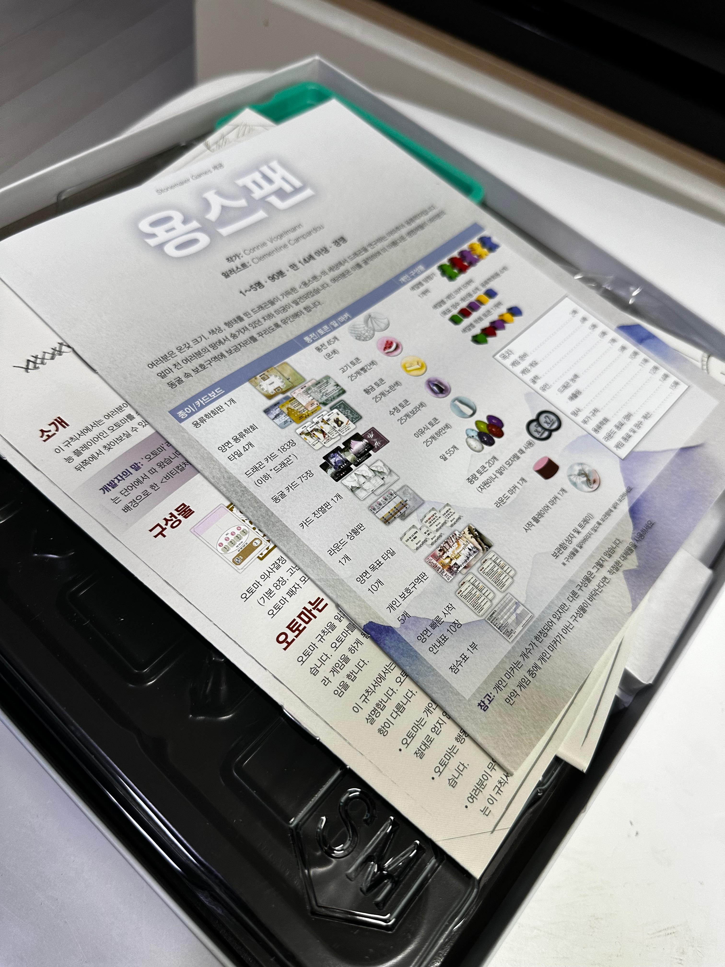그래도 용자체의 일러스트는 아주 좋고 컴포의 상태나 오토마의 설명 그리고 드래곤 백과라고 되어있는 설명이 아주 좋아서 맘에 들었다. 항상 보드게임을 사면 이 게임을 어떻게 만들었을까, 그리고 이런 게임을 만든다면 어떻게 바꿀 것인가를 고민해 보는데 이 게임은 확실히 수집 요소와 함께 스플렌더처럼 카드를 통해 콤보를 만드는 작업이 아주 흥미로웠다.
