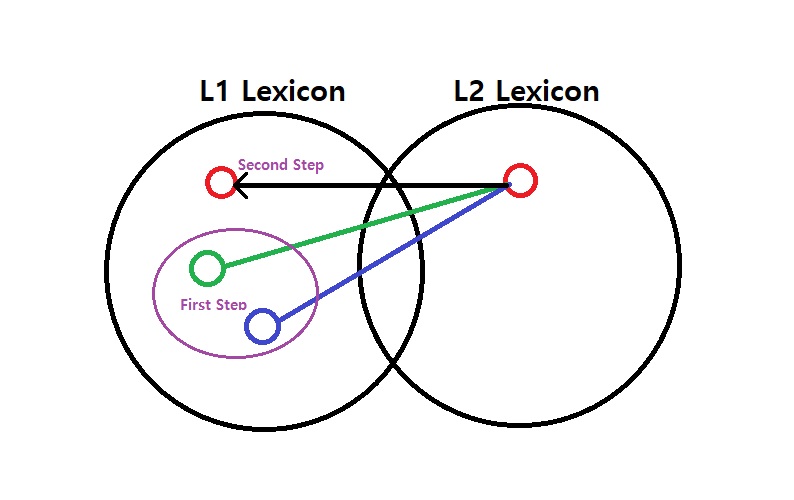 그렇다면 L2의 뜻을 L1의 뜻과 직접적으로 연결을 만들어 주는 것이 가장 효율적이 방법입니다. 이는 Rote learning(일반 영어단어 암기)의 과정이라고 할 수 있습니다.