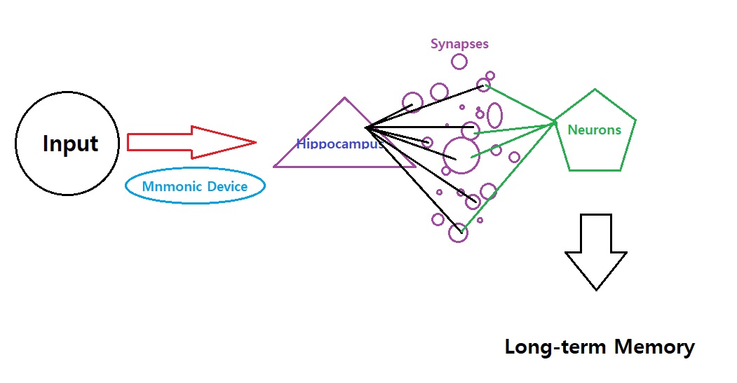 아래의 그림 1]에서 보다시피 Input의 일부를 Mnmonic device를 통해서 Hippocampus가 받아서 Synapse를 통해 Neuron(신경세포)로 전달하여 결국 Memory를 만드는 것입니다. 그림에서도 나타나듯이 해마로 Synapses의 수가 많으면(즉, Meaningful 하면) Neuron으로 들어가는 양이 많아서 장기기억 화가 더 잘 되는 것이라고 볼 수 있습니다. (요즘은 이 일련의 과정들이 Working Memory(작동기억)으로 많이 대체되어 이야기하는 경향이 있는 것 같습니다.)