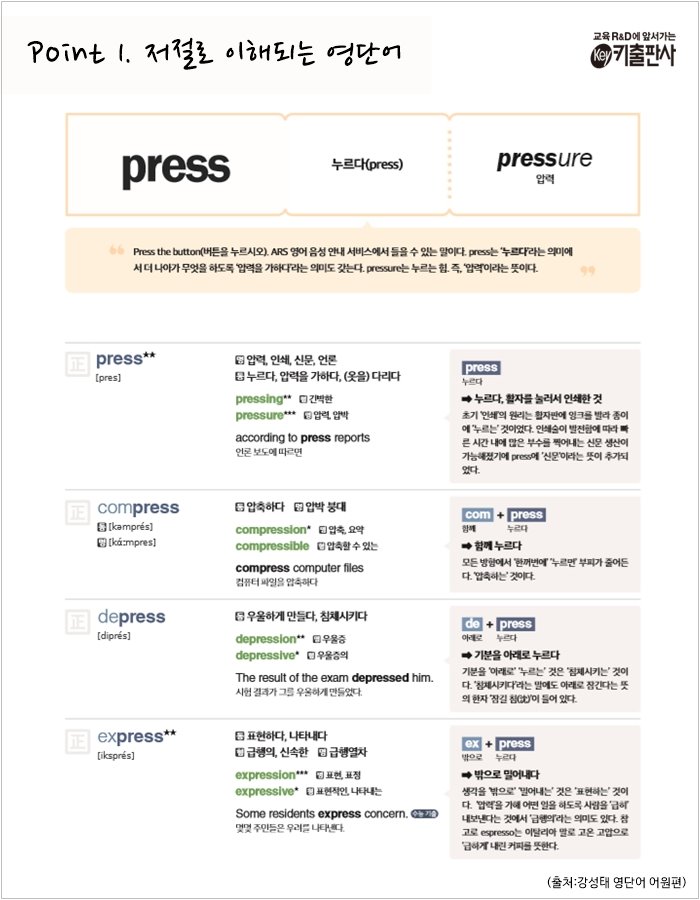 실제로 이러한 Keyword Method를 한국에서도 사용하는 영어책을 보면 어원, 어근 혹은 다른 동의어, 반의어 등을 같이 사용하여 유의미한 변화를 더 강화시키려는 움직임을 보여주고 있죠.