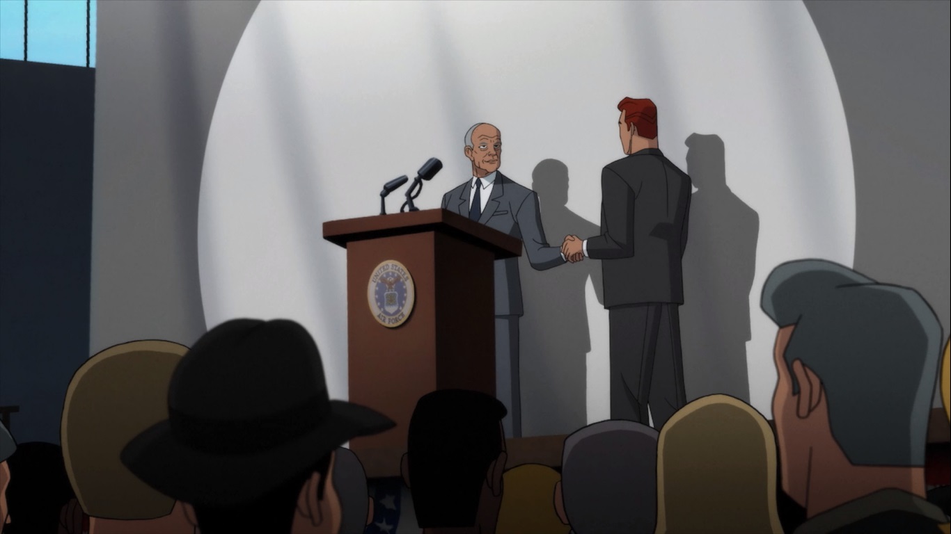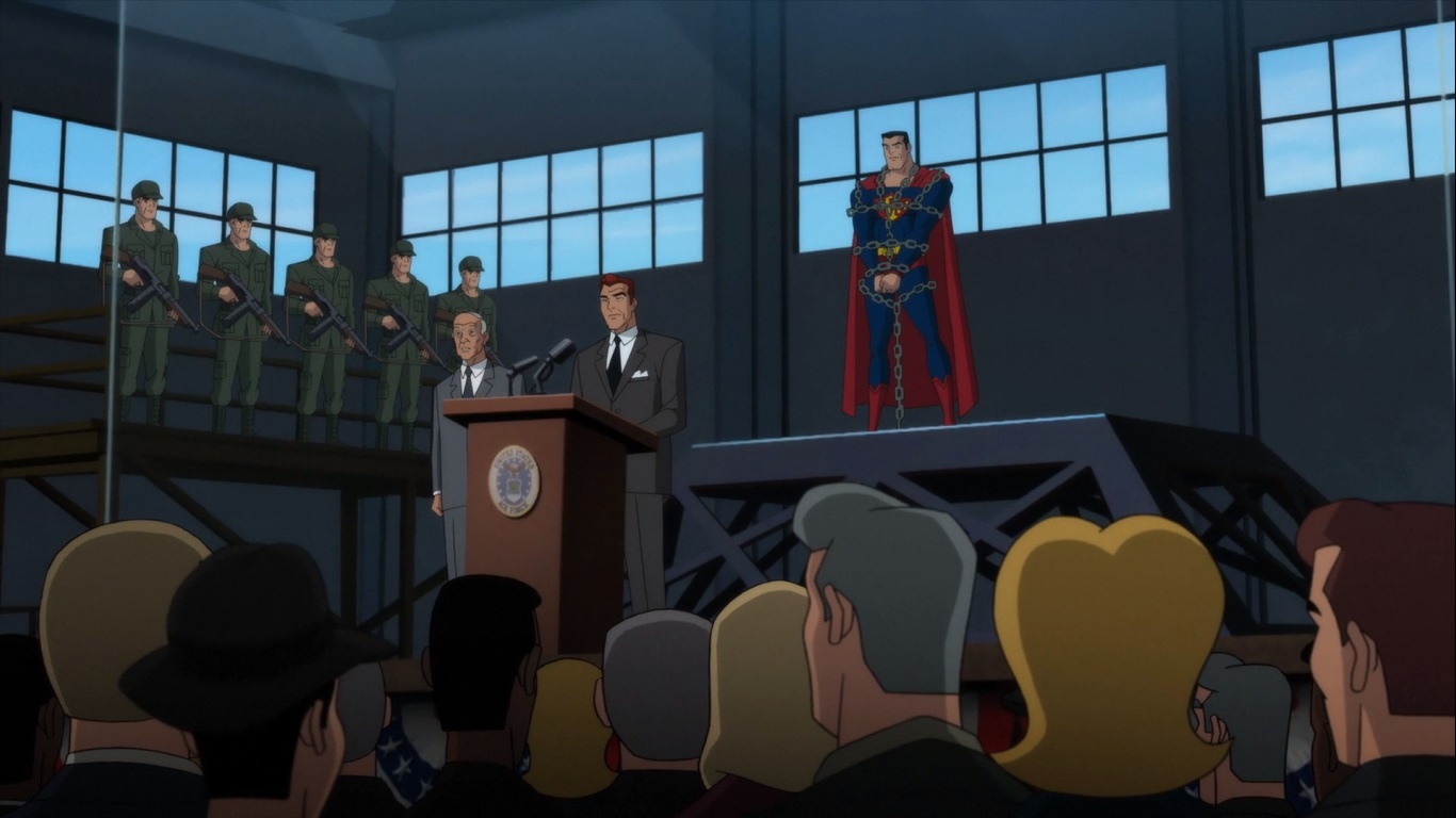 기자들이 몰려있는 곳에 대통령이 Lex Luthor를 소개합니다.
