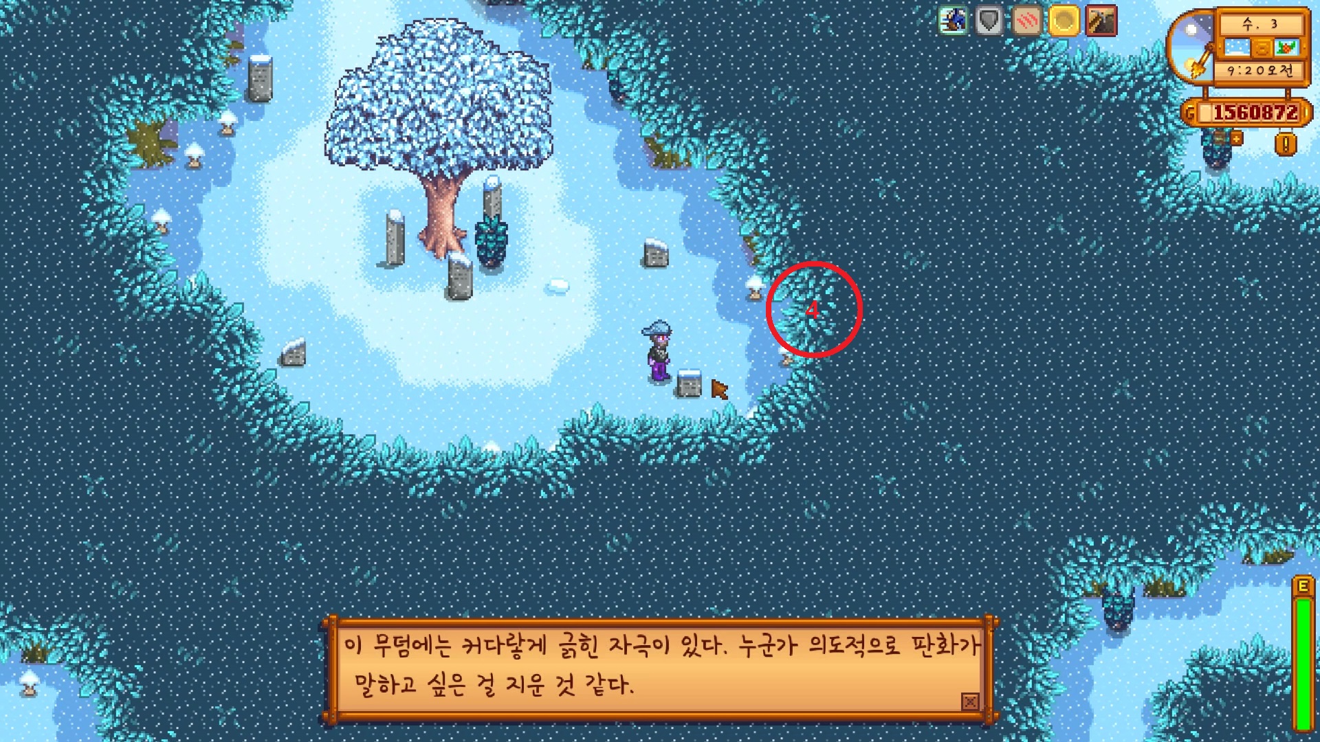 1년 차 겨울에 2일 차 되는 날에 갑자기 한 묘비를 보여줍니다.