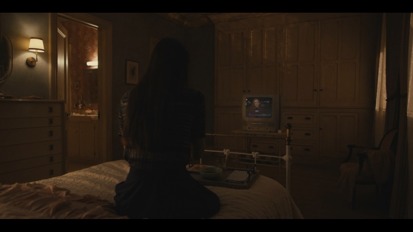 Leanne은 방에 가서 침대에 무릎을 꿇고 Dorothy가 나오는 뉴스를 보며 수프를 먹습니다.