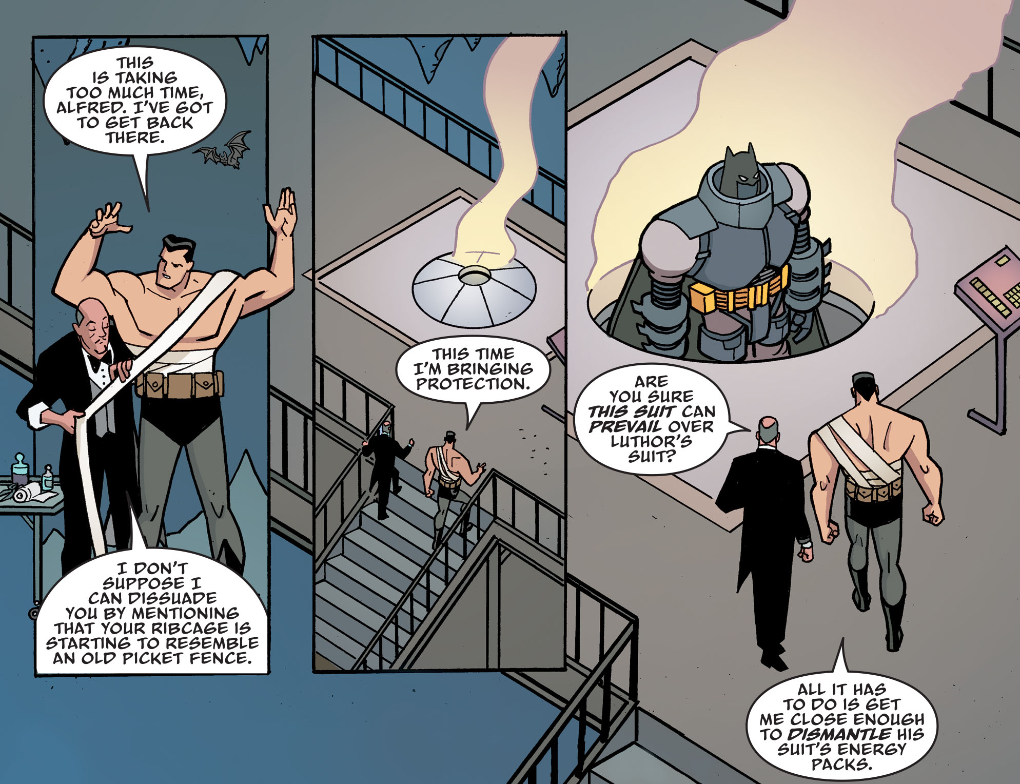 Alfred는 Batman이 슈트를 이용한다고 했지만 만일 큰 로봇을 Lex가 사용하면 어떻게 할 것이냐고 물어봅니다.