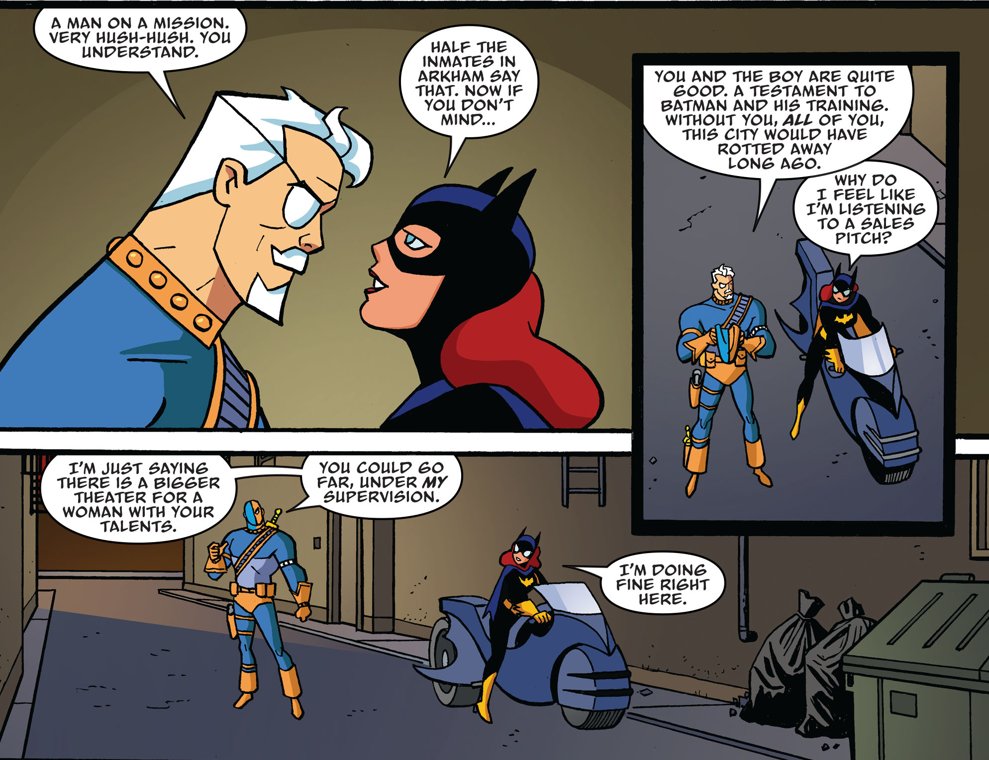 Robin과 Batgirl은 Deathstroke가 자신들을 칭찬했다고 하지만 Batman은 그의 칭찬에 현혹되지 말라고 하는군요.