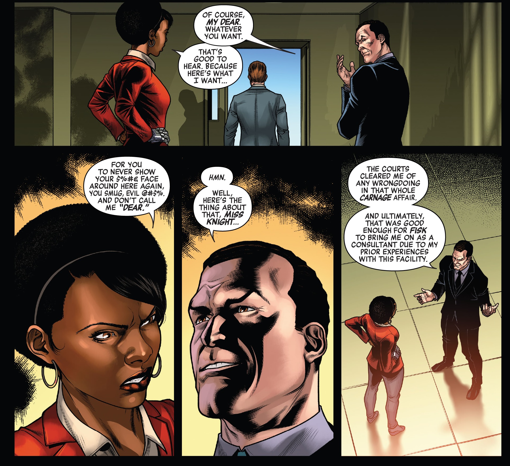 그러자 Osborn은 이미 법정에서 Carnage와 있었던 일에서 자신의 무죄를 입증했고 시장인 Fisk Kingpin이 Ravencroft에 자문을 할 수 있게 했다고 합니다.
