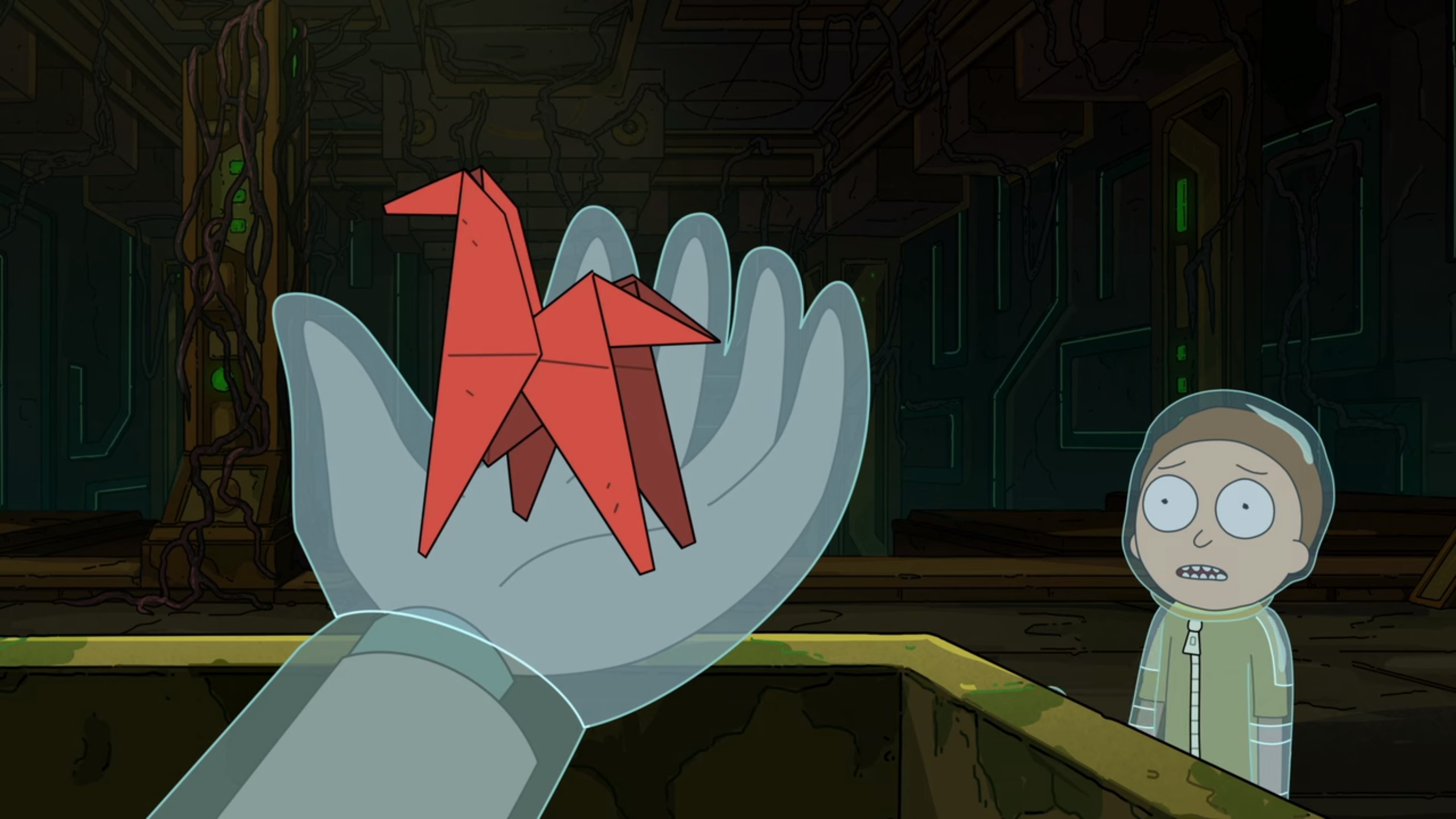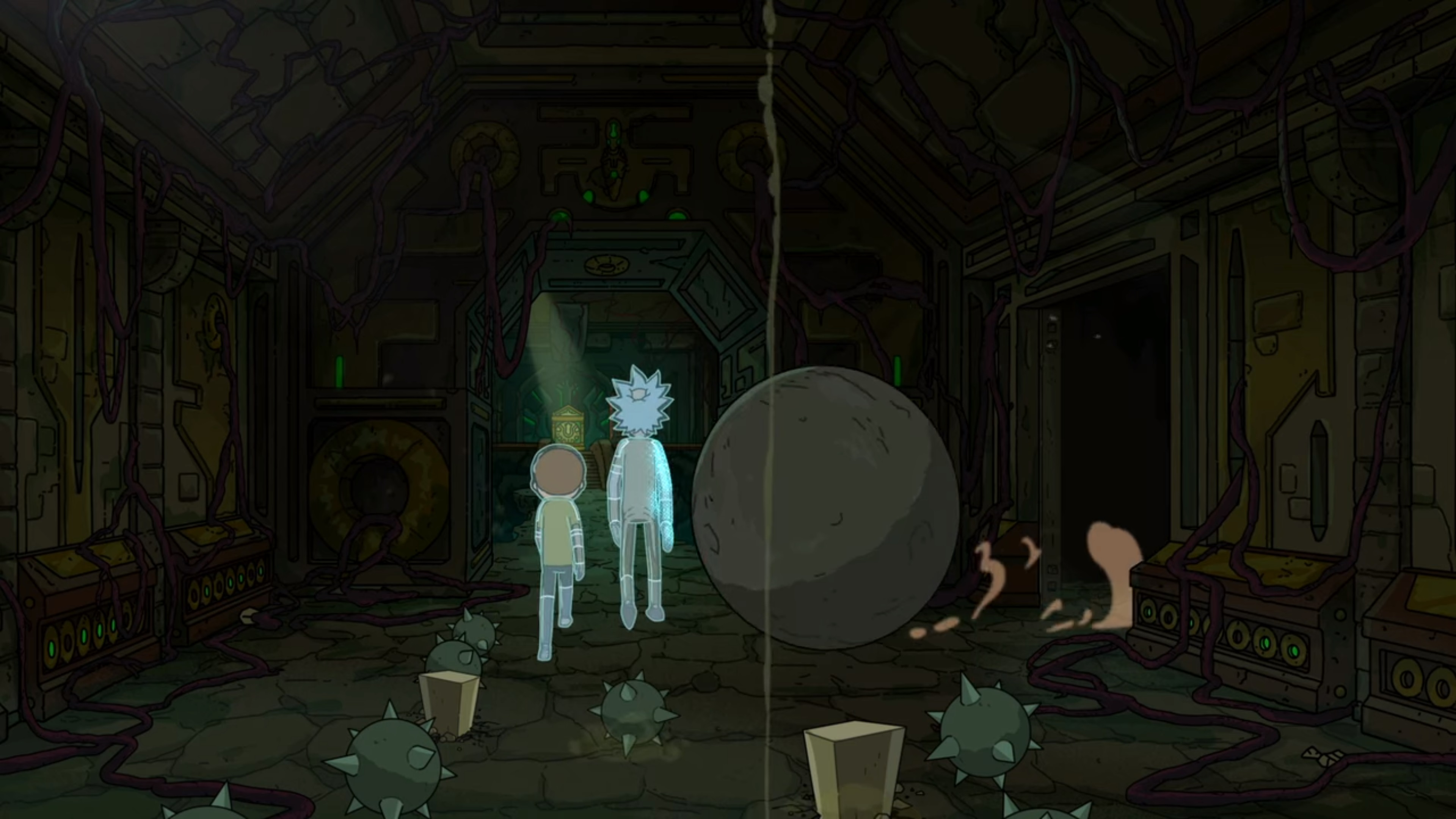하지만 Morty가 떨어지자 Rick은 할 수 없이 의자를 이용해 Morty를 끌고 갑니다.