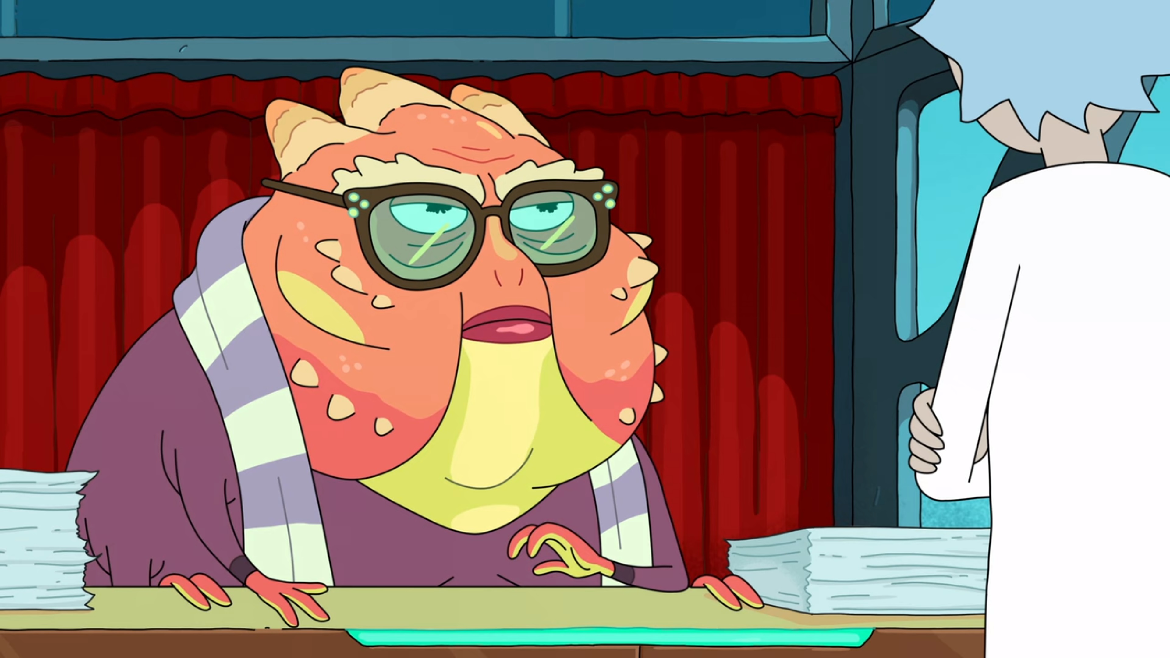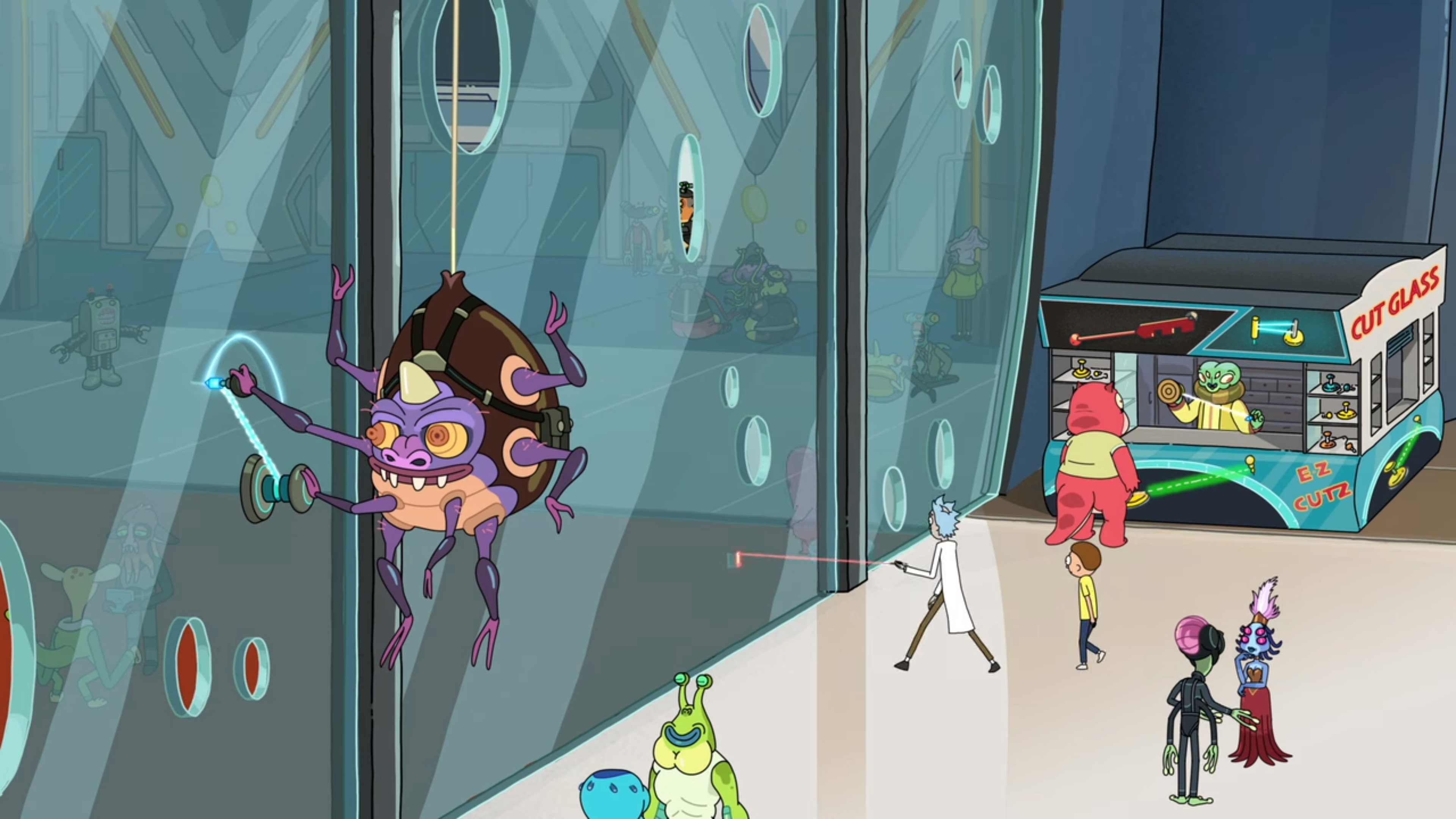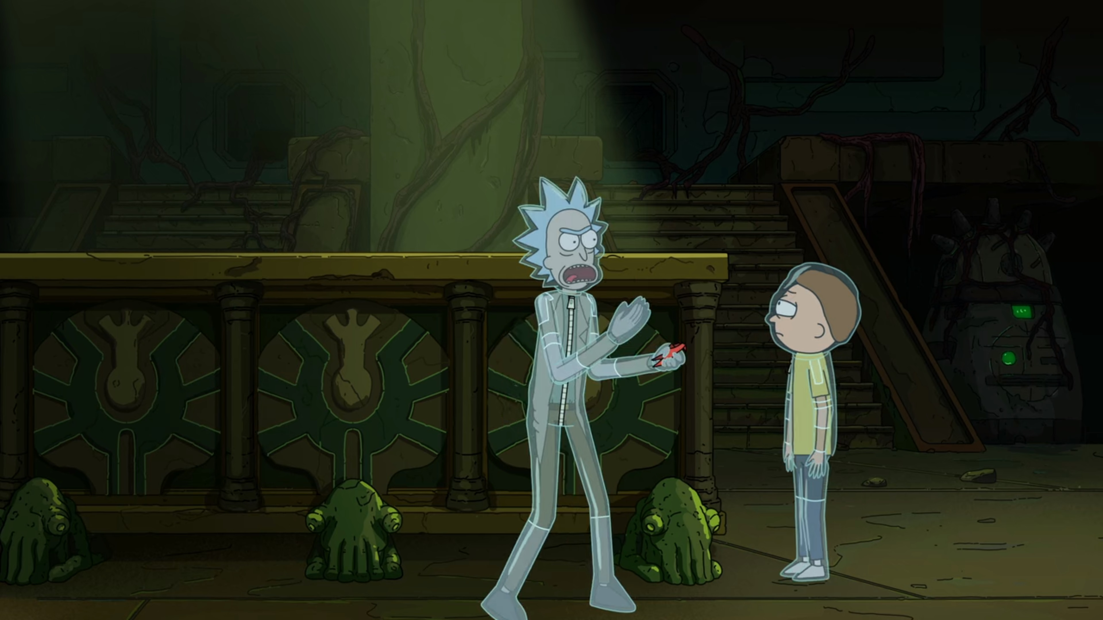 Rick은 욕을 하면서 Morty를 데리고 빠져나갑니다.
