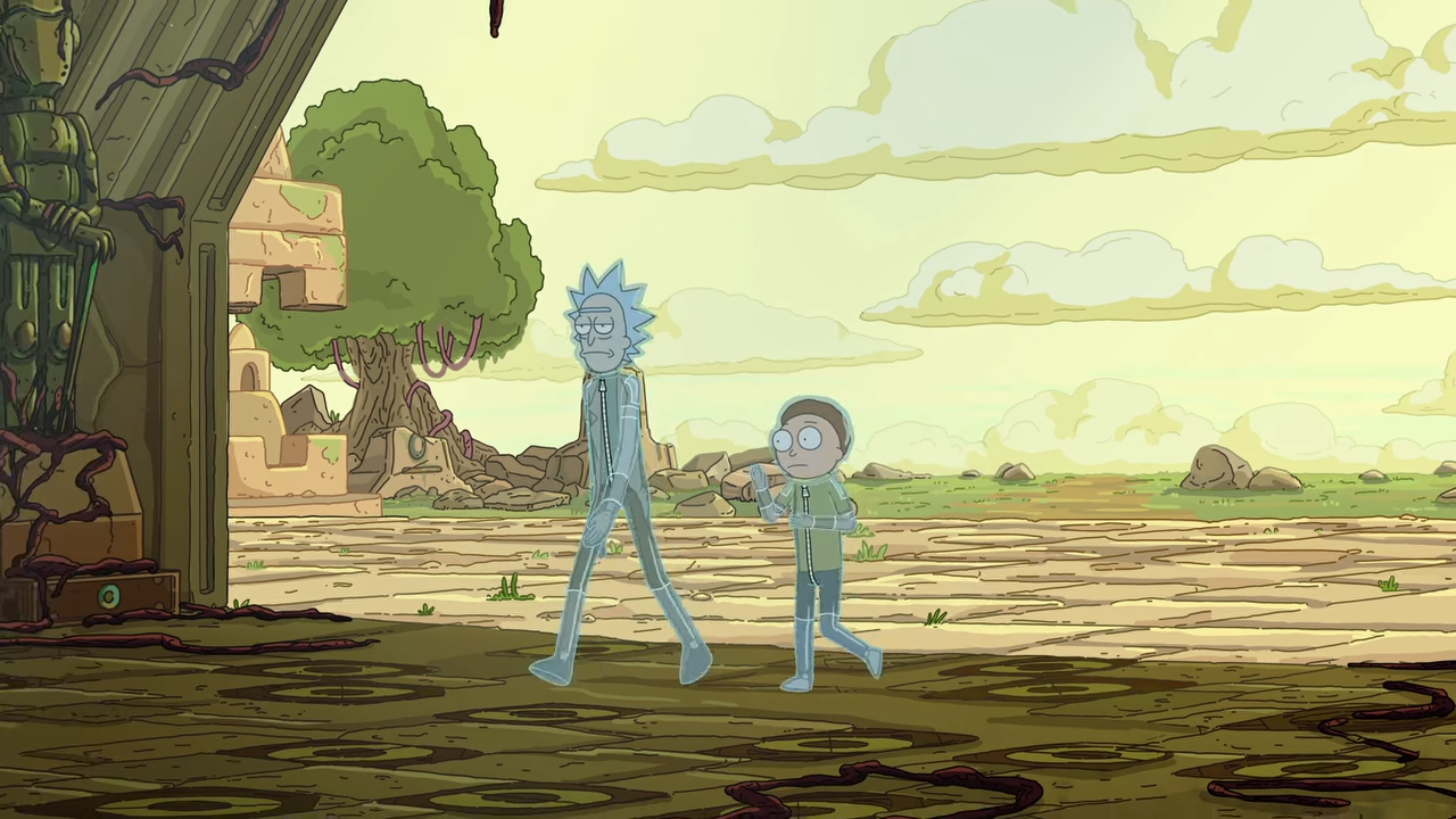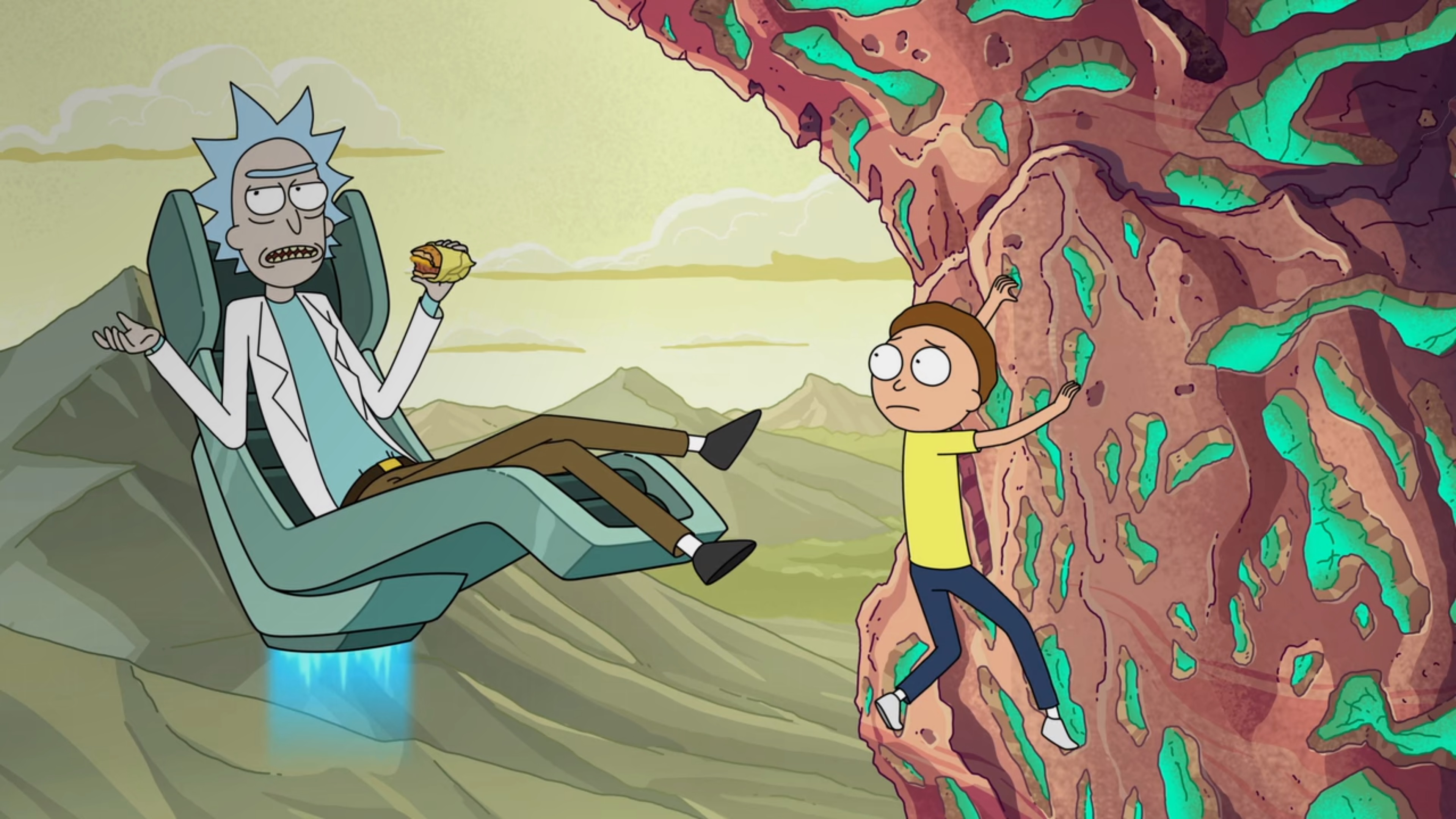 시작은 Rick은 둥둥 떠다니는 의자에 앉아있고 Morty는 절벽을 오르고 있습니다.