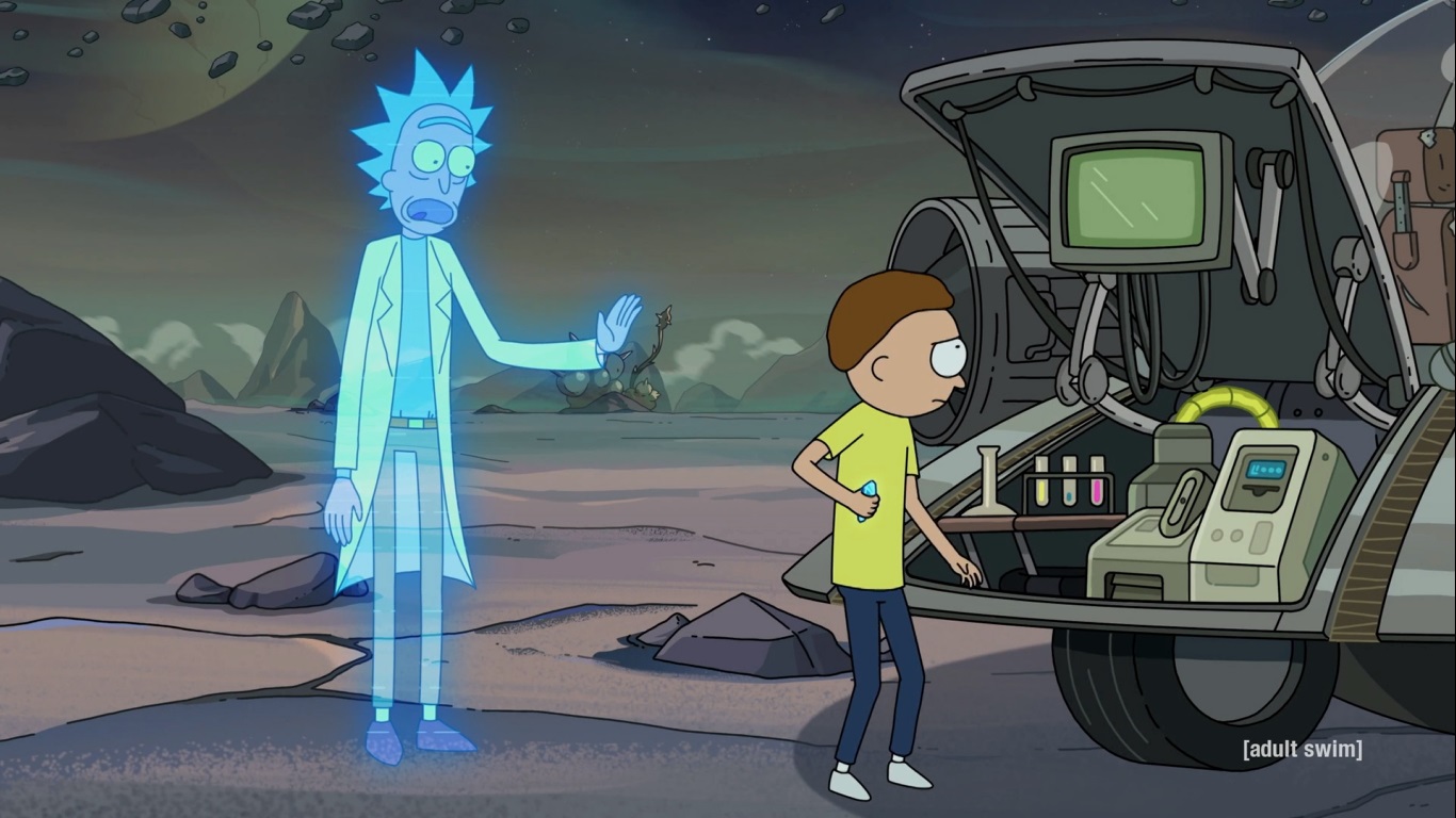 죽음에 이른 Rick은 Morty 몰래 그의 척추에 심어 놓은 홀로그램을 통해 자신을 복제하는 방법을 알려줍니다.