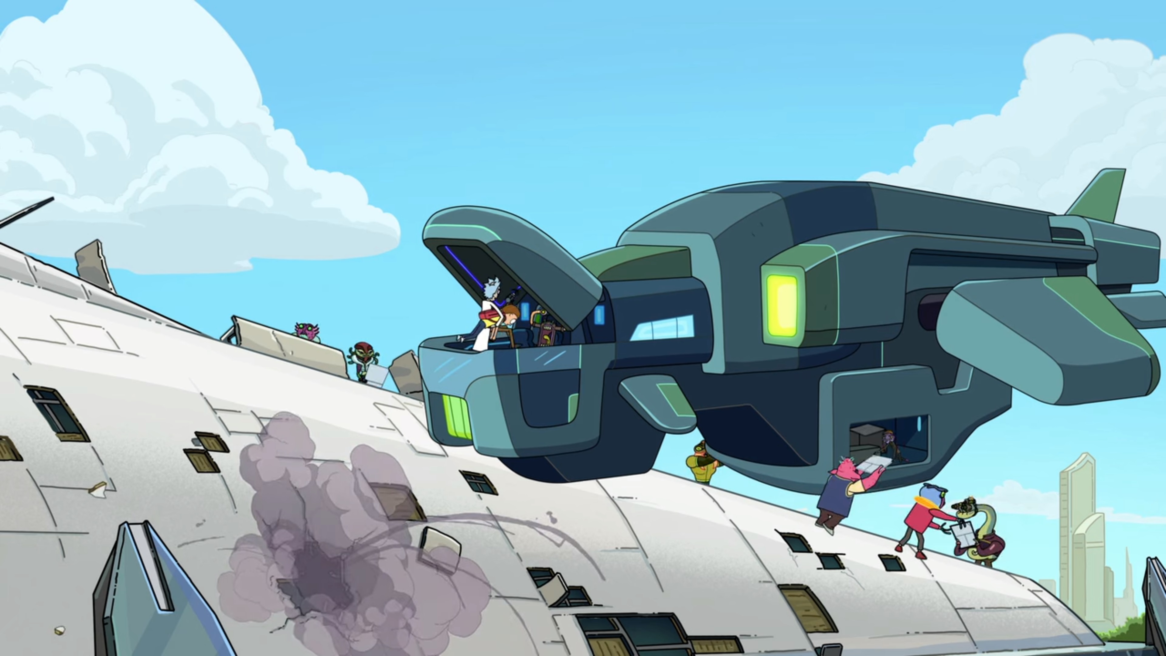 비행선에 올라탄 Rick은 Morty에게 해독제를 놓아서 돌려놓습니다.