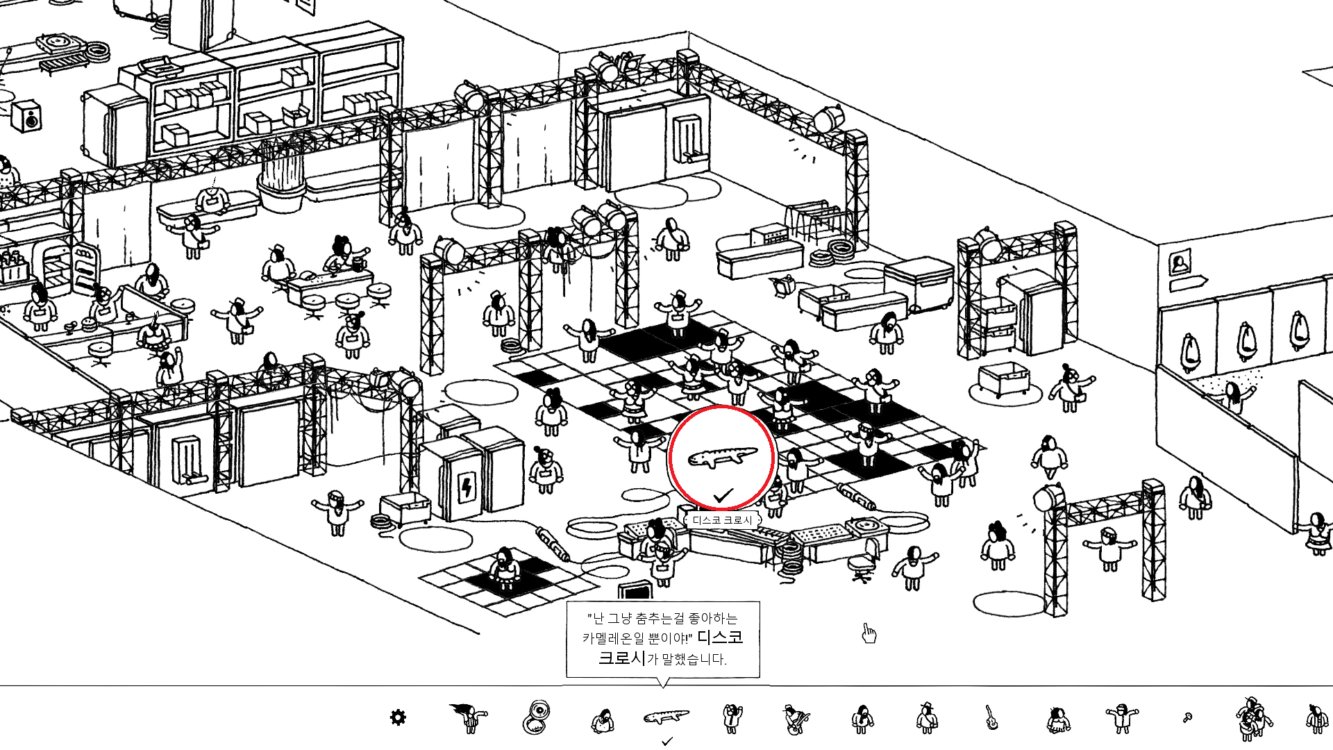 크로시라는 이름답게 악어입니다. 그리고 디스코라는 닉네임이 있듯이 디스코를 추는 곳에 있지요. 사실 처음에는 불이 꺼져있어서 보이지 않는데 디스코 앞에 전선이 빠져있는 것을 연결시켜 주시면 바로 크로시가 보입니다.