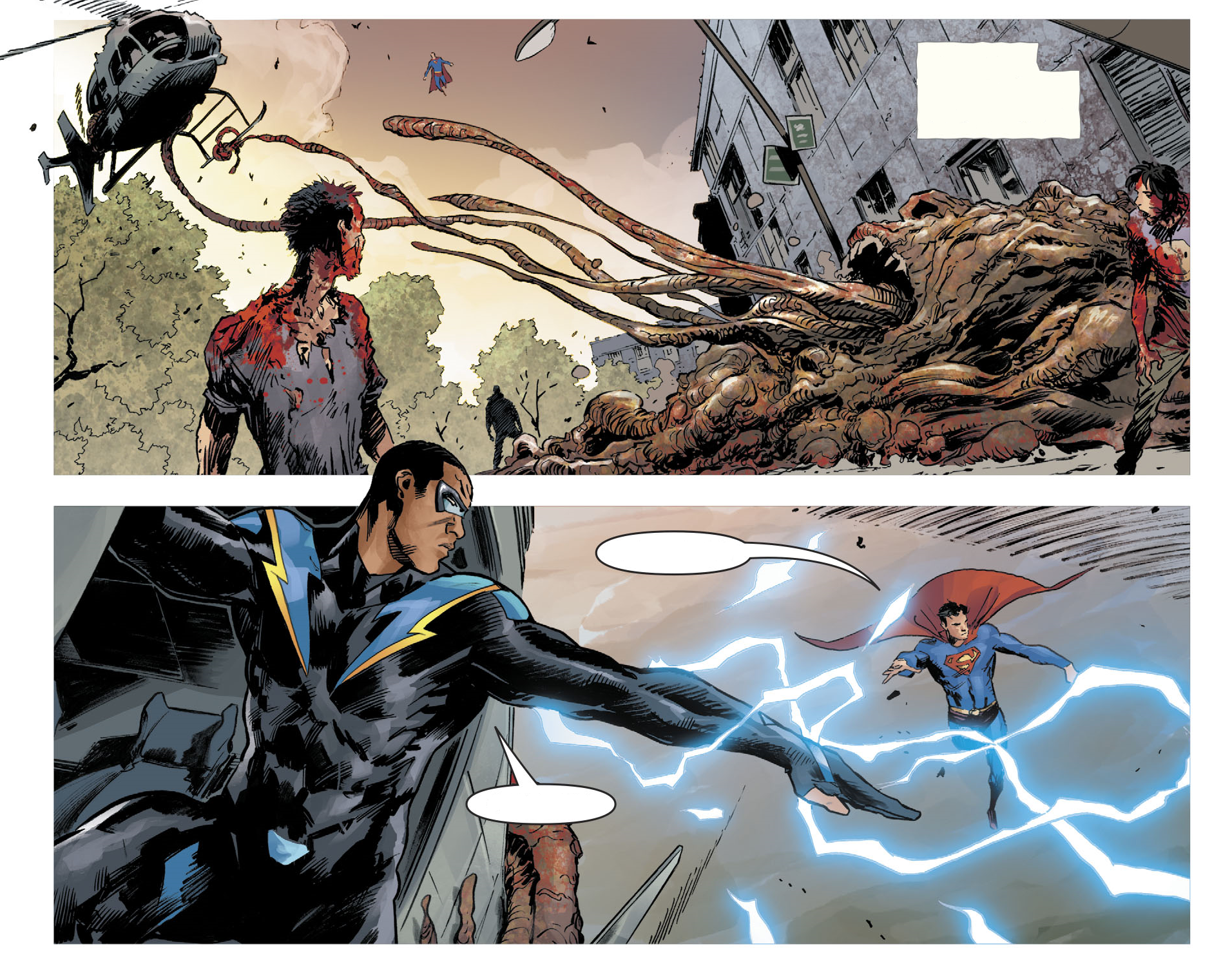 가는 도중에 Black Lightning인 Jefferson이 Clayface와 싸우고 있는 것을 도와줍니다.