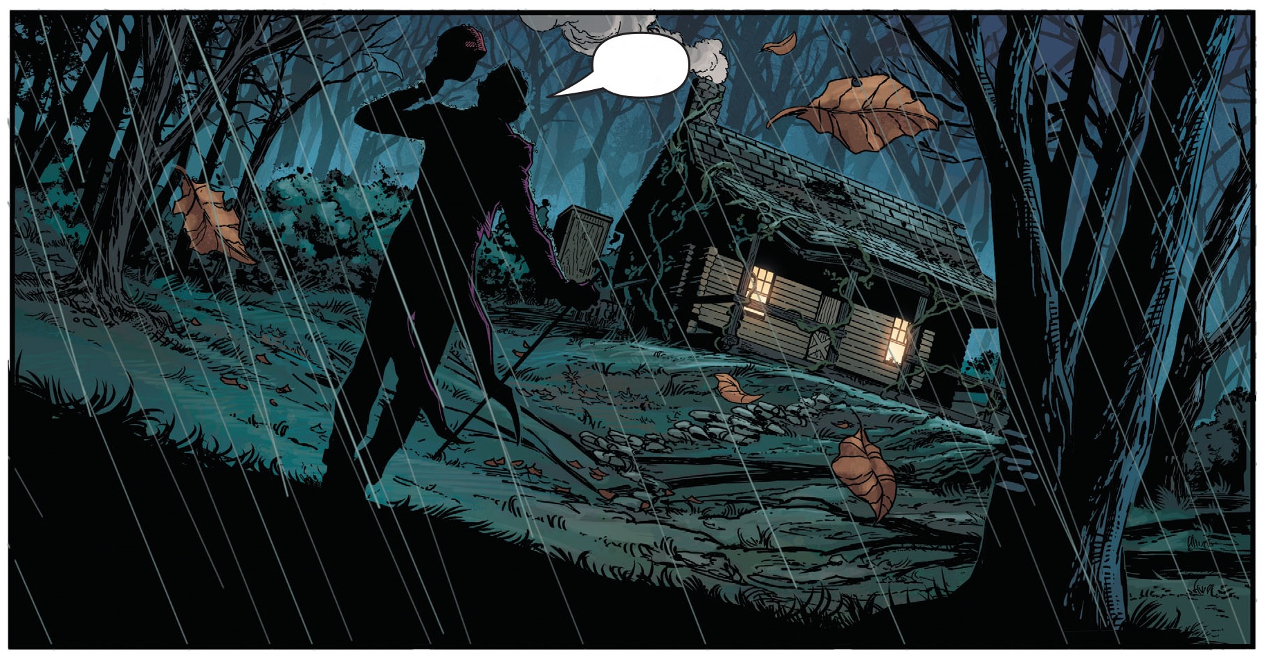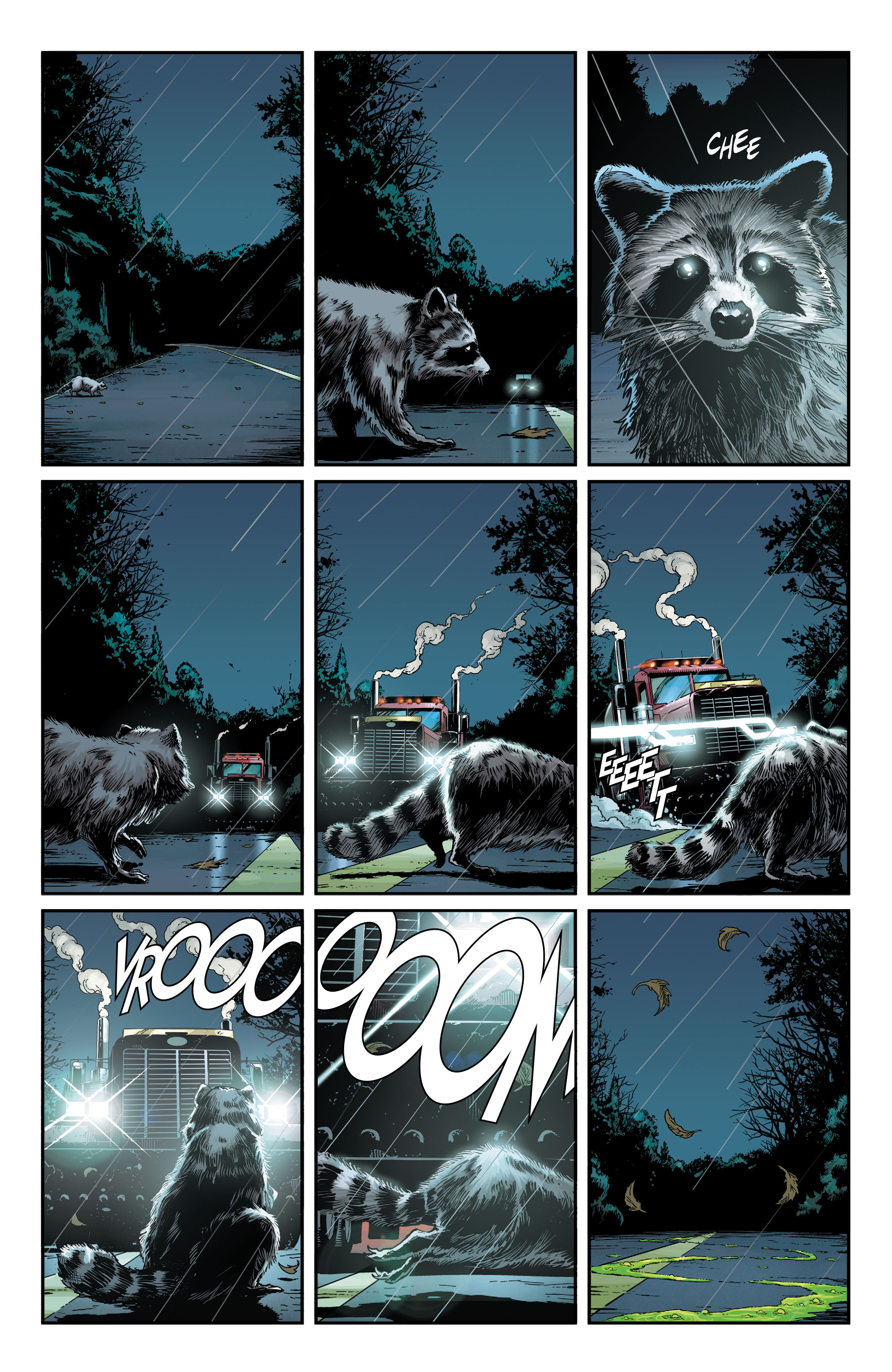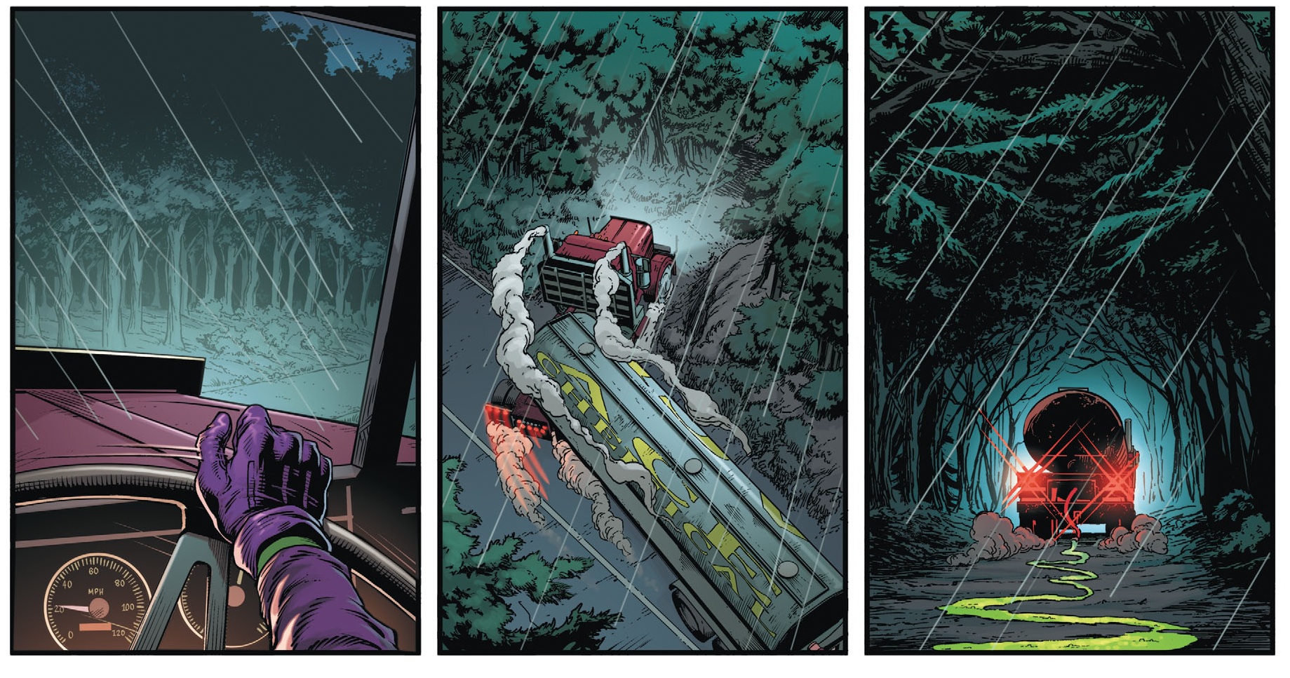 장면은 바뀌어 한적한 도로를 보여줍니다. 그리고 Joker가 운전하는 Ace화학의 차가 화학물질을 방류하면서 한 숲 속으로 들어갑니다. 한동안 숲으로 들어가던 차를 멈추고 Joker는 한 오두막으로 들어갑니다.