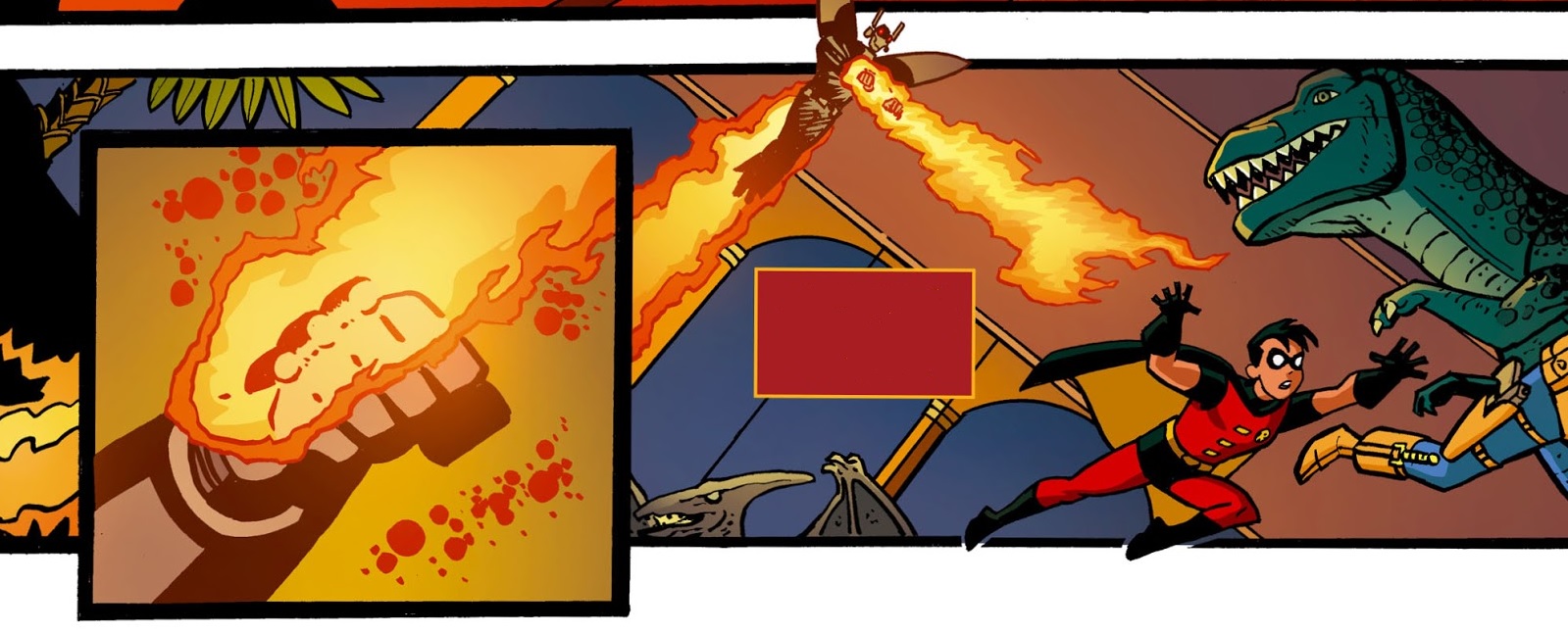 Robin은 Deathstroke를 따라 파충류 박물관으로 들어와서는 Firefly의 공격을 받게 되었습니다.