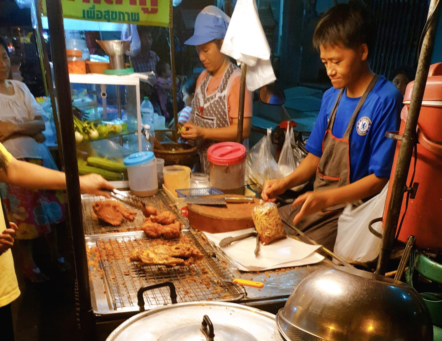 아래 사진에서 보면 앞쪽에서 닭을 튀기고, 뒤쪽에서 솜땀 뿌마(ส้มตำปูม้า)를 만들고 있습니다.