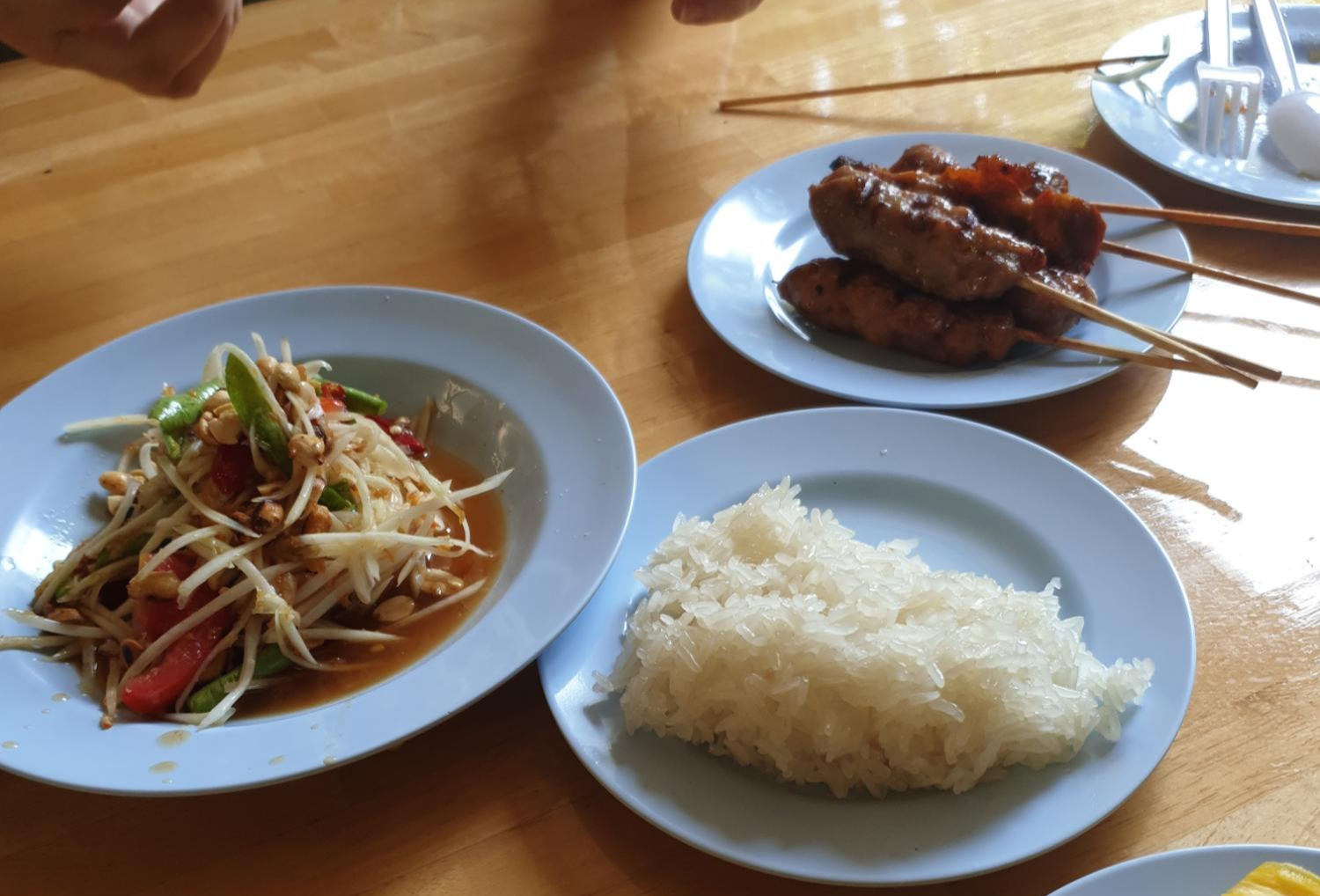 솜땀과 무삥(หมูปิ้ง)(돼지고기 꼬치구이)과 카오니야우(ข้าวเหนียว)(찹쌀밥)을 같이 먹는 것이 일반적(?)이지. ㅋㅋ