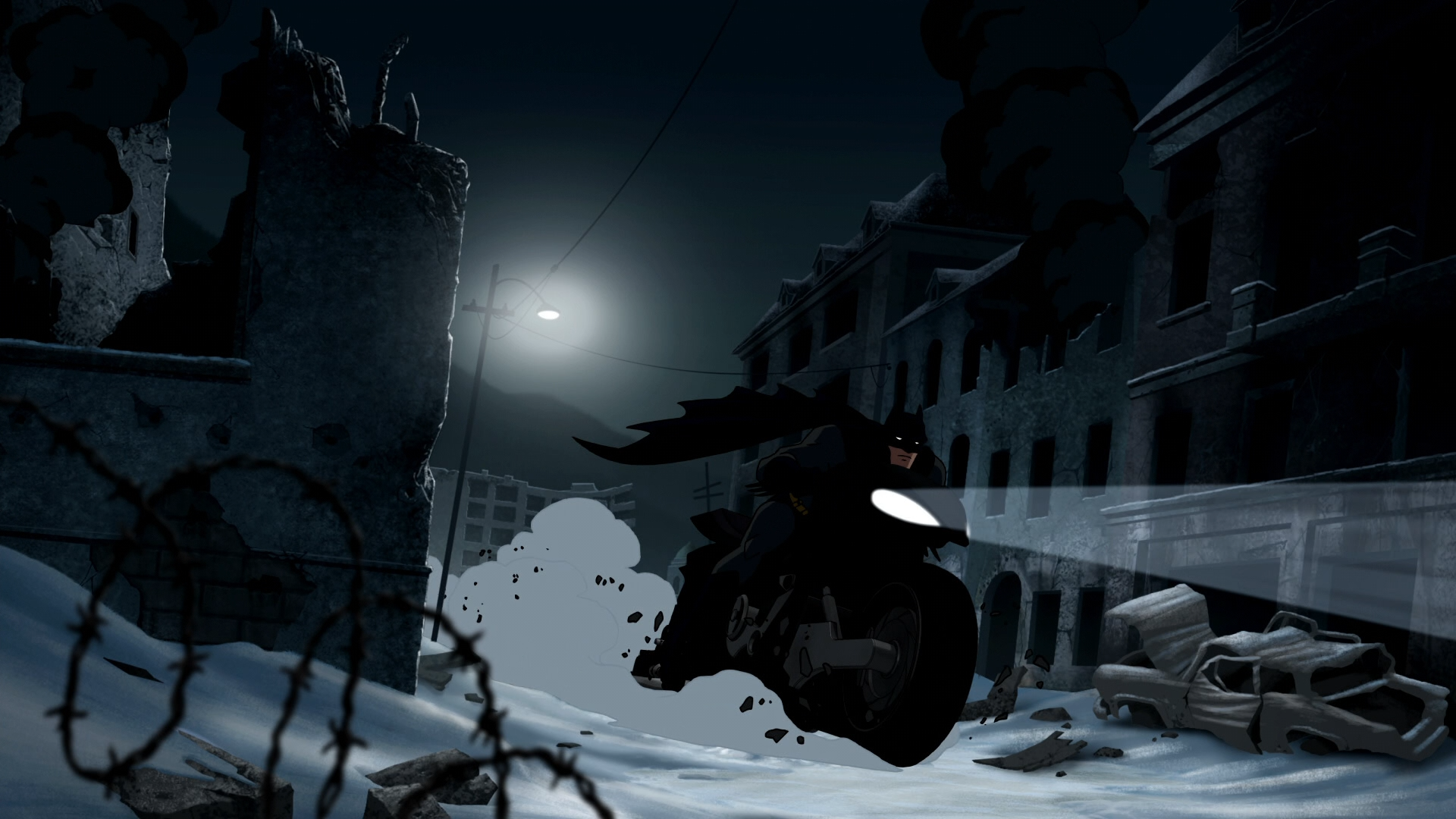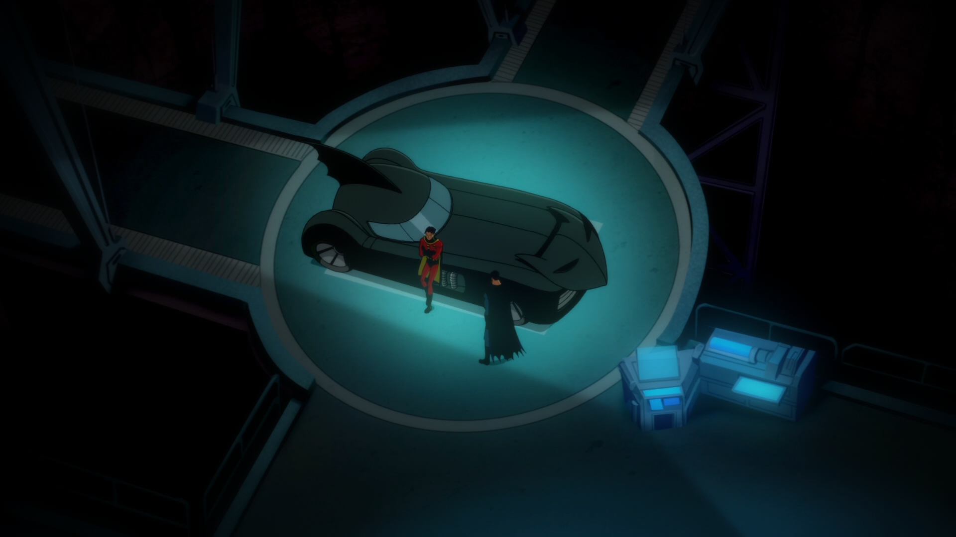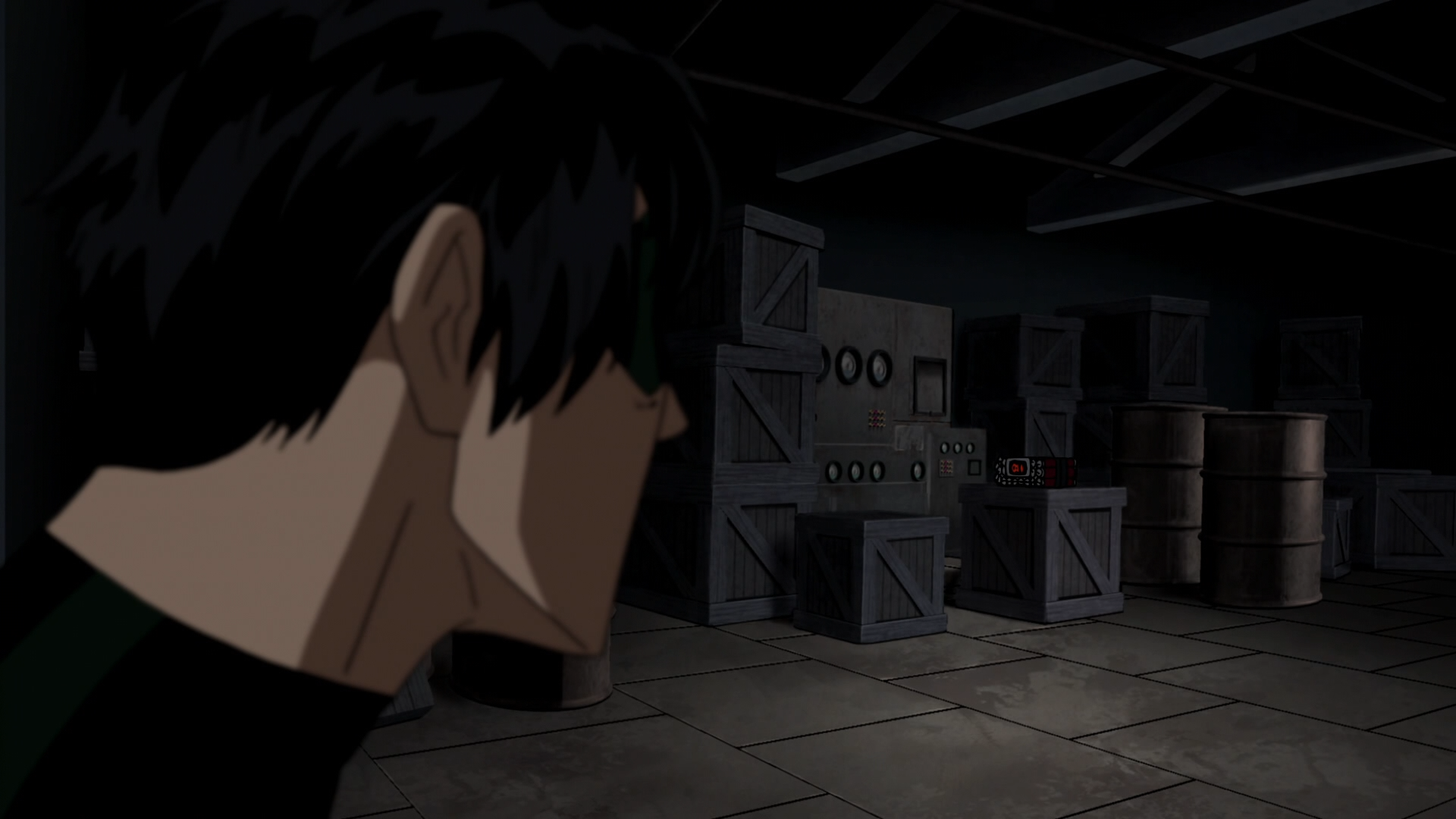 Batman은 트럭을 쫒다가 Robin에게 무슨 일이 생긴 것을 알아차리고 황급히 창고로 돌아갑니다.