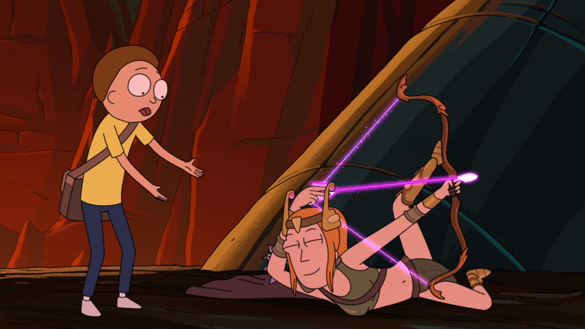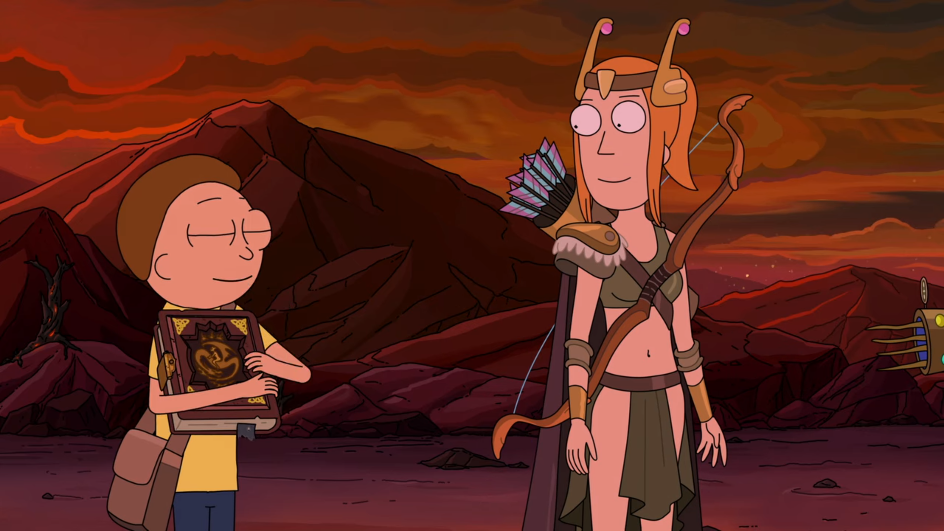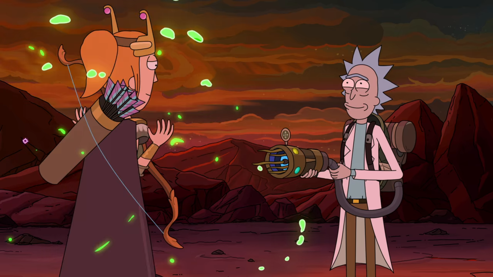 Rick은 암석 괴물을 이용해 마법력이 담긴 총을 만듭니다. 그걸로 Summer가 활 쏘는 섹시 워리어로 되고 싶다고 하자 Rick은 그렇게 만들어 줍니다. Morty에게도 원하는 것 있으면 말하라고 하지만 Morty는 자신은 책이 있다고 하면서 괜찮다고 이야기 하지요.
