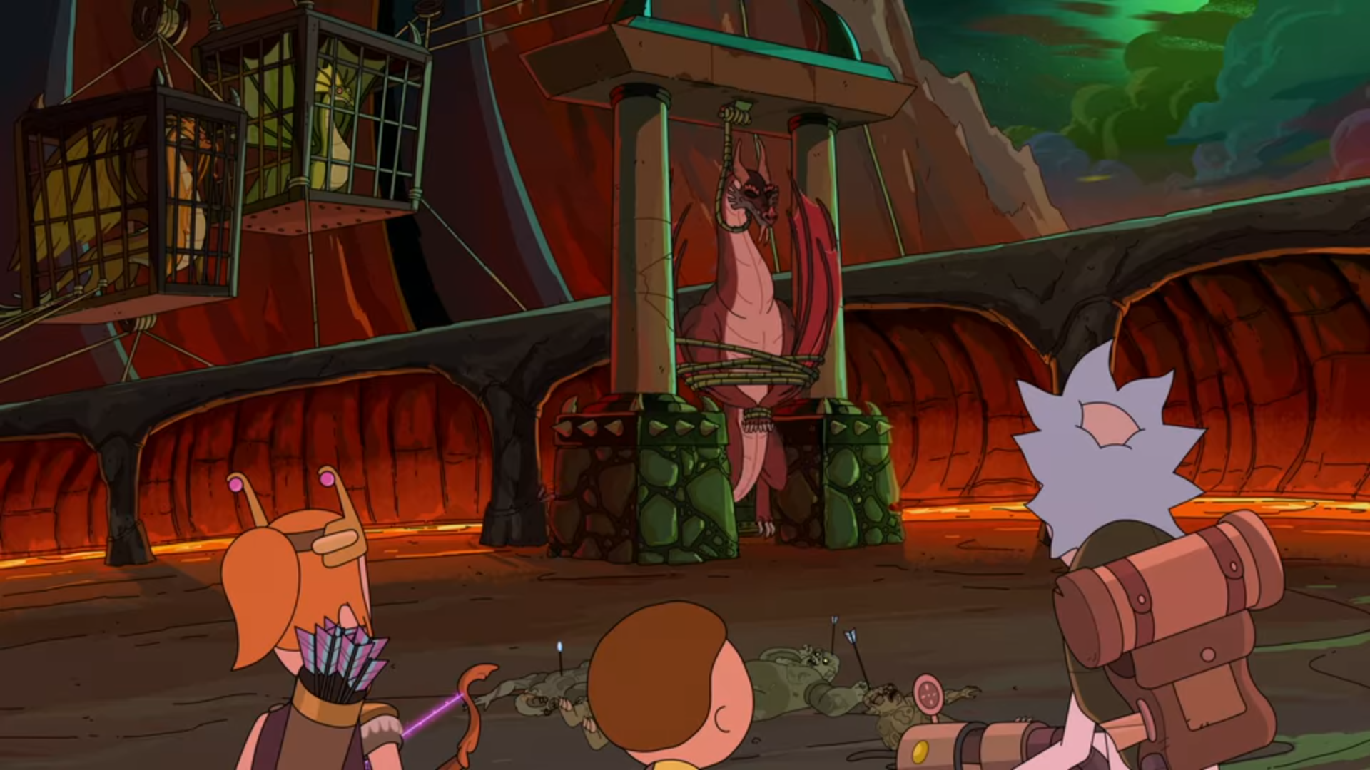 셋은 Balthromaw를 구하기 위해서 마법사의 부하들을 무찌르며 나아갑니다. 그리고 Balthromaw를 발견하고 Summer가 활로 목매단 밧줄을 끊으려 하지만 이상한 자세 때문에 Balthromaw의 눈에 활이 맞고 Rick도 함께 괴로워합니다. 그러자 마법사는 무슨 소란이냐며 나와 Rick의 마법 총을 없애고 Rick을 구타하기 시작합니다. 그러는 동안 Morty와 Summer는 Balthromaw의 밧줄을 끊어서 풀어주죠.