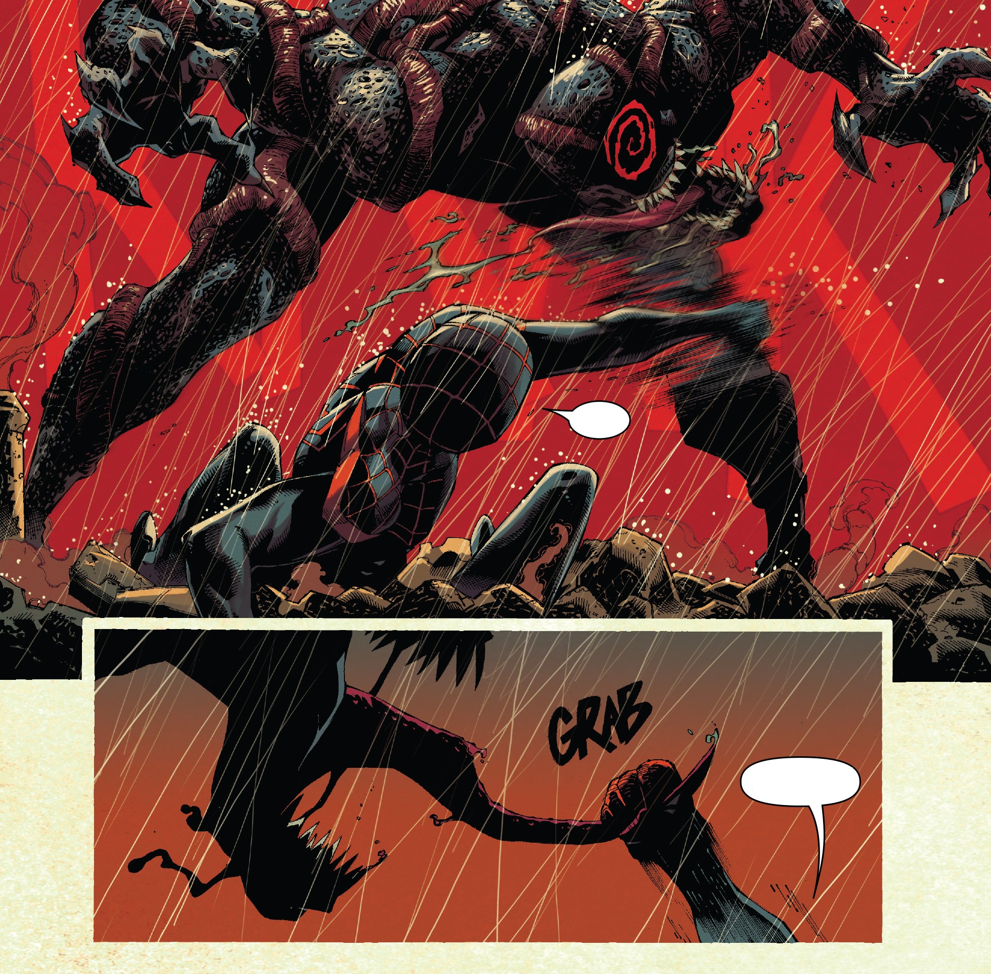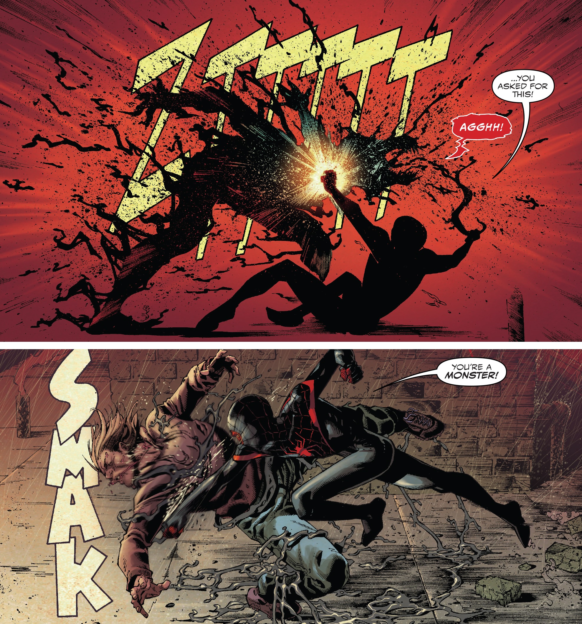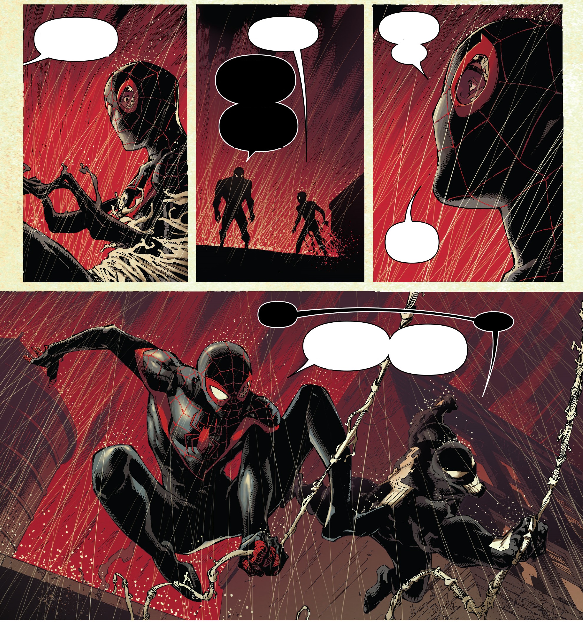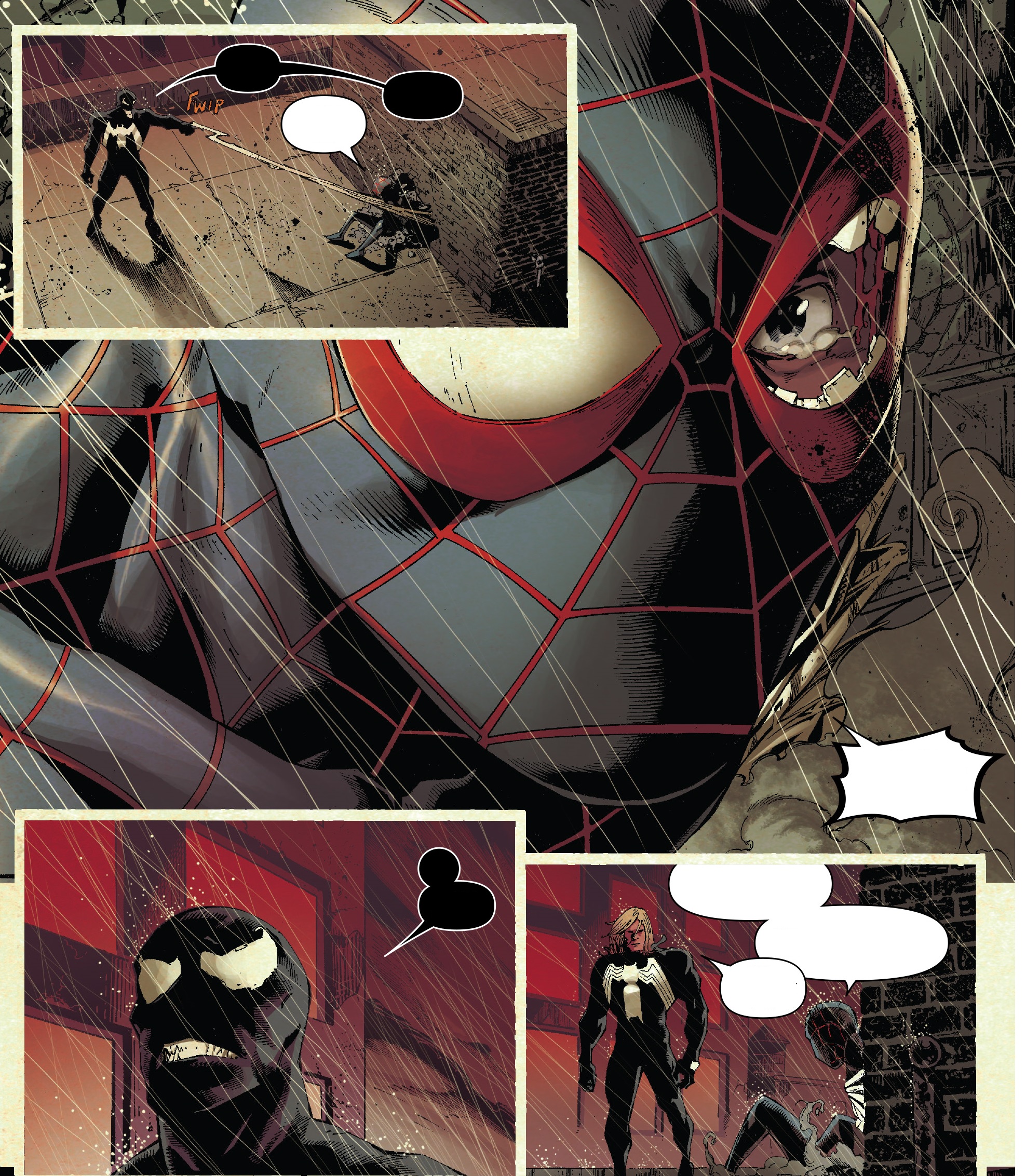 스파이더맨은 Eddie와 Venom이 자신의 가족을 공격해서 다치게 했다고 하면서 Eddie에게 소리칩니다. 하지만 Eddie는 그런 일은 없었다고 하면서 스파이더맨에게 자신을 소개합니다. 그러면서 지금은 그것보다는 괴물이 있으니 같이 괴물을 해치우고 스파이더맨의 가족들을 자신이 해쳤다면 벌을 받겠다고 스파이더맨을 회유합니다.