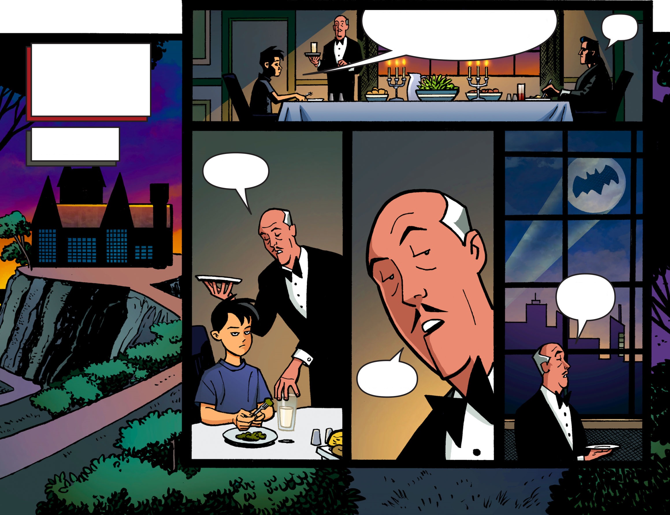 장면은 Bruce와 Tim이 저녁을 먹고 있는 곳으로 갑니다. Tim은 외출금지를 당했지만 Bruce에게 영화를 보러 가자고 합니다. 하지만 Bruce는 안된다고 하지요. 그러자 Tim은 그건 Robin이고 자신은 용맹스럽게 기하학 시험을 통과했으니 괜찮다고 합니다. 하지만 Bruce는 안된다고 합니다. ㅋㅋㅋ