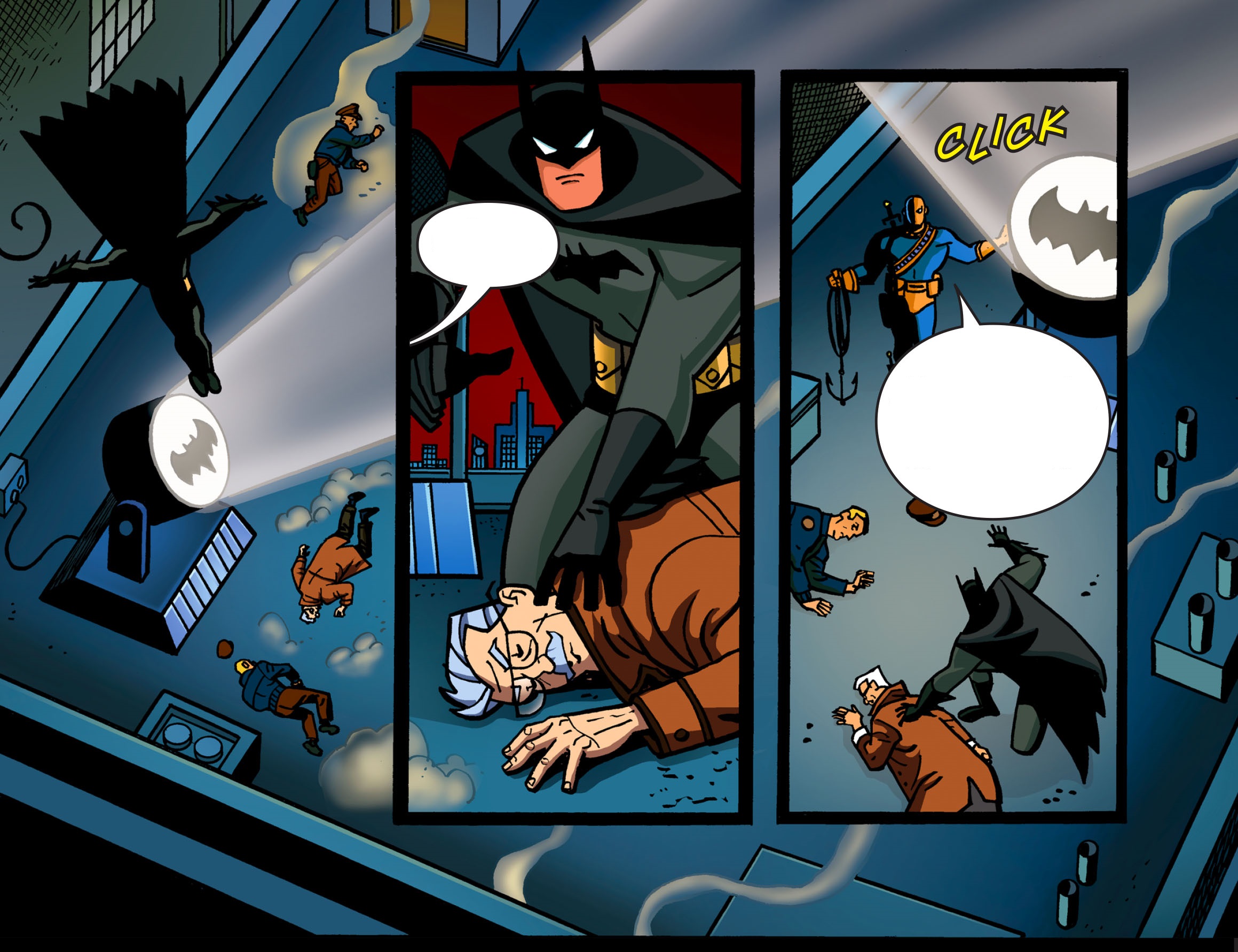 Deathstroke는 나타나면서 그들이 Bat 시그널을 빌려주지 않아서 기절시켰다고 이야기합니다. Batman은 Firefly의 행방을 묻지만 Deathstroke는 자신의 먹잇감이라고 하면서 자신이 잡을 것이라고 하고 원하면 따라오라고 합니다.