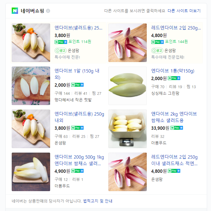 우선 엔다이브는 가장 가격이 싸다.... 다만 일반 시장이나 마트에서는 없다는 게 문제 그리고 일반 알배추 보다 가격이 좀 있는 편이다.
