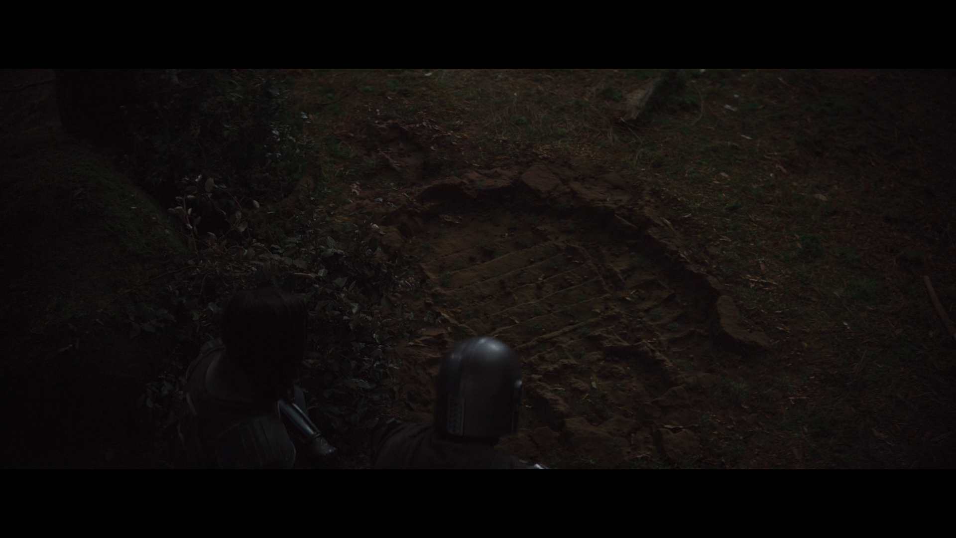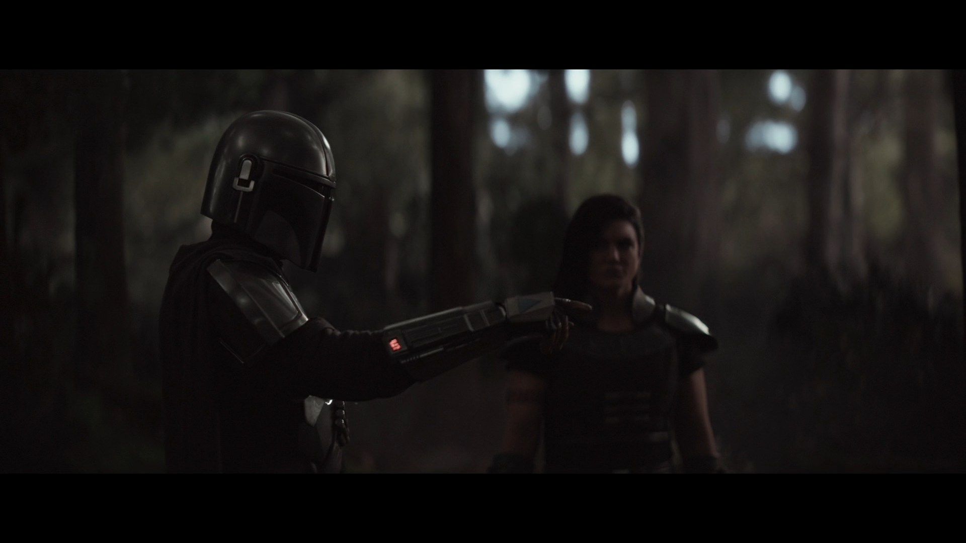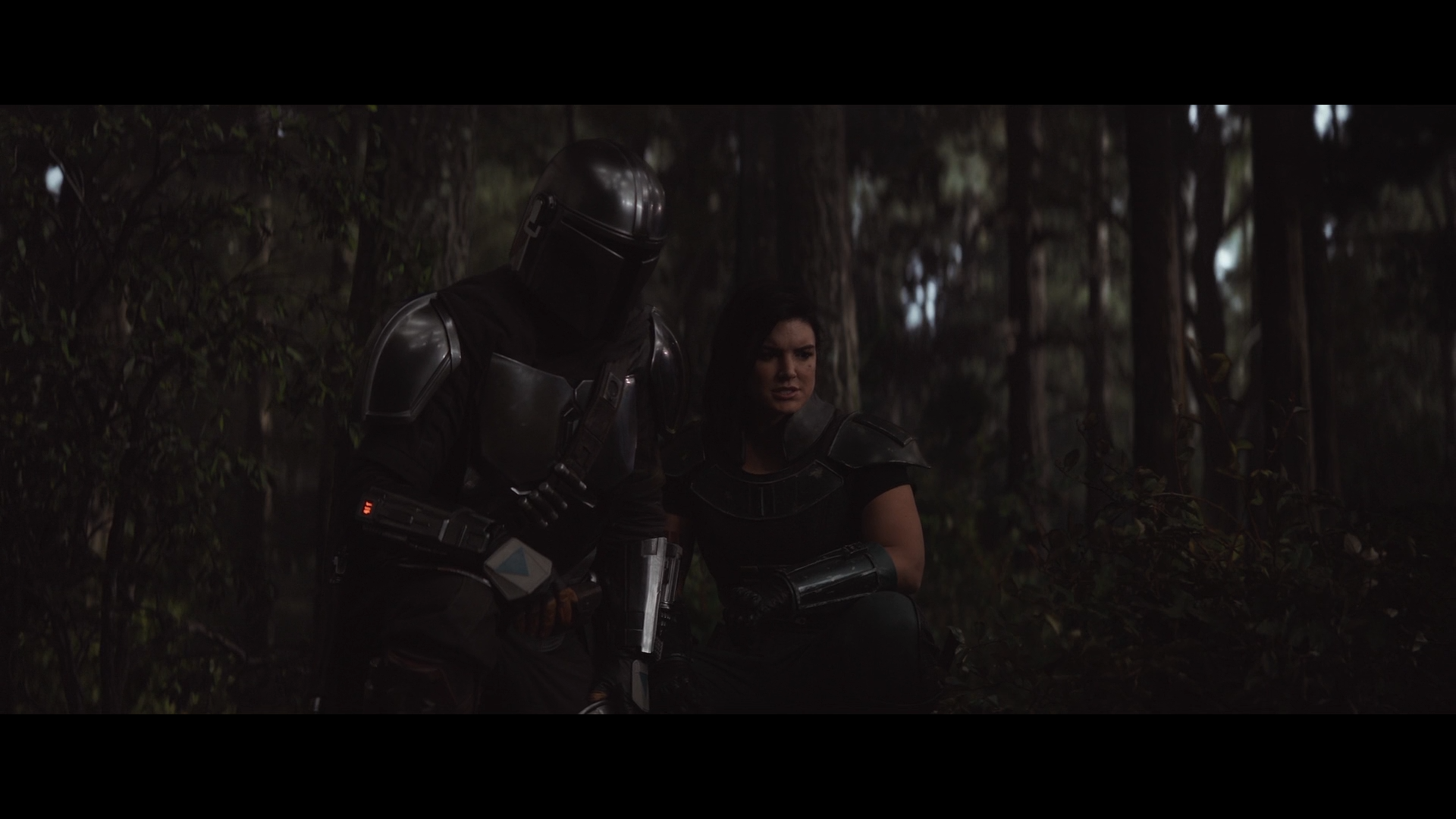 The Mandalorian과 Cara Dune은 맡겨진 임무를 하기 위해서 강도단의 흔적을 숲 속에서 살펴보고 있습니다.