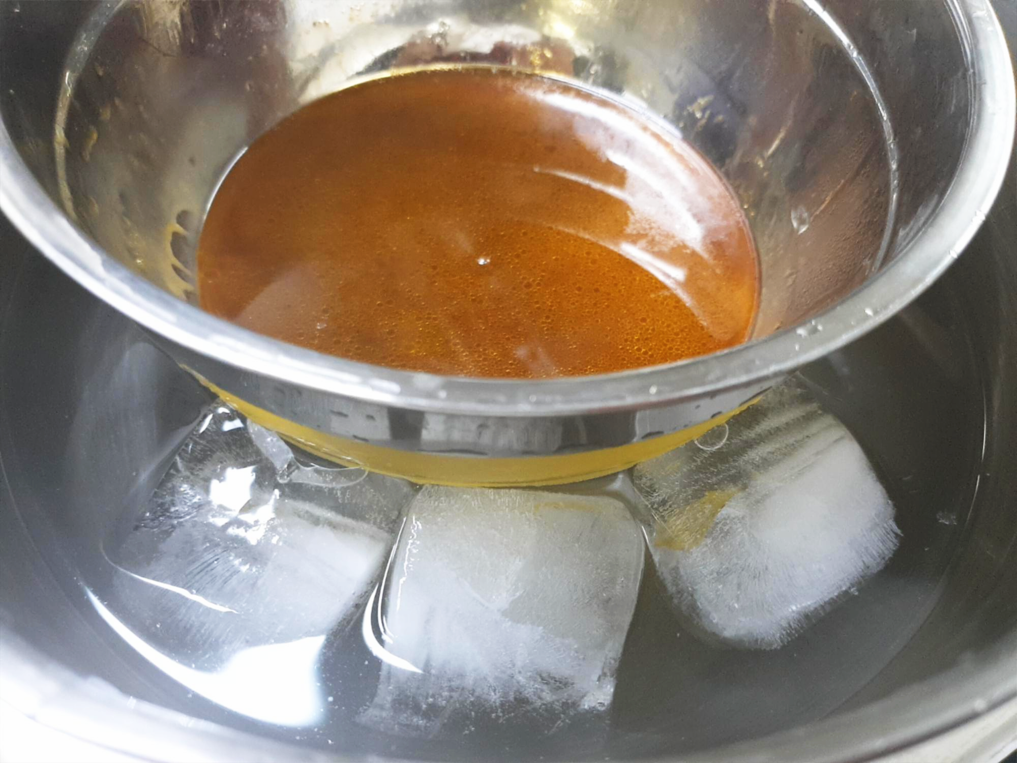 그리고 체에 한번 더 걸러서 얼음물에 빠르게 식혀 줍니다.